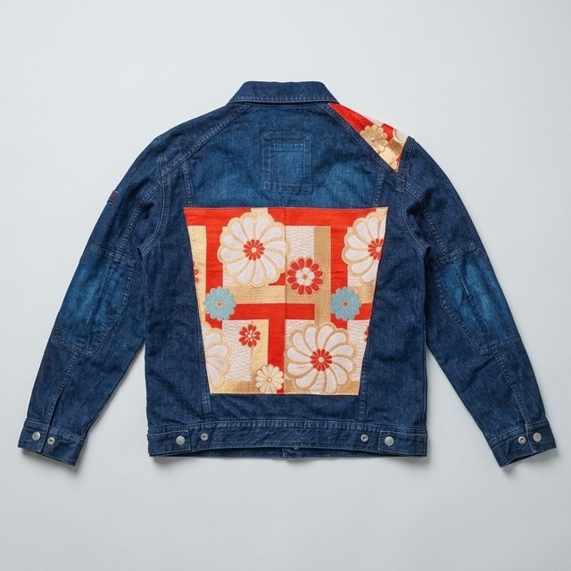 【一点ものです】 なくなり次第、販売終了になりますのでご了承ください。 鮮やかな朱色と気品漂うシルバーの帯を大胆にパッチワークした、一点物のリメイクデニムジャケットです。 古着ならではの味のあるデニム生地に、和の意匠を加えて現代のストリートスタイルに溶け込むモダンなデザインに仕上げました。 背面に配置された帯の文様は、六角形の幾何学模様や流れるようなゴールドのラインが特徴的で、バックスタイルを華やかに演出します。カジュアルなデニムに伝統的なシルクの質感が加わることで、存在感を放ちます。 定番のシルエットなので、パンツスタイルにはもちろん、ロングスカートとの相性も抜群です。自分だけの個性を大切にする方や、サステナブルなファッションを楽しみたい方におすすめの一着です。 ■サイズ 丈 64cm 身幅 54cm 袖丈 64cm (平置き採寸のため、多少の誤差はご了承ください) ■素材 ジャケット: デニム(コットン) パッチ部分: 帯(シルク) ■お洗濯について 帯の部分はデリケートなため、クリーニング店での相談をお勧めします。 ご自宅でケアする場合は、おしゃれ着用洗剤を使用し、汚れた部分を優しく押し洗いしてください。 デニムの色落ちや帯の色移りを防ぐため、単独で洗ってください。 乾燥機の使用は避けてください。 ■注意事項 • 1点ものです。 • 古着のリメイク品のため、デニム特有の擦れや色落ちがある場合がございます。ヴィンテージの風合いとしてお楽しみください。 • 不良品以外の返品・交換は致しかねますので予めご了承ください。 • 商品の色味はお使いのモニターにより多少異なる場合がございますのでご了承の上ご購入お願いします。 • 梱包には十分に注意をしてお届け致しますが、配送中の事故(紛失・破損・未着・盗難・遅延)が発生した場合の返金・返品、また新たな商品の再送はお受けする事が出来ませんのでご了承下さい。 お洋服は1点1点丁寧に、東京のアトリエにて製作しております。この商品に関して、すそ上げなどの簡単なお直しを受け付けております。また、カスタムオーダーも大歓迎です。ご質問等お気軽にご連絡ください。 新作2026、着物リメイク、帯リメイク、デニムジャケット、ジージャン、パッチワーク、和モダン、ヴィンテージリメイク、アップサイクル、サステイナブル、一点もの、エシカルファッション、和風、日本、VivatVeritas、ビバベリタス、Kimono Remake, Obi Remake, Denim Jacket, Upcycled Denim, Japanese Vintage, Patchwork Jacket, Sustainable Fashion, One of a kind, Artisan, Tokyo 2026 Vivat Veritas®︎