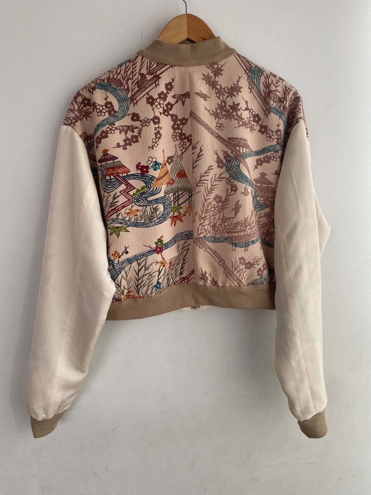 参考までに、写真のブルゾンは、丈50cm、袖丈65cm、見頃幅60cmです。