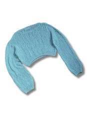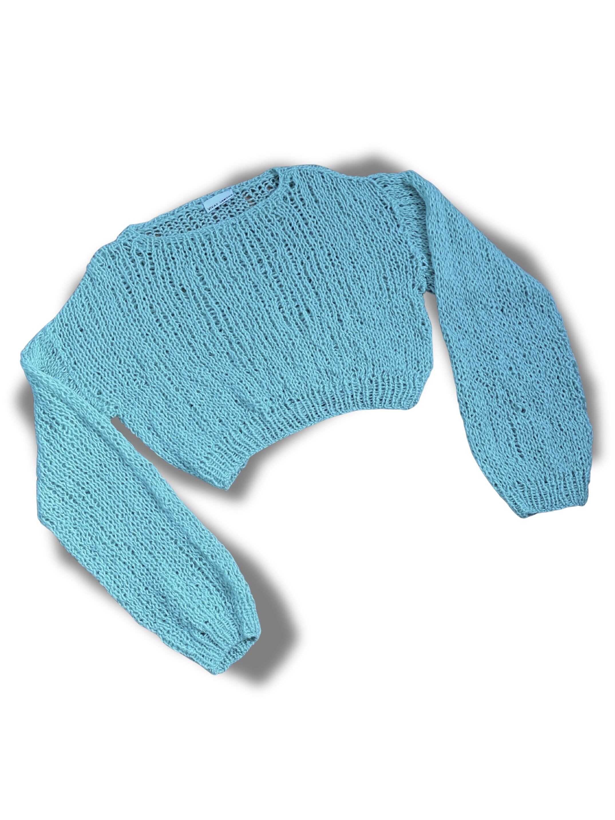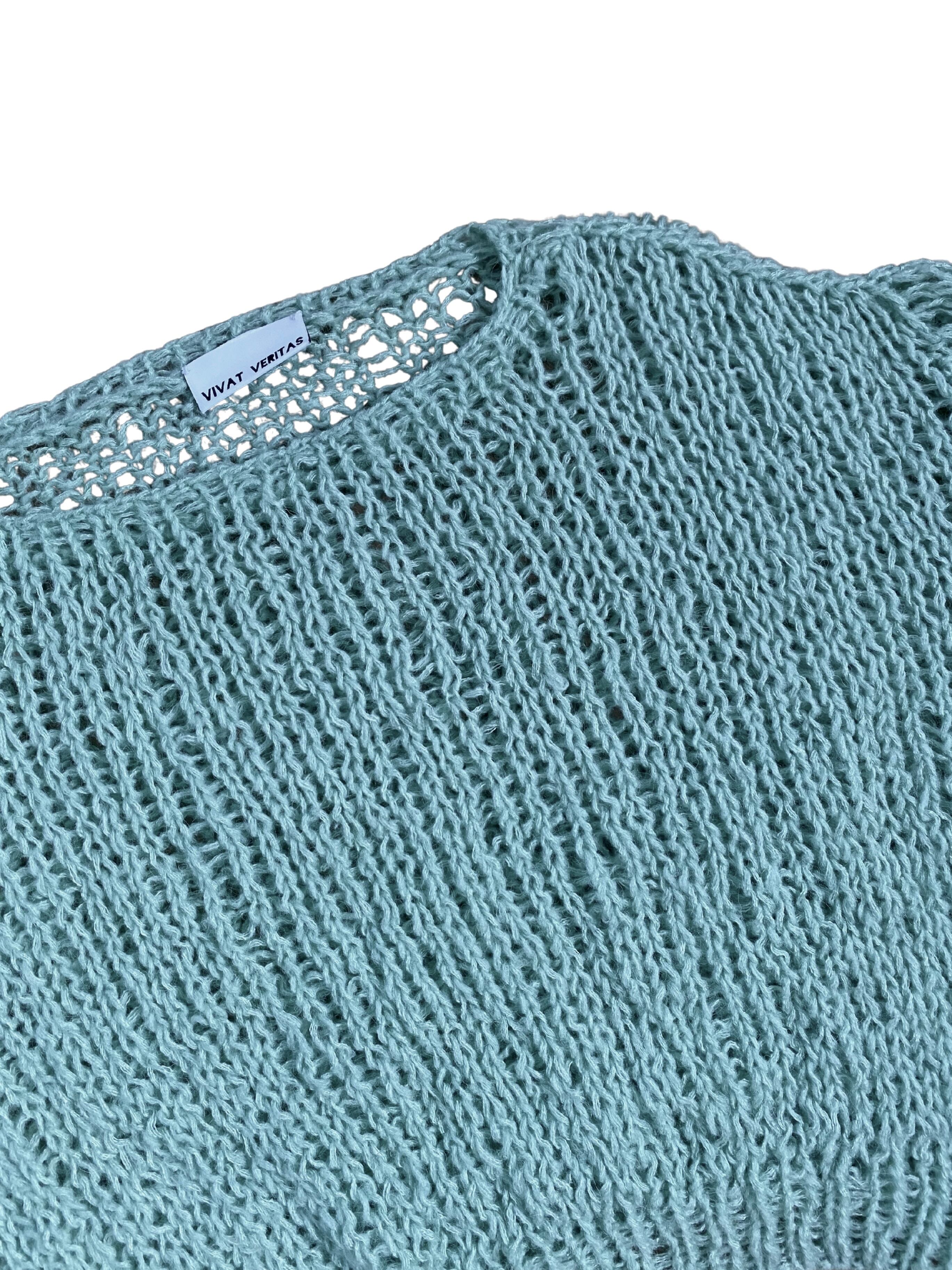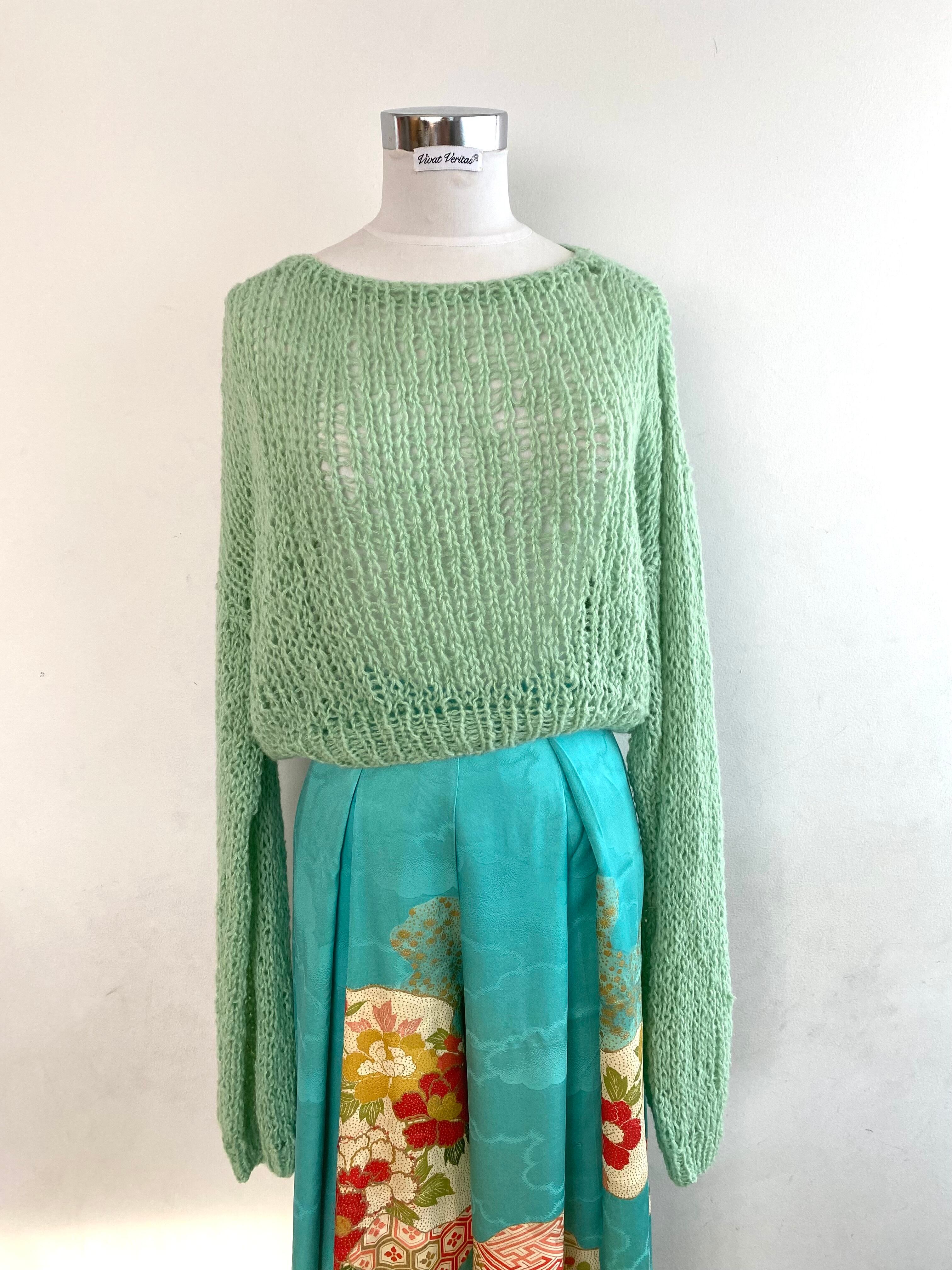 モヘア、ニット、手編み、ハンドメイド、長め袖、バルーンスリーブ、クロップ、丸首、長袖、ビバベリタス、vivat Veritas、ローゲージ、穴あきニット、萌え袖、ミックスニット、グリーン、緑、ツートーン、シースルーニット、春の早割