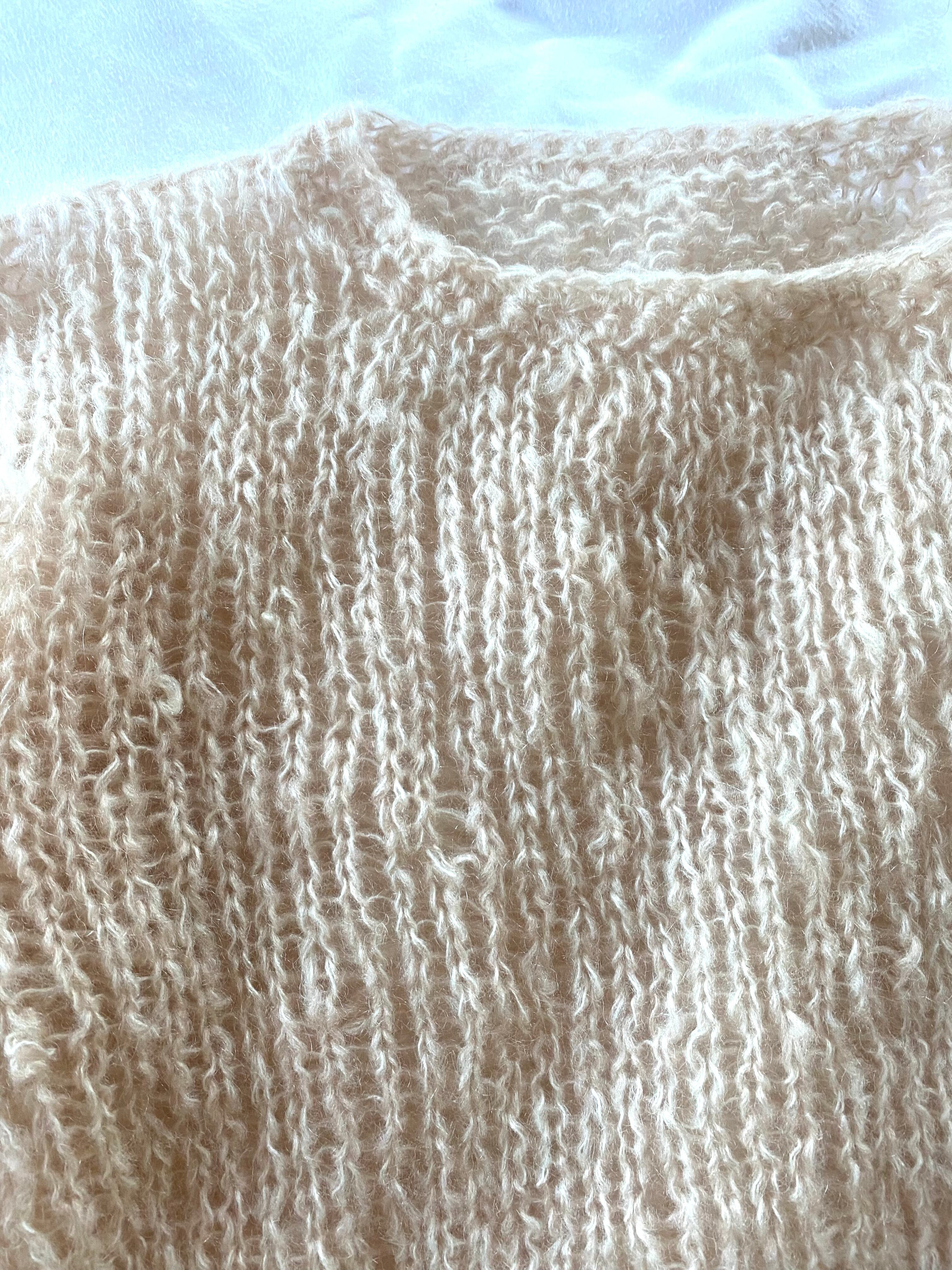 素材は古着のモヘアニットを解き、一度洗濯した上で毛糸として巻き直して使用しています。毛玉がある箇所がございますが、アップサイクル品としてご利用頂けますと幸いです。