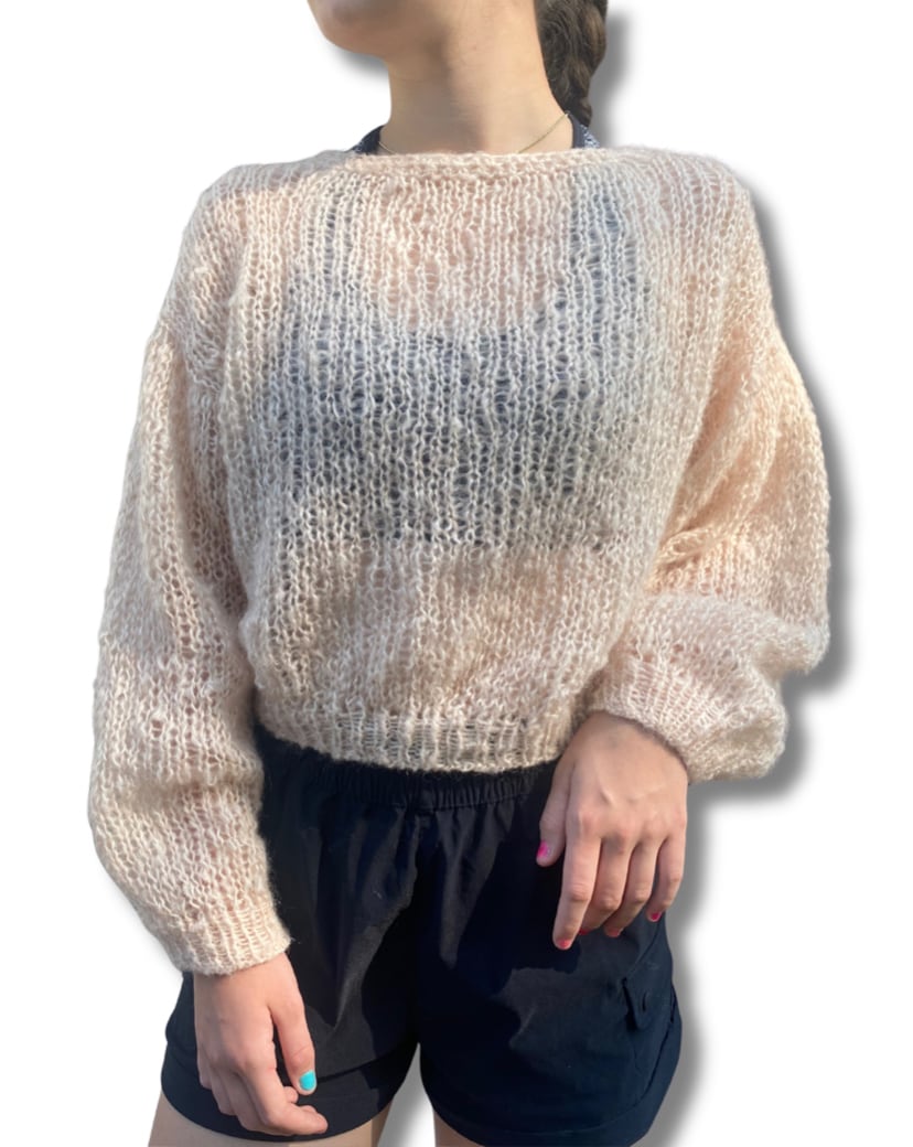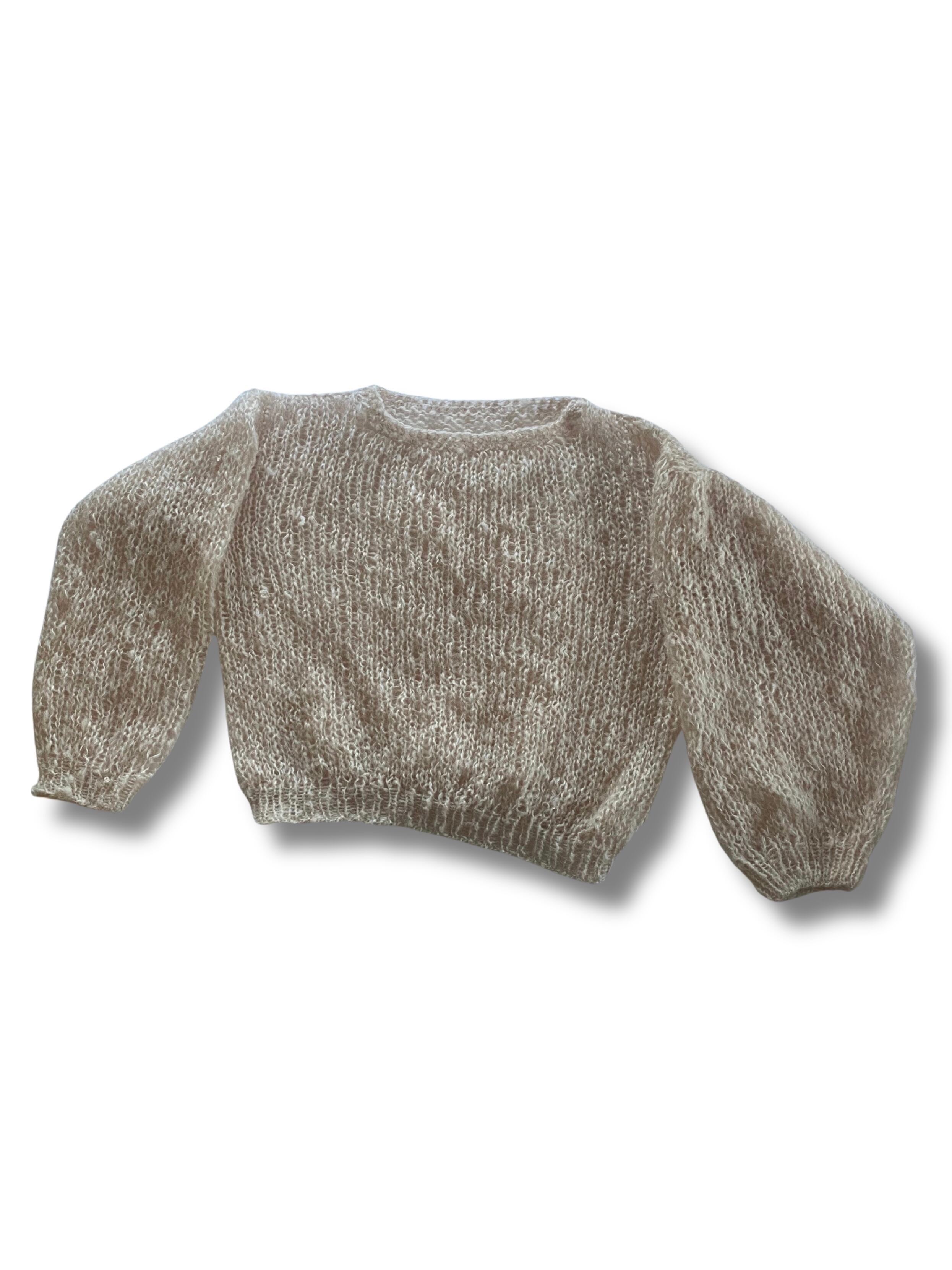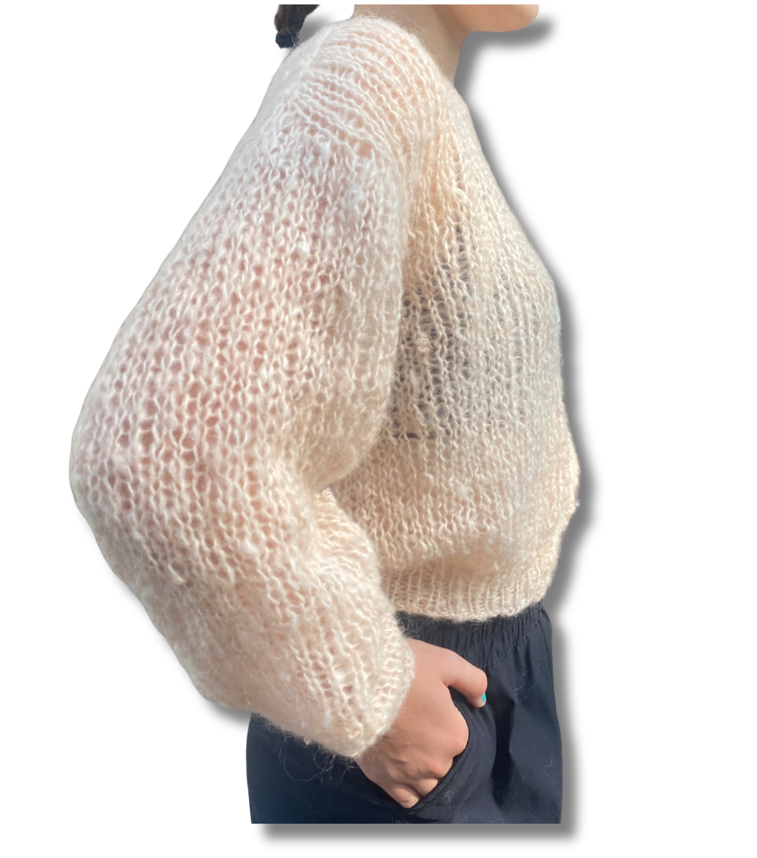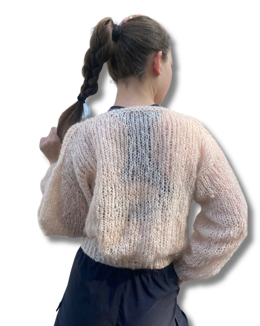 モヘア、ニット、手編み、ハンドメイド、長め袖、バルーンスリーブ、クロップ、丸首、長袖、ビバベリタス、vivat Veritas、ローゲージ、穴あきニット、萌え袖、ミックスニット、シースルーニット、春の早割、ホワイト、クリーム、ニュートラルカラー