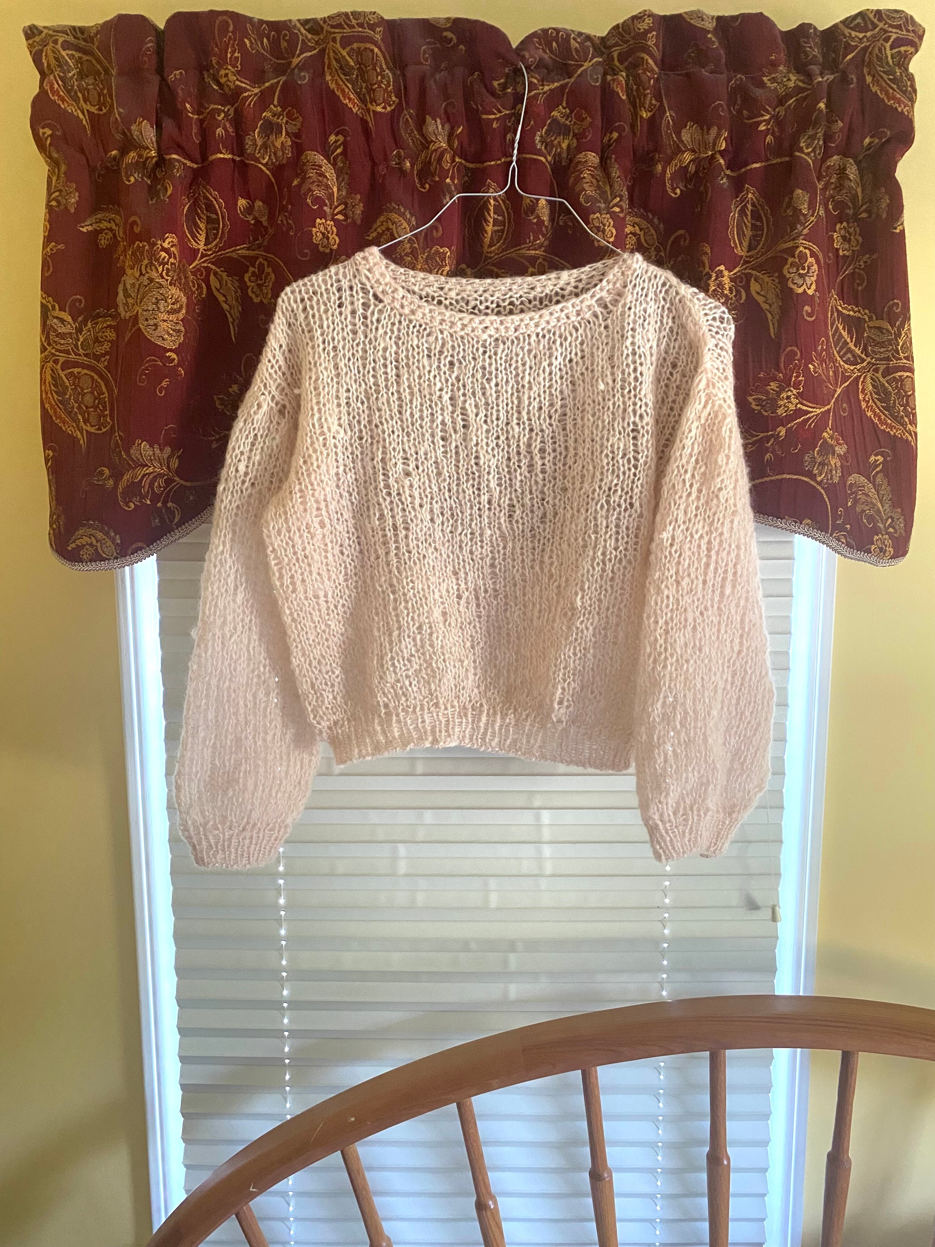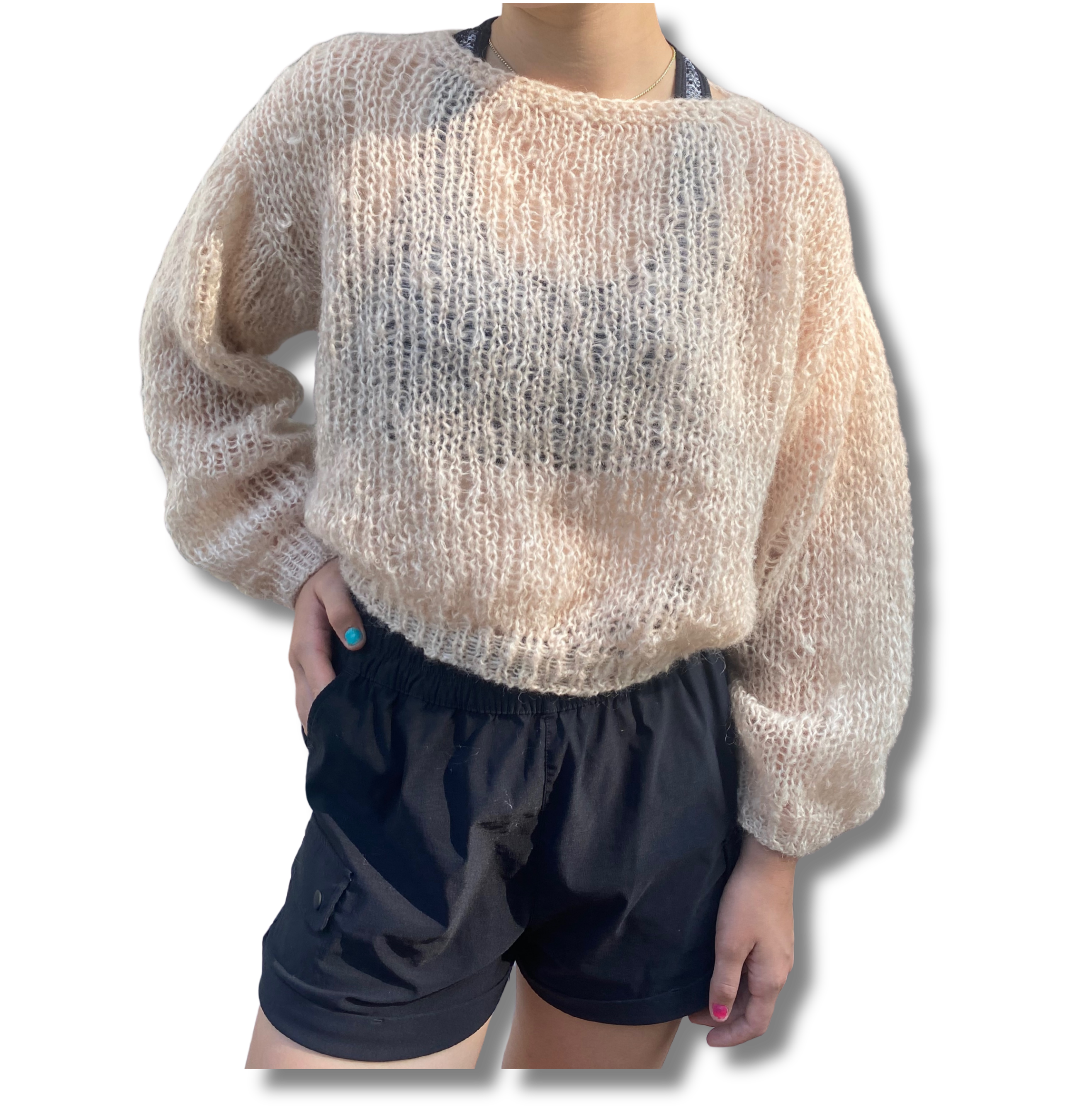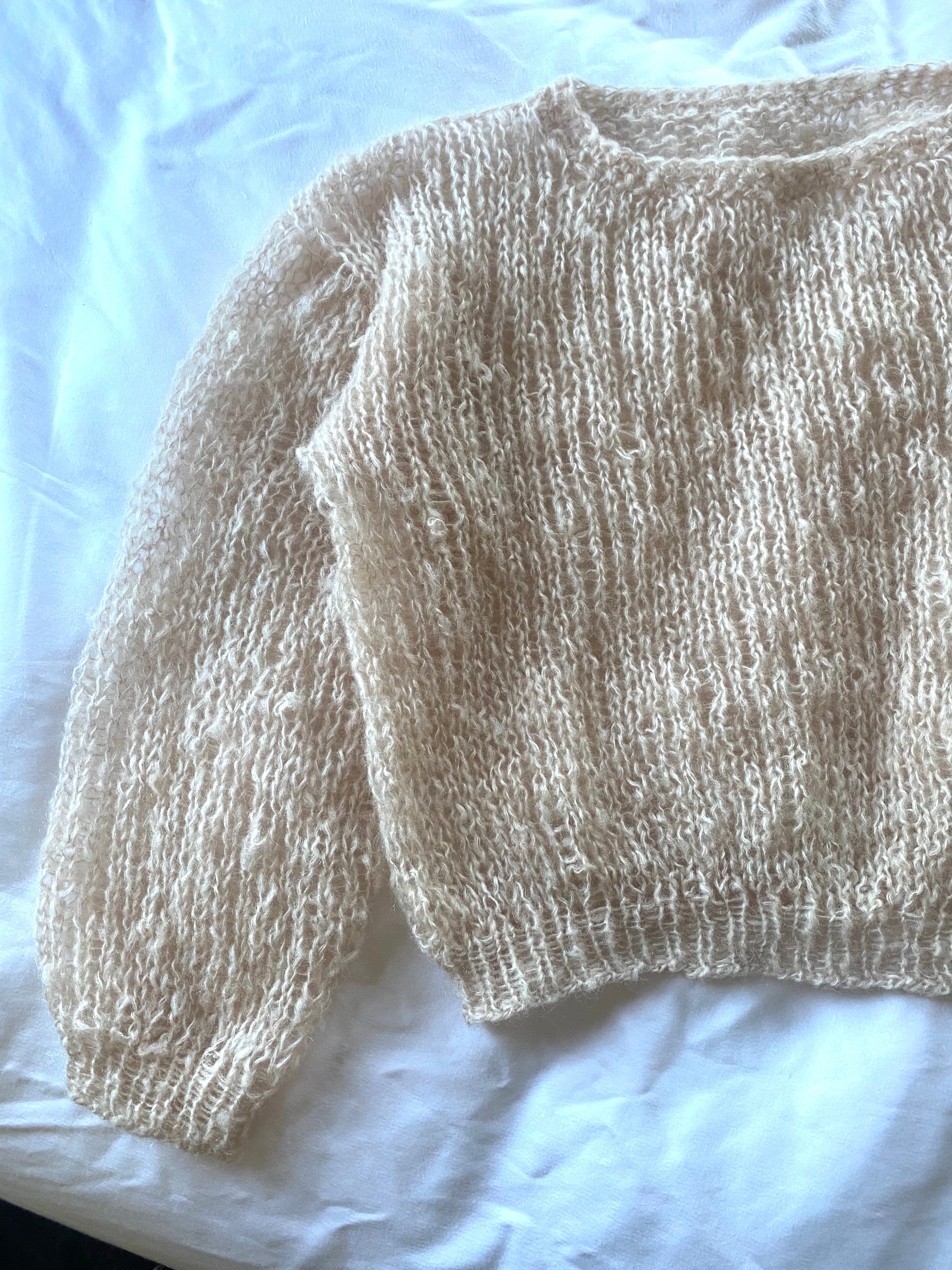 モヘア、ニット、手編み、ハンドメイド、長め袖、バルーンスリーブ、クロップ、丸首、長袖、ビバベリタス、vivat Veritas、ローゲージ、穴あきニット、萌え袖、ミックスニット、シースルーニット、春の早割、ホワイト、クリーム、ニュートラルカラー