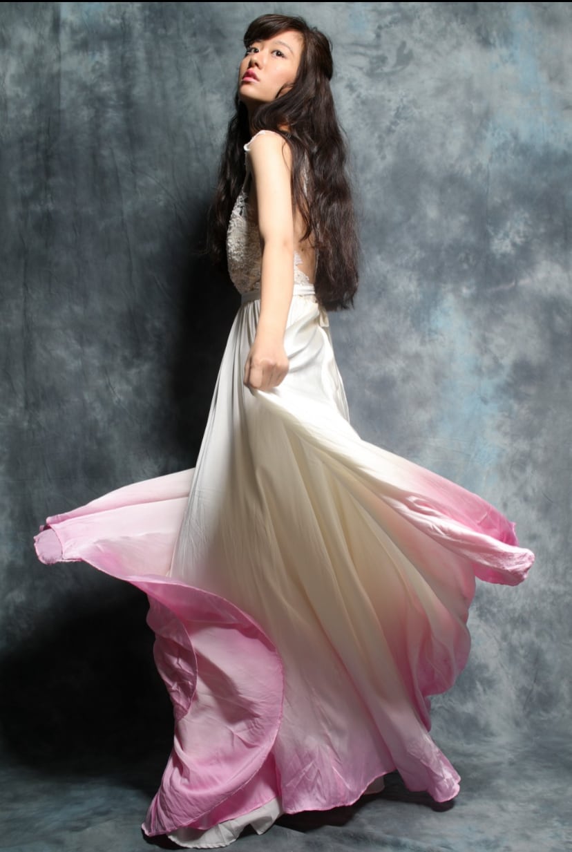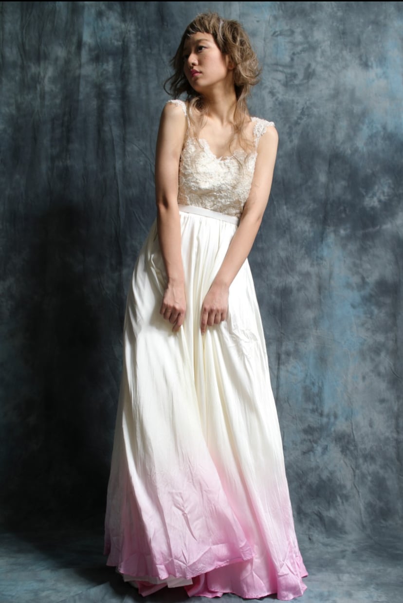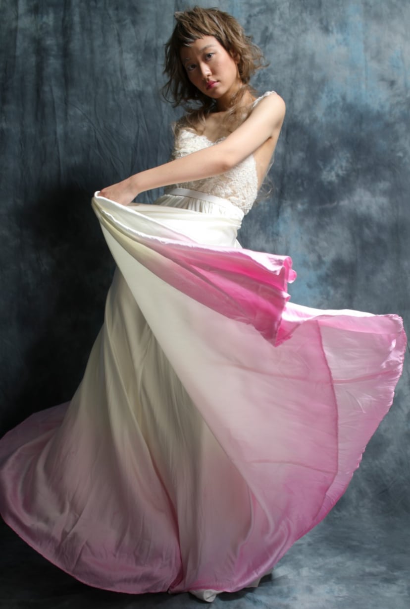 バラの花びらの繊細な色味を、シルクのスカートの裾をグラデーション染めで表現しました。