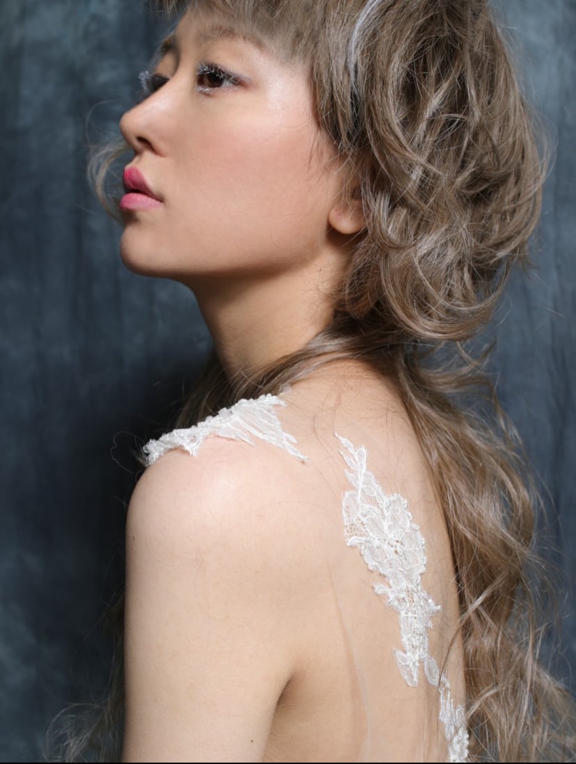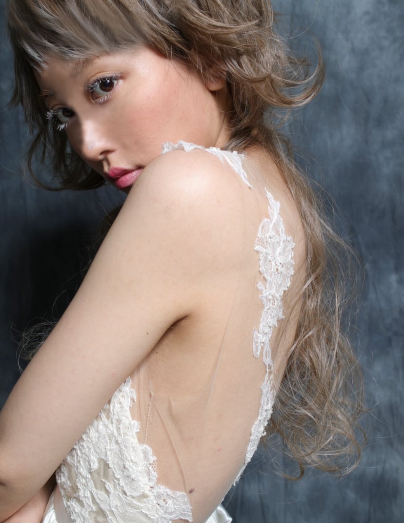 シルク、フランス製レース、シャンティレース、染料、チュール、ポリエステル(裏地部分)ビーズ、コンシールジッパー、ボーン、ブラカップ