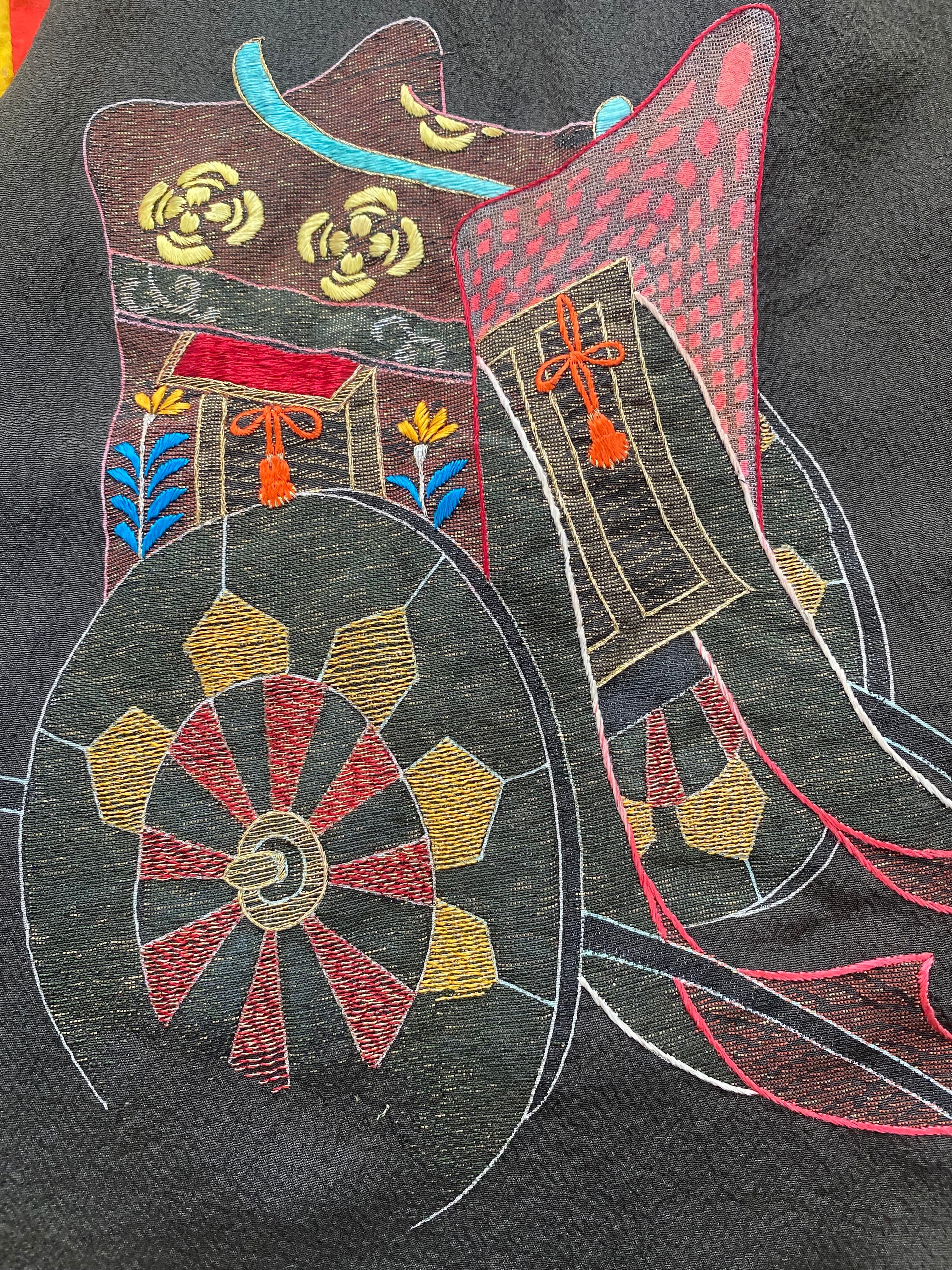 前身頃のには、御所車(ごしょぐるま)の豪華な刺繍が施されており、モダンなベストに格調高いアクセントを加えています。