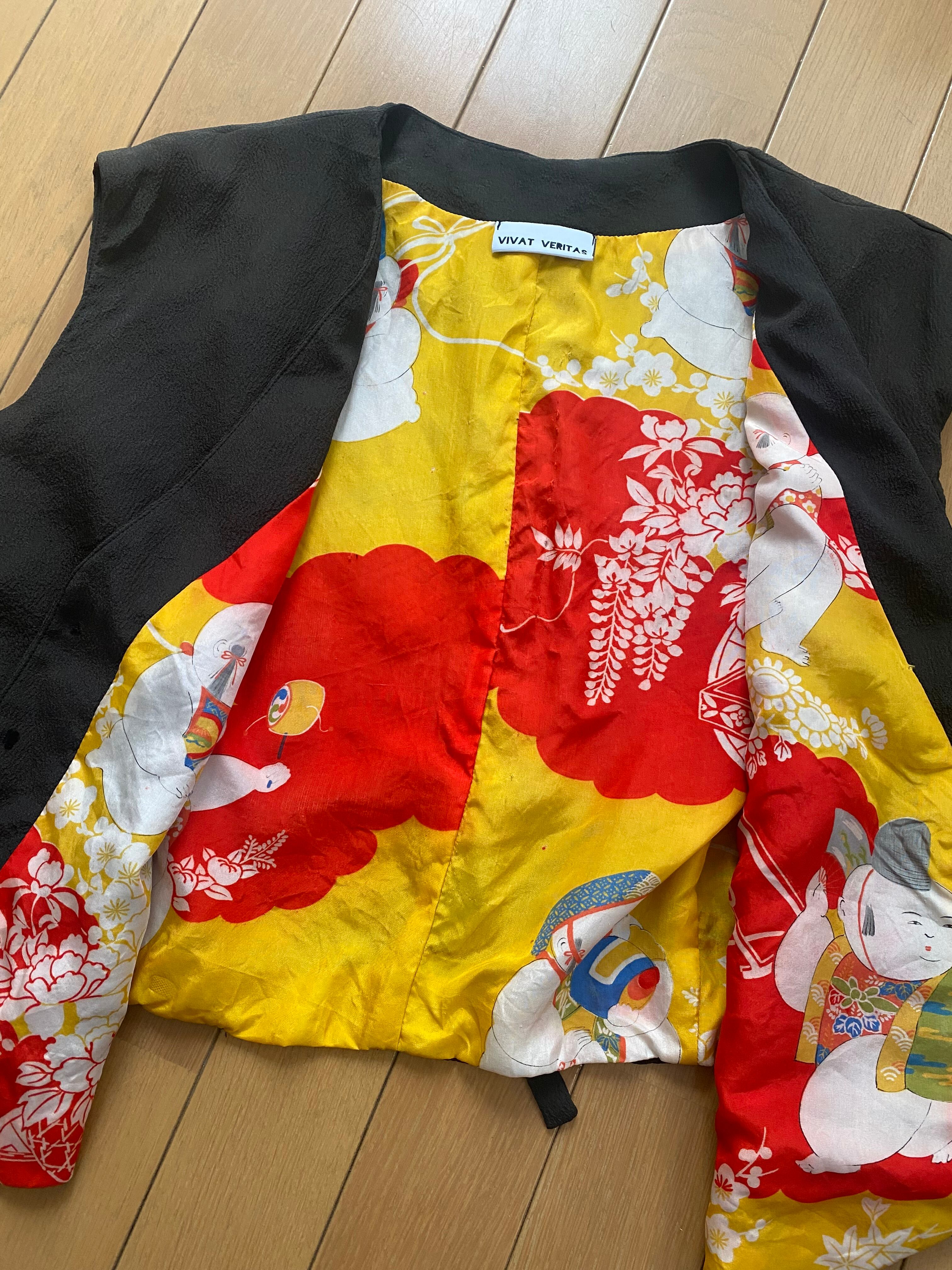 黄色と赤を基調とし、愛らしい小僧や、藤の花、そして縁起の良い雲文様などの古典的な文様が生き生きと描かれています。脱いだ時や前を開けた時に、インパクトを残す一点もののデザイン。