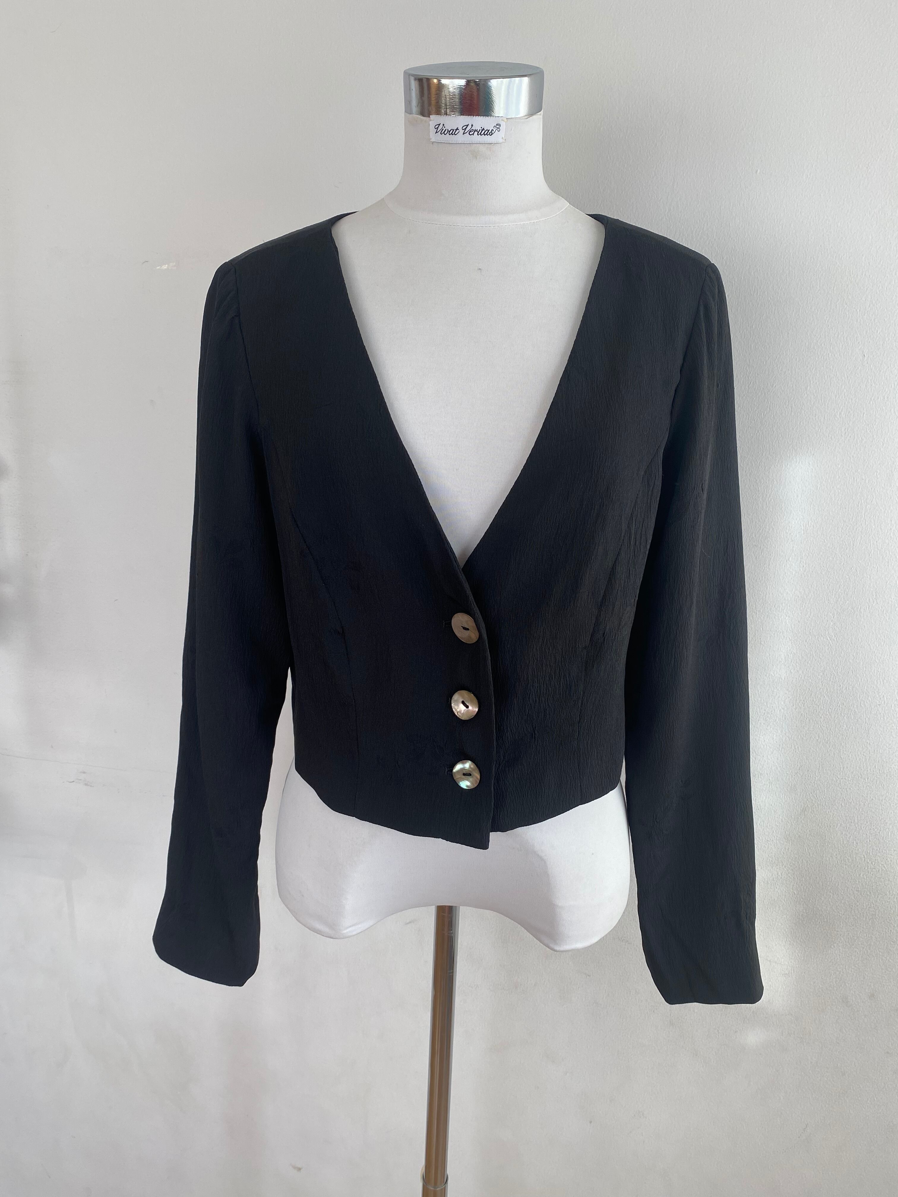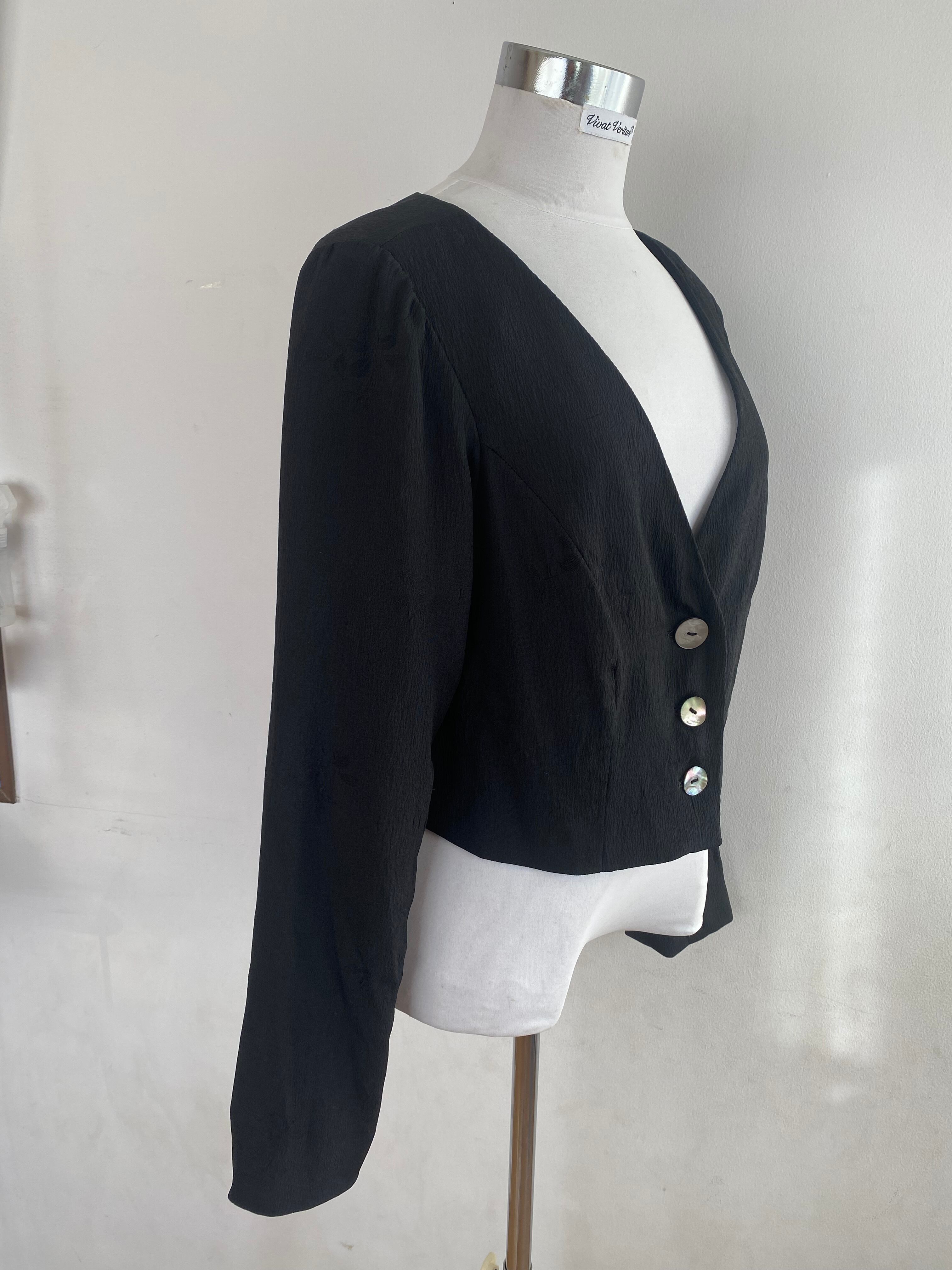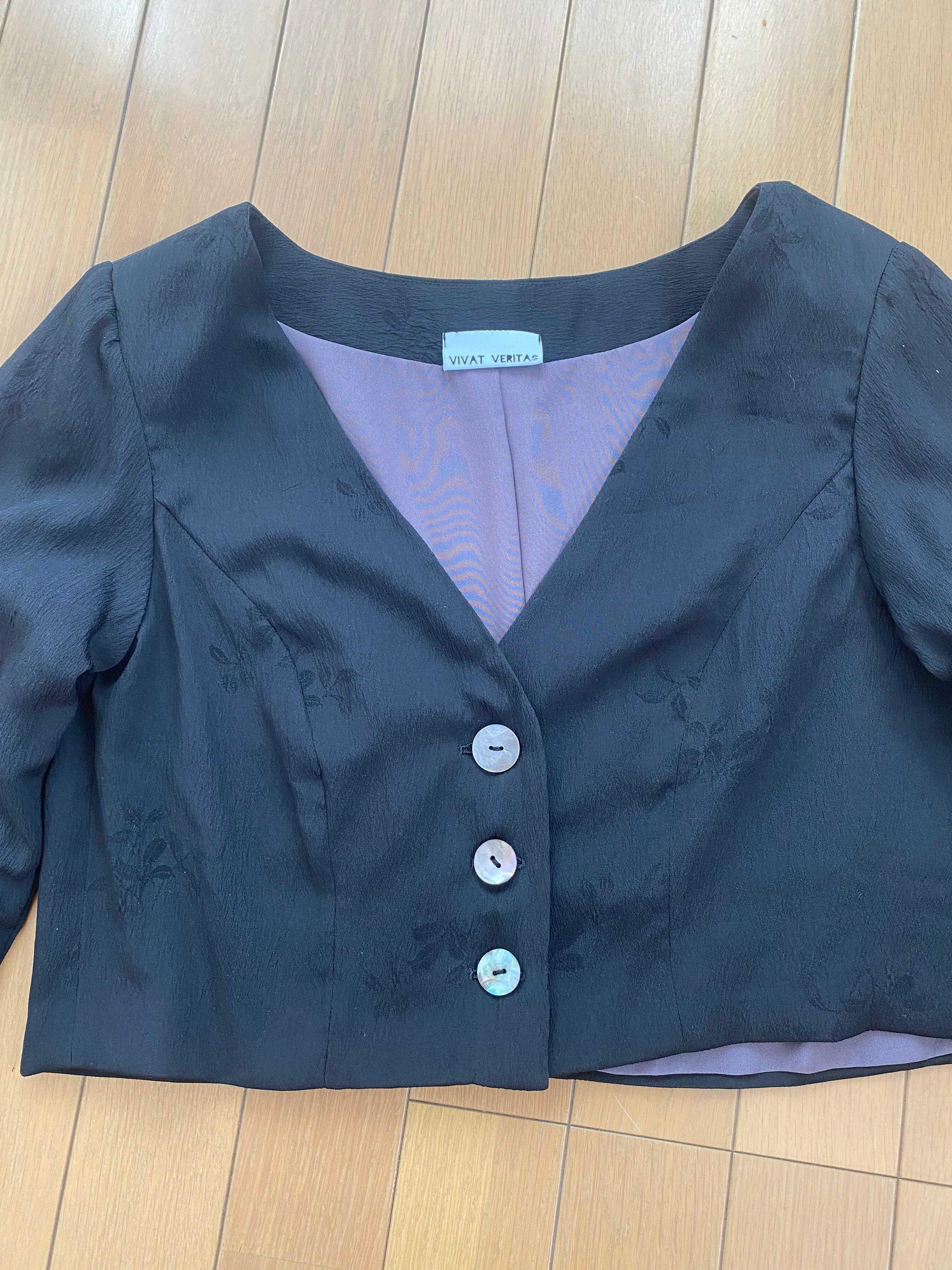 新作2025、ジャケット、クロップド丈、ノーカラー、Vネック、着物リメイク、モダン着物、黒、ブラック、シルク、正絹、一点もの、アップサイクル、エコ、サステイナブル、VivatVeritas、ビバベリタス、パーティ、オケージョン