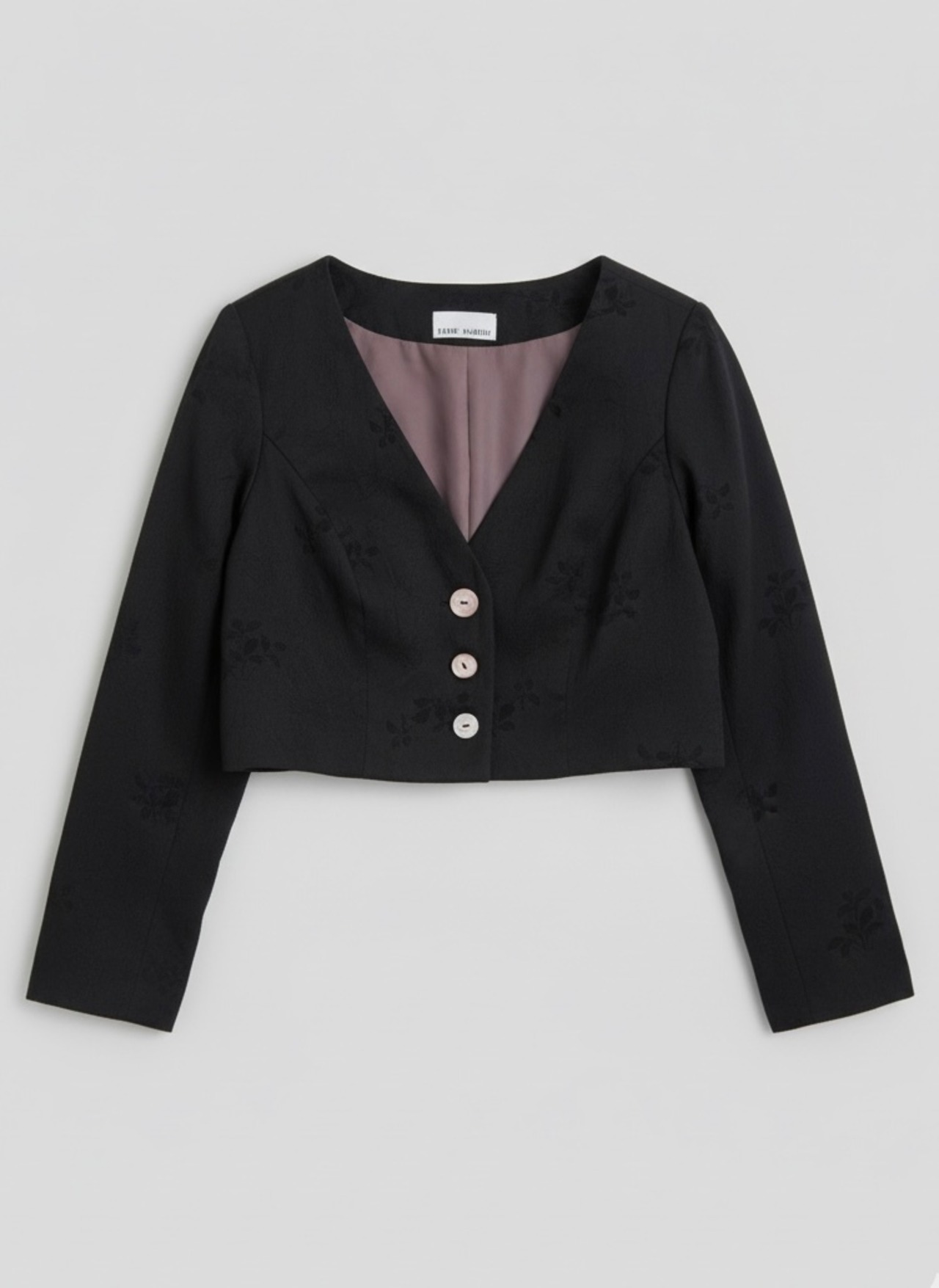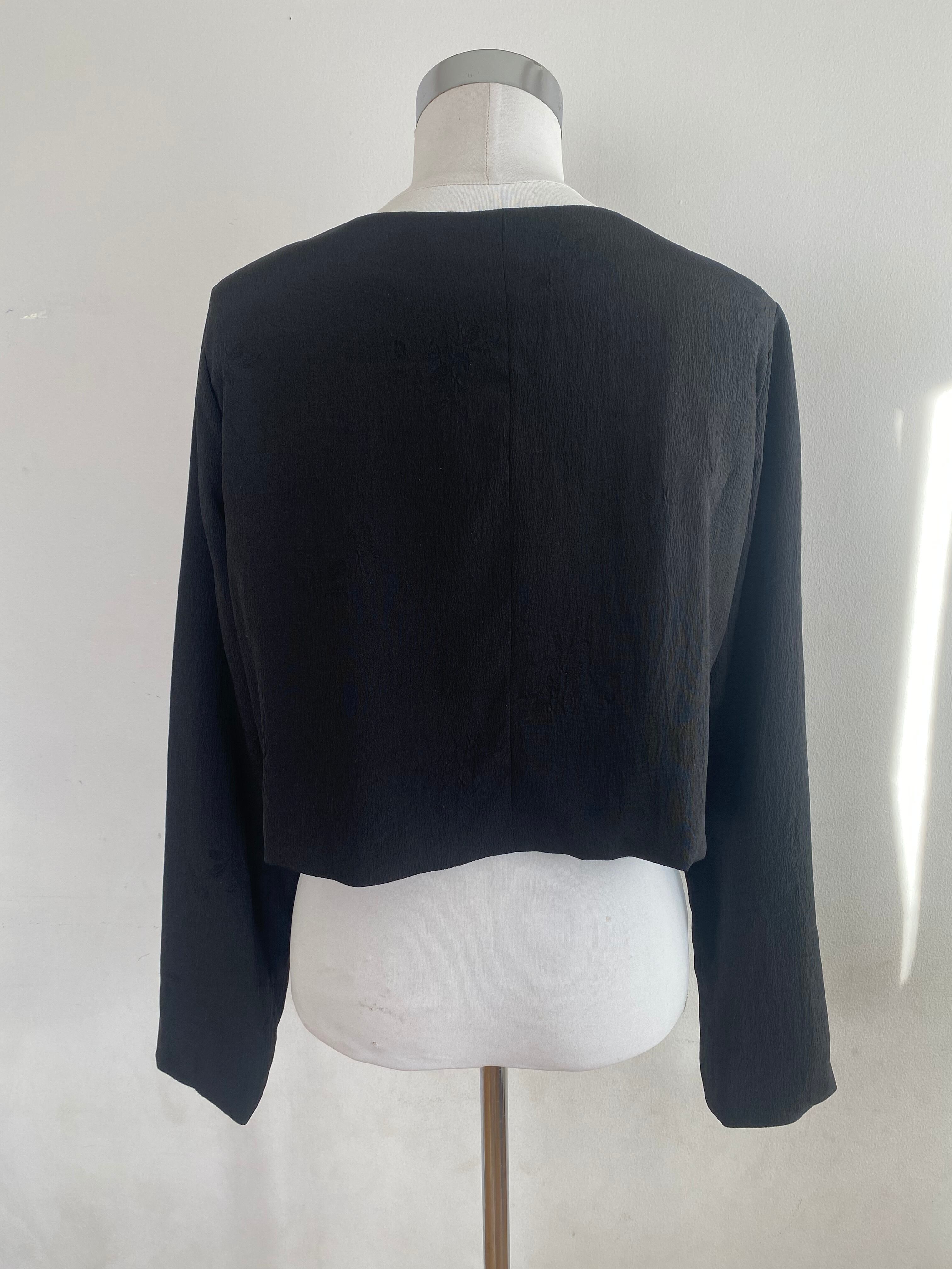 黒地に光沢のある織り柄が浮かび上がる、エレガントな着物生地をリメイクした、ノーカラーのクロップドジャケットです。