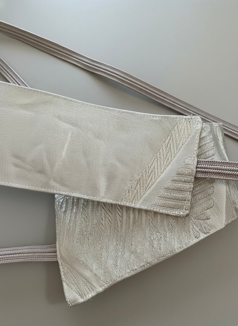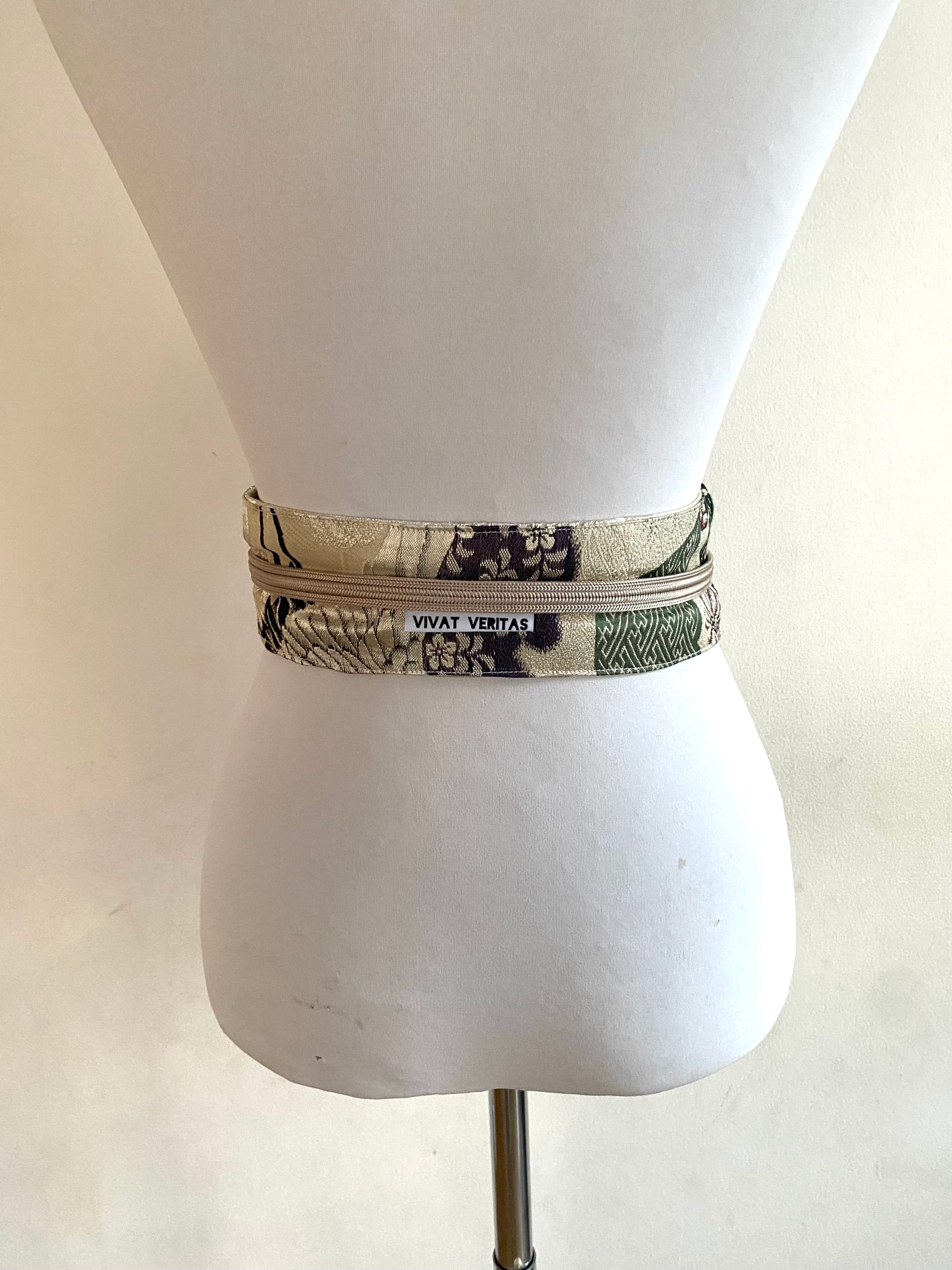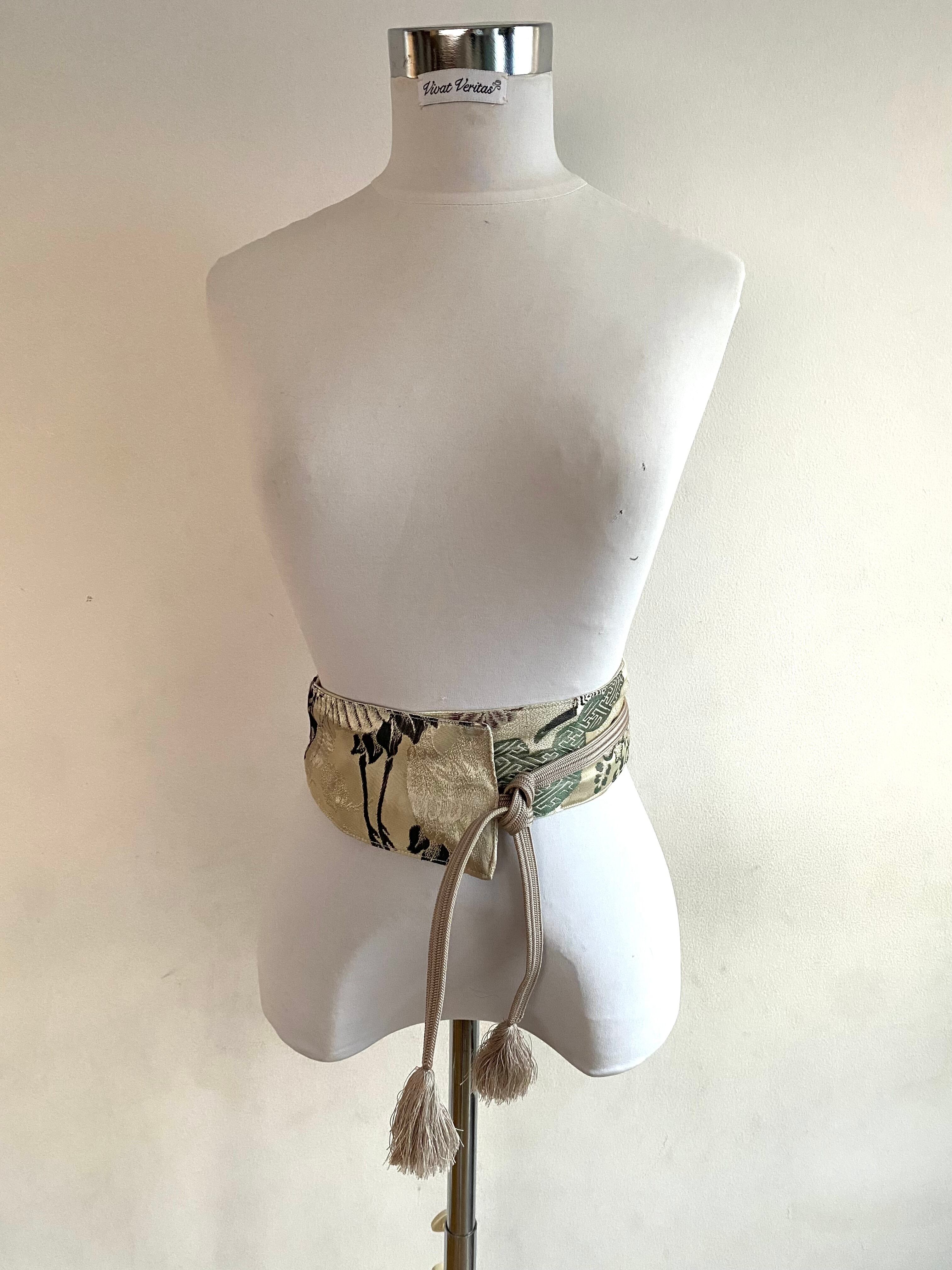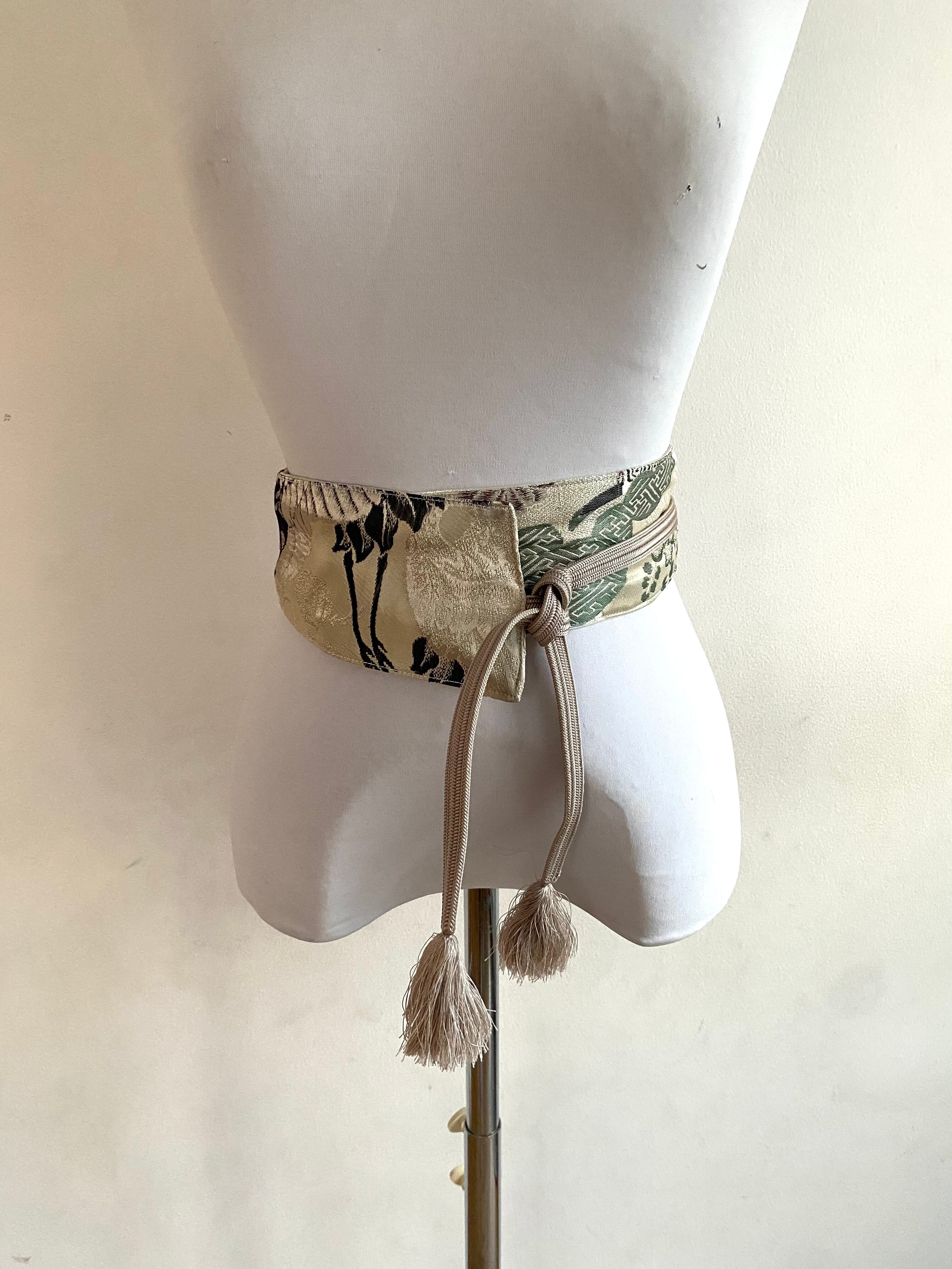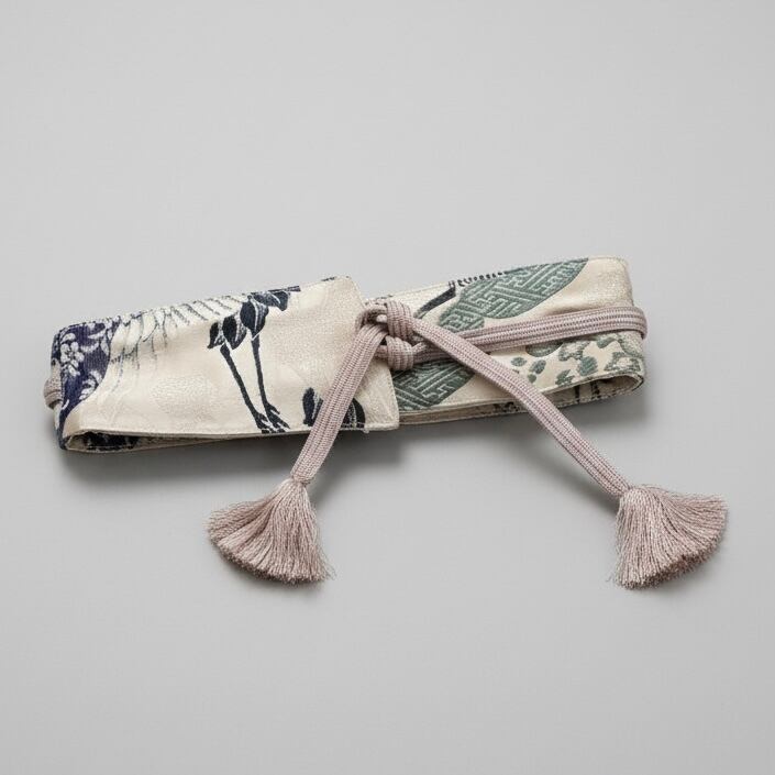 淡いクリーム色の綸子(りんず)地に、落ち着いた青と緑で松や波の文様が描かれた上質な着物帯の生地をリメイクした、モダンでエレガントな丸ぐけのベルト