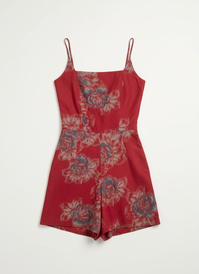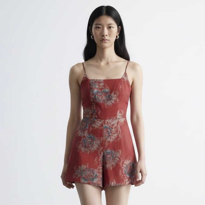 華奢なキャミソールストラップと、ウエストの切り替えでスタイルアップ効果もあるショートパンツのシルエット。