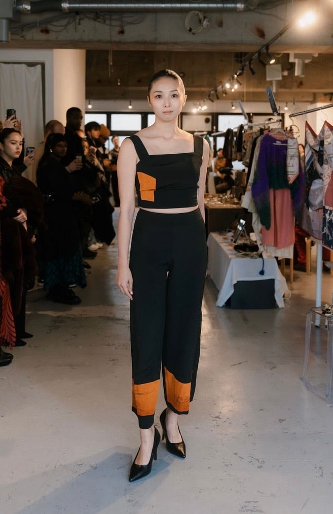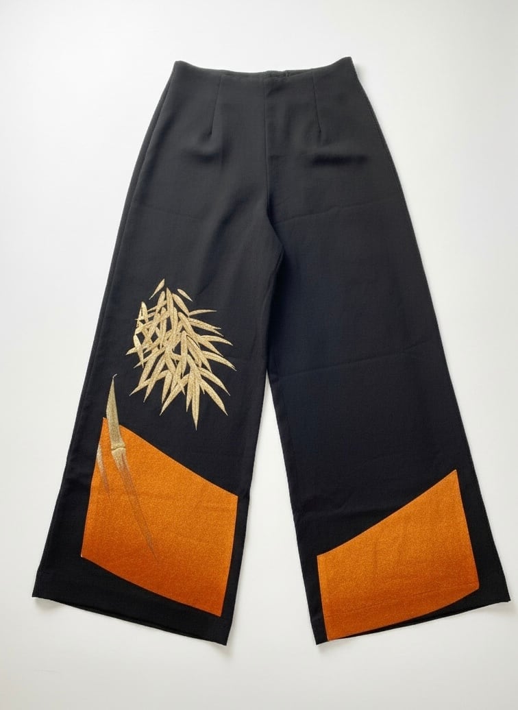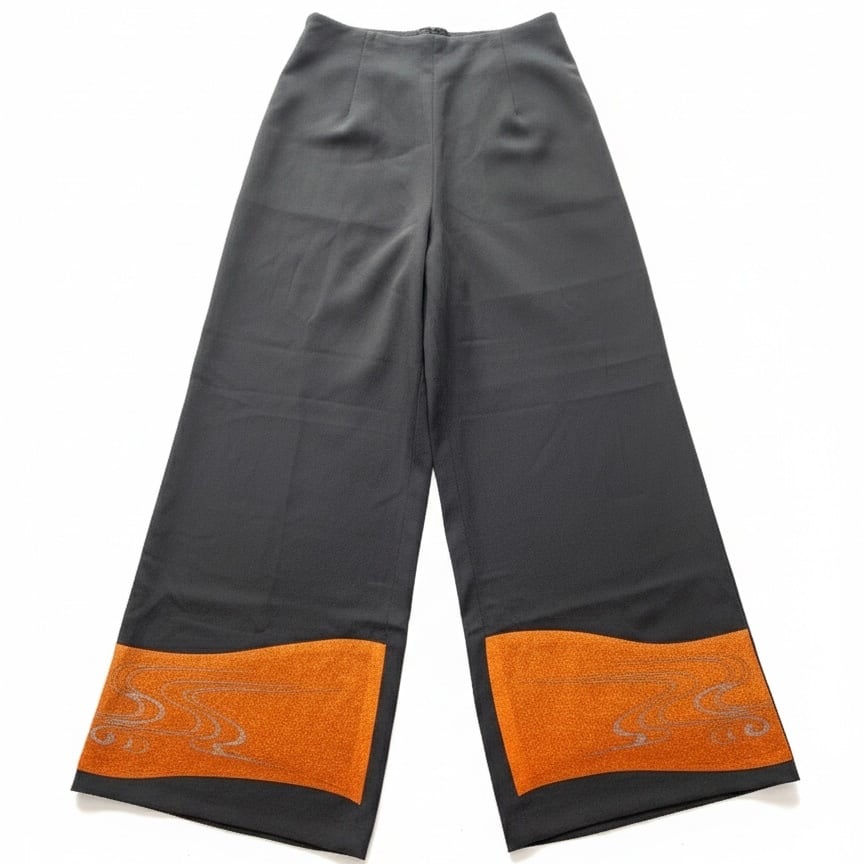 新作2025、ワイドパンツ、着物リメイク、モダン着物、和風、和モダン、刺繍、竹、エコ、サステイナブル、VivatVeritas、ビバベリタス、一点もの、チャコールグレー、オレンジ、金、シルク、正絹、ハイウエスト