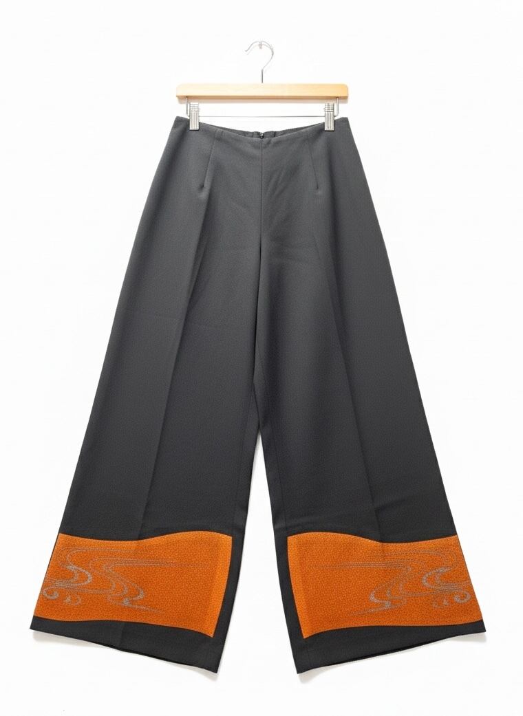 シックな黒留袖の着物生地をリメイクした、ワイドストレートパンツです。裾には鮮やかなオレンジの水の流れのような文様の上に金のうねうね柄が入っています。