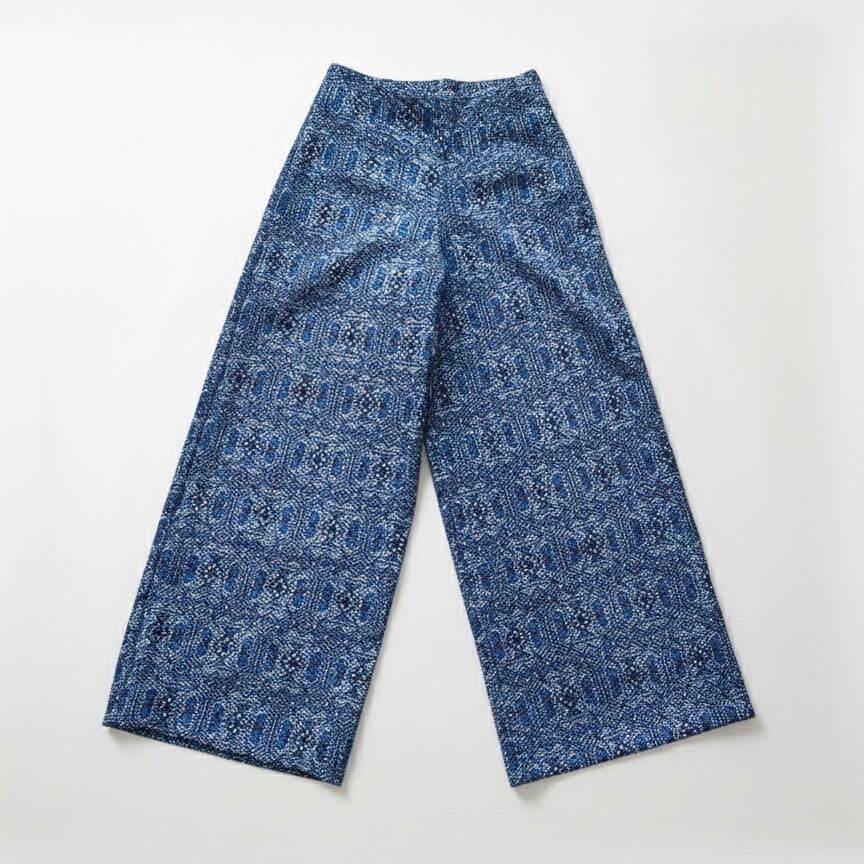 新作2025、着物リメイク、着物リメイクパンツ、ワイドパンツ、ガウチョパンツ、ウールパンツ、和柄、幾何学模様、冬の新作、サステイナブル、エシカルファッション、一点もの、ネイビー、ウール、ビバベリタス、VivatVeritas、KimonoRemake、UpcycledKimono、WoolPants、WideLegPants、JapaneseVintage、HandmadeInTokyo、SustainableFashion