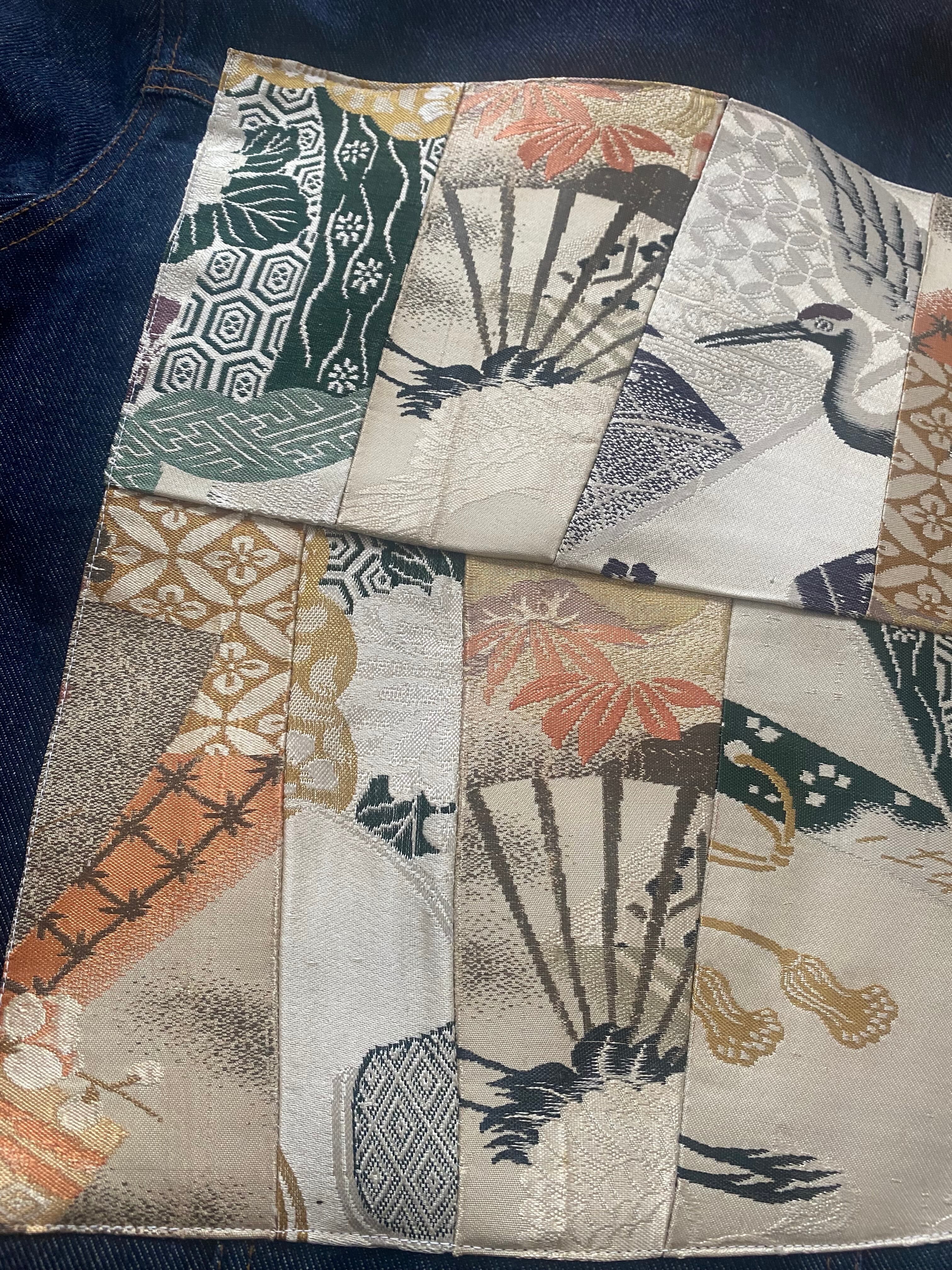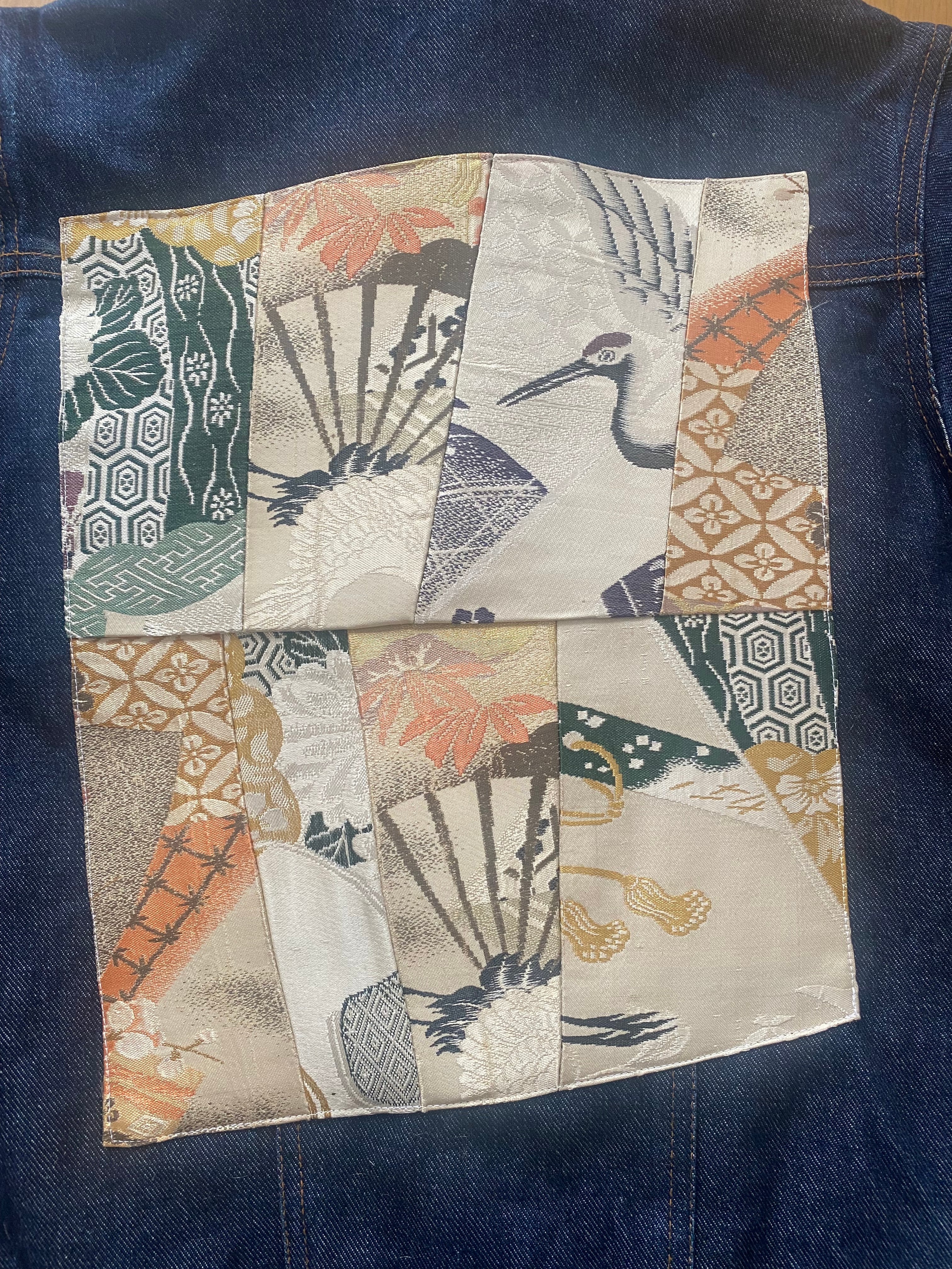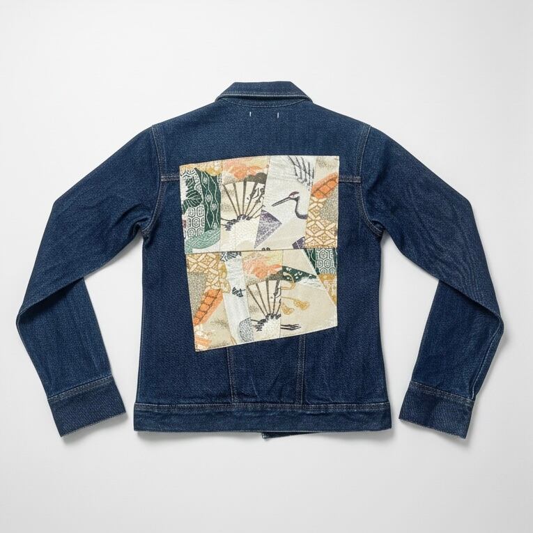 新作2025、着物リメイク、帯リメイク、デニムジャケット、Gジャン、パッチワーク、和モダン、アップサイクル、サステイナブル、一点もの、ヴィンテージ、和風、鶴、扇、VivatVeritas、ビバベリタス、東京、Kimonoremake、UpcycledDenim、ObiPatchwork、SustainableFashion、JapaneseVintage、HandmadeInTokyo