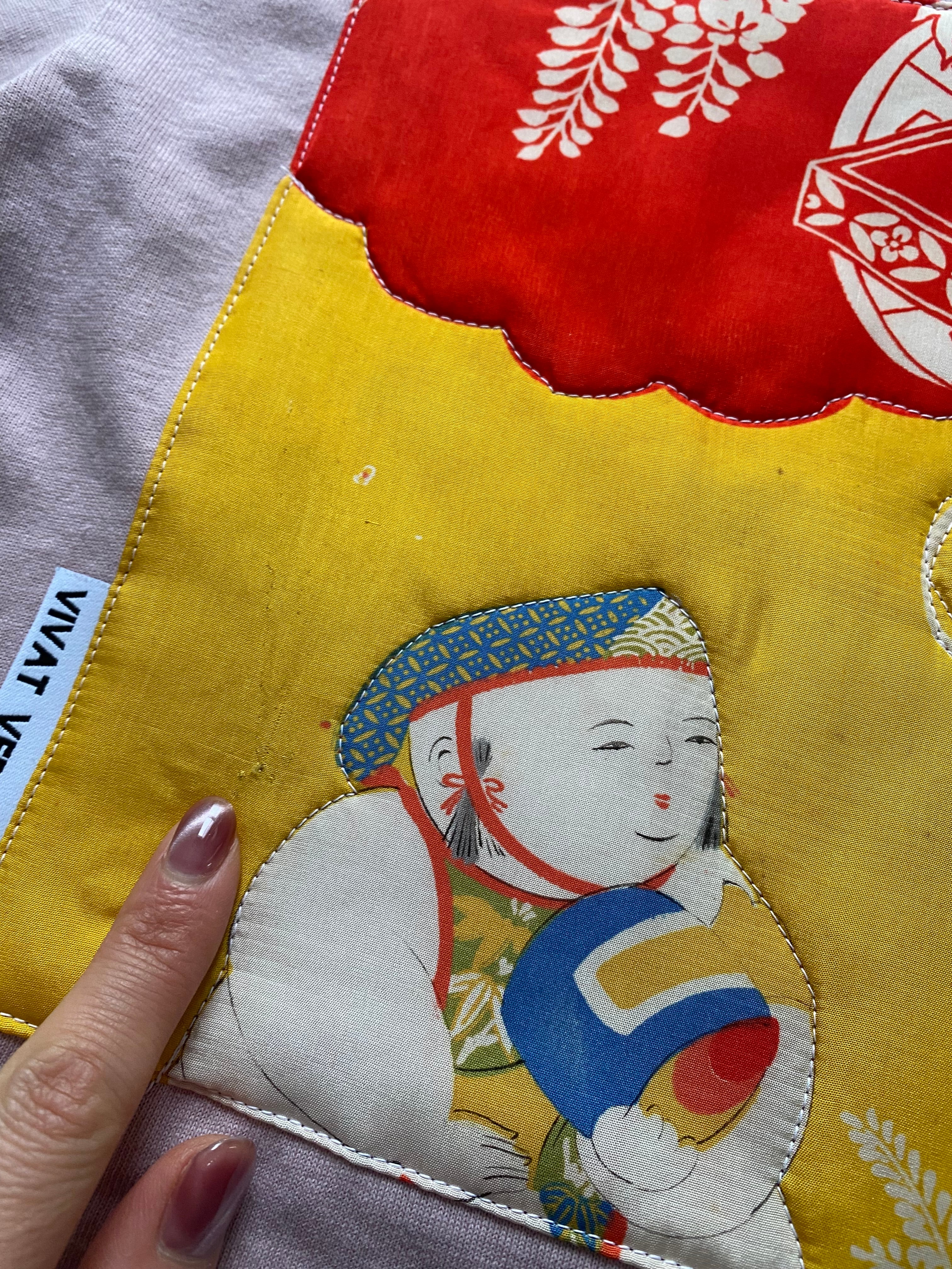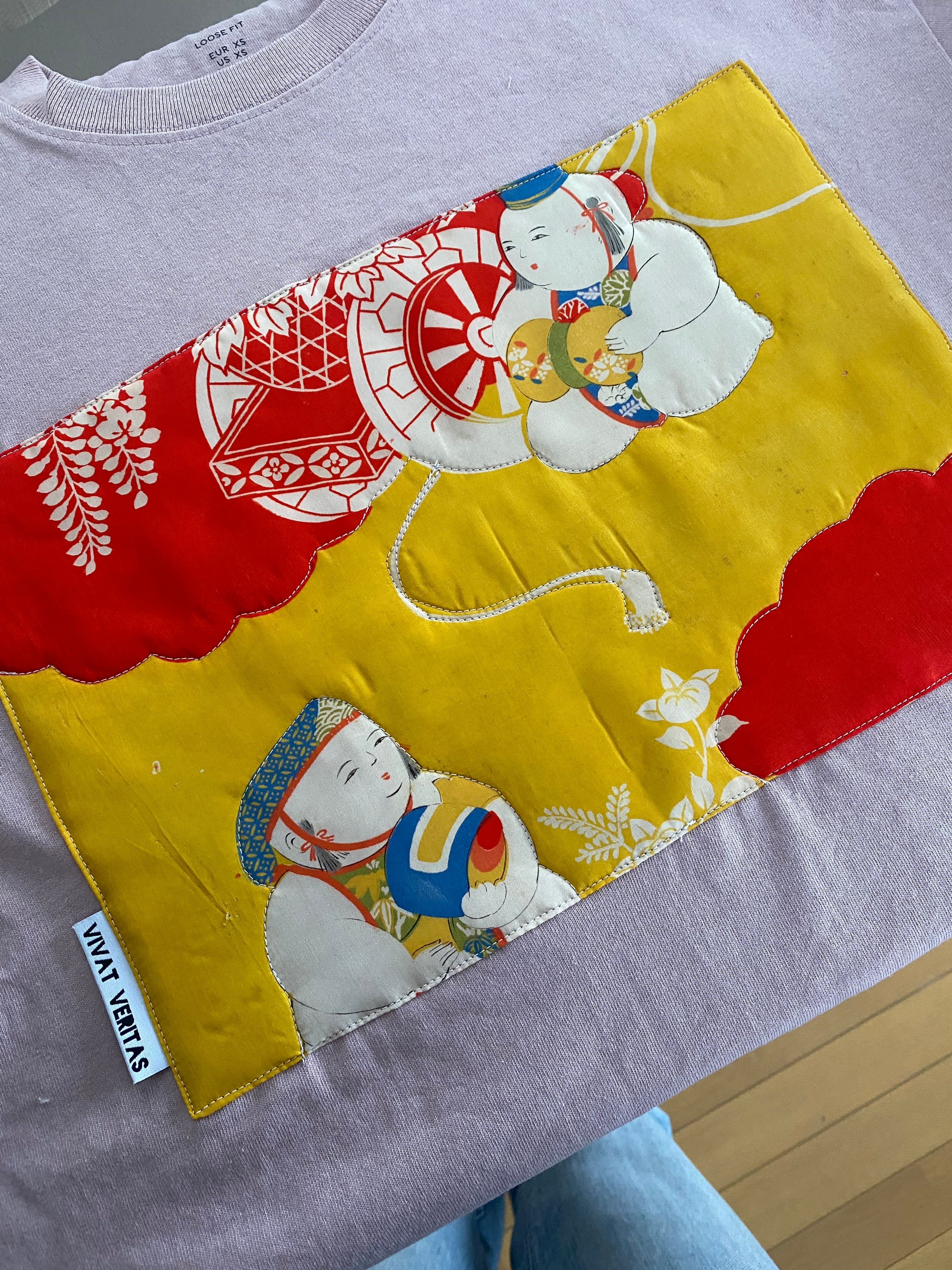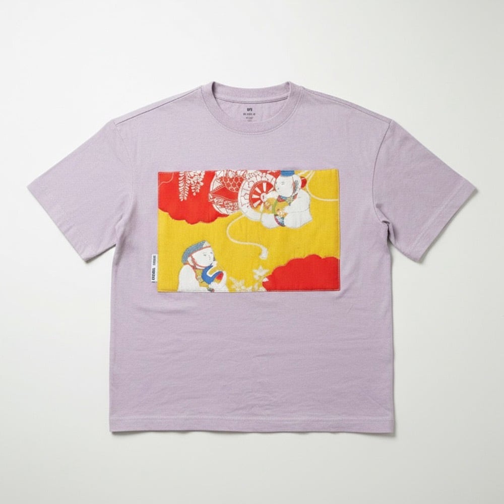 新作2025、着物リメイク、Tシャツ、アップサイクル、パッチワーク、キルト、唐子、和風、和モダン、ストリートファッション、サステイナブル、エコ、VivatVeritas、ビバベリタス、一点もの、ラベンダー、紫、ユニセックス、古着リメイク、藤色Kimonoremake, Upcycled, T-shirt, JapaneseStyle, Sustainable Fashion, Patchwork, Quilted, Unique, Tokyo, Handcrafted