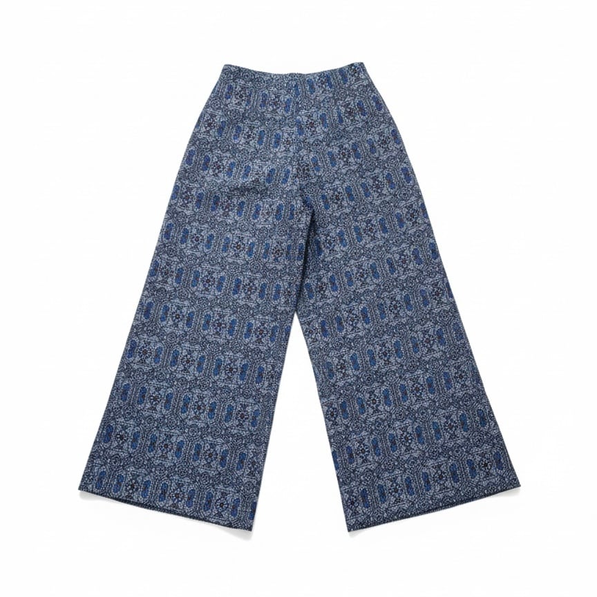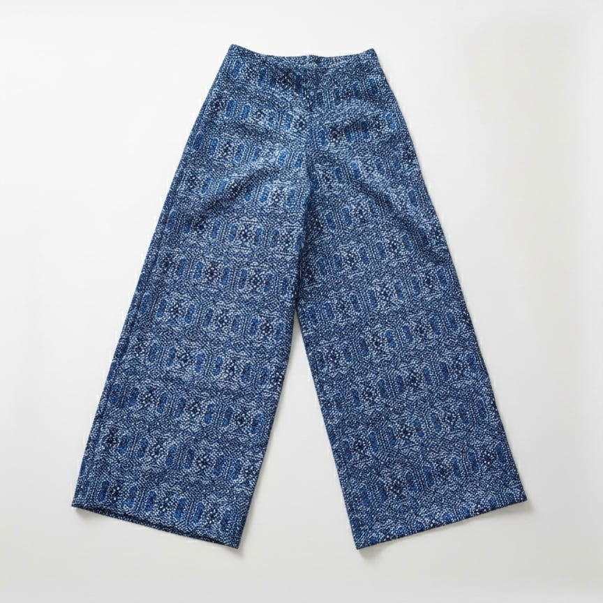 深いネイビーと細やかな幾何学模様が美しい、ウールの着物生地を使用したワイドパンツです。