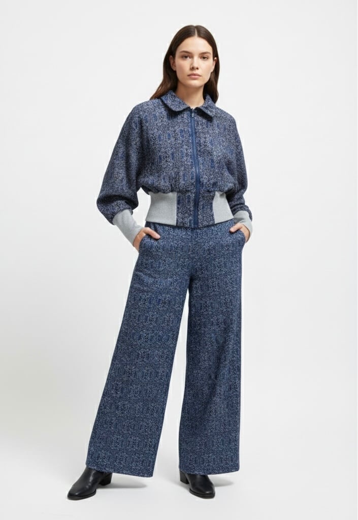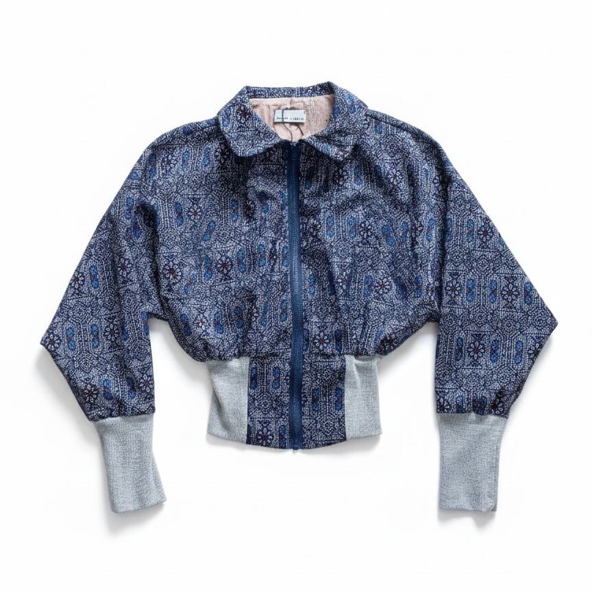 新作2026、着物リメイク、アップサイクル、ボマージャケット、ブルゾン、ドルマンスリーブ、ショート丈、幾何学模様、ウール、シルク、和モダン、サステイナブル、一点もの、ネイビー、ブルー、VivatVeritas、ビバベリタス、ハンドメイド