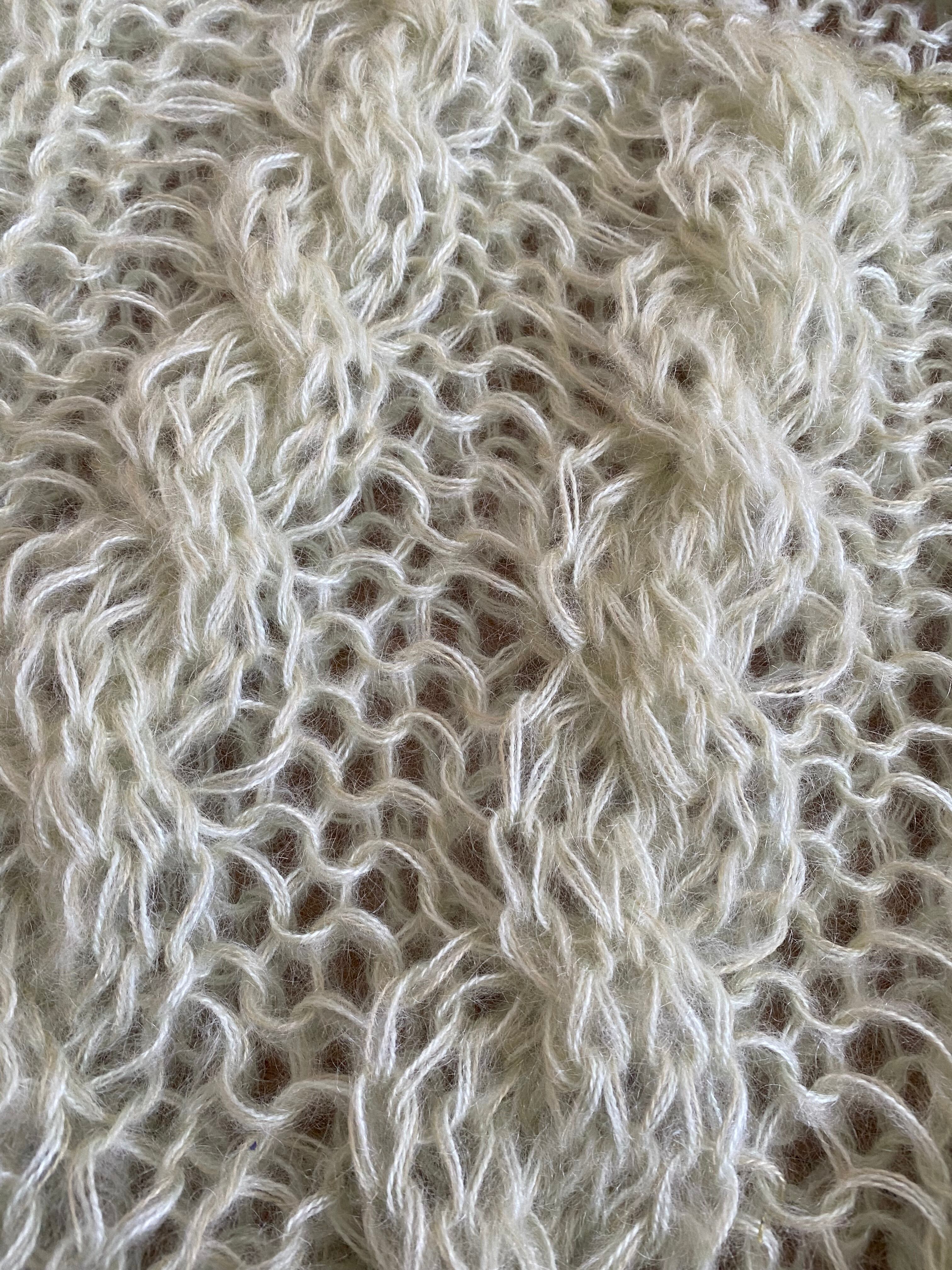 モヘア特有のふわふわとした起毛感と、手編みならではの柔らかな風合いが、女性らしく優しい雰囲気を演出します。