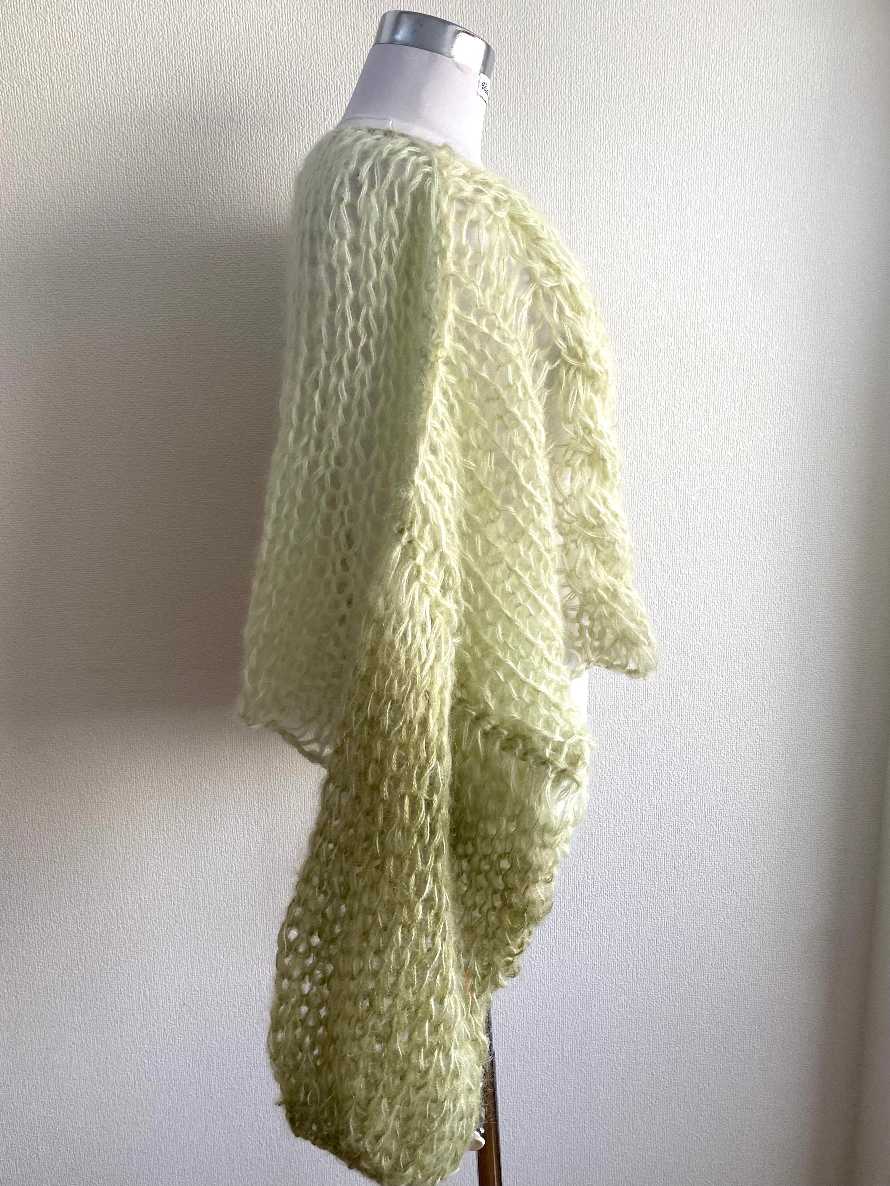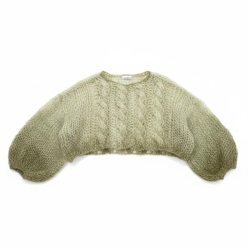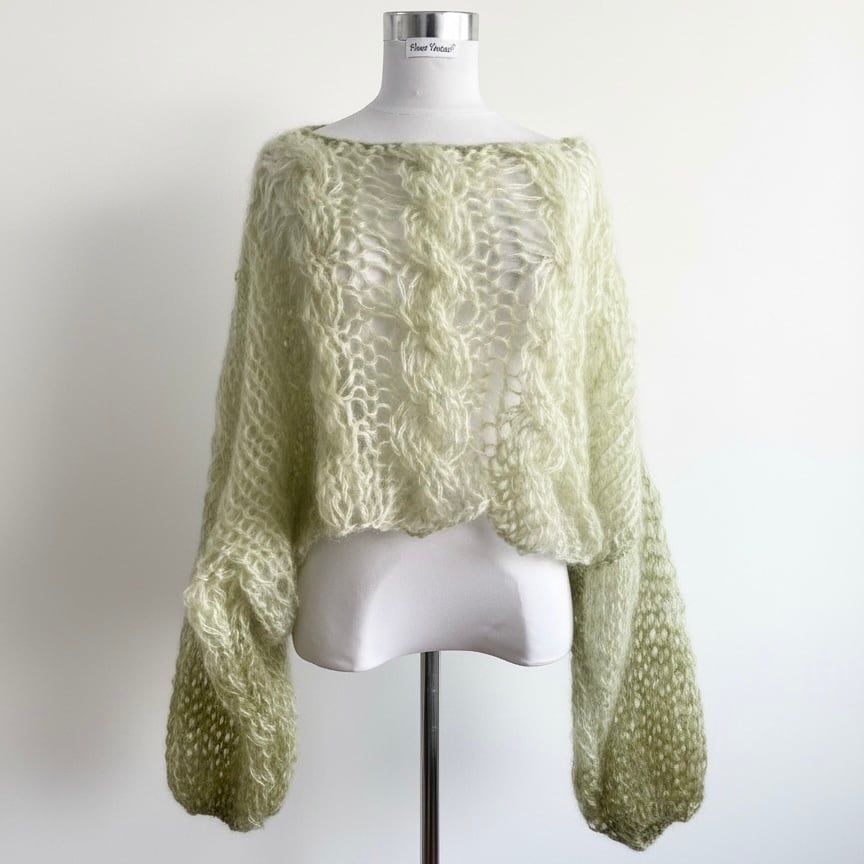 新作2026、手編みニット、グラデーションニット、モヘアニット、ボリューム袖、クロップド丈、ショート丈、透け感ニット、シアーニット、ハンドメイド、一点もの、セージグリーン、オリーブ、ふわふわ、レイヤードスタイル、Handmade, Hand knitted, Mohair knit, Cropped knit, Gradient, Green, Sheer knit, Volume sleeve, One of a kind
