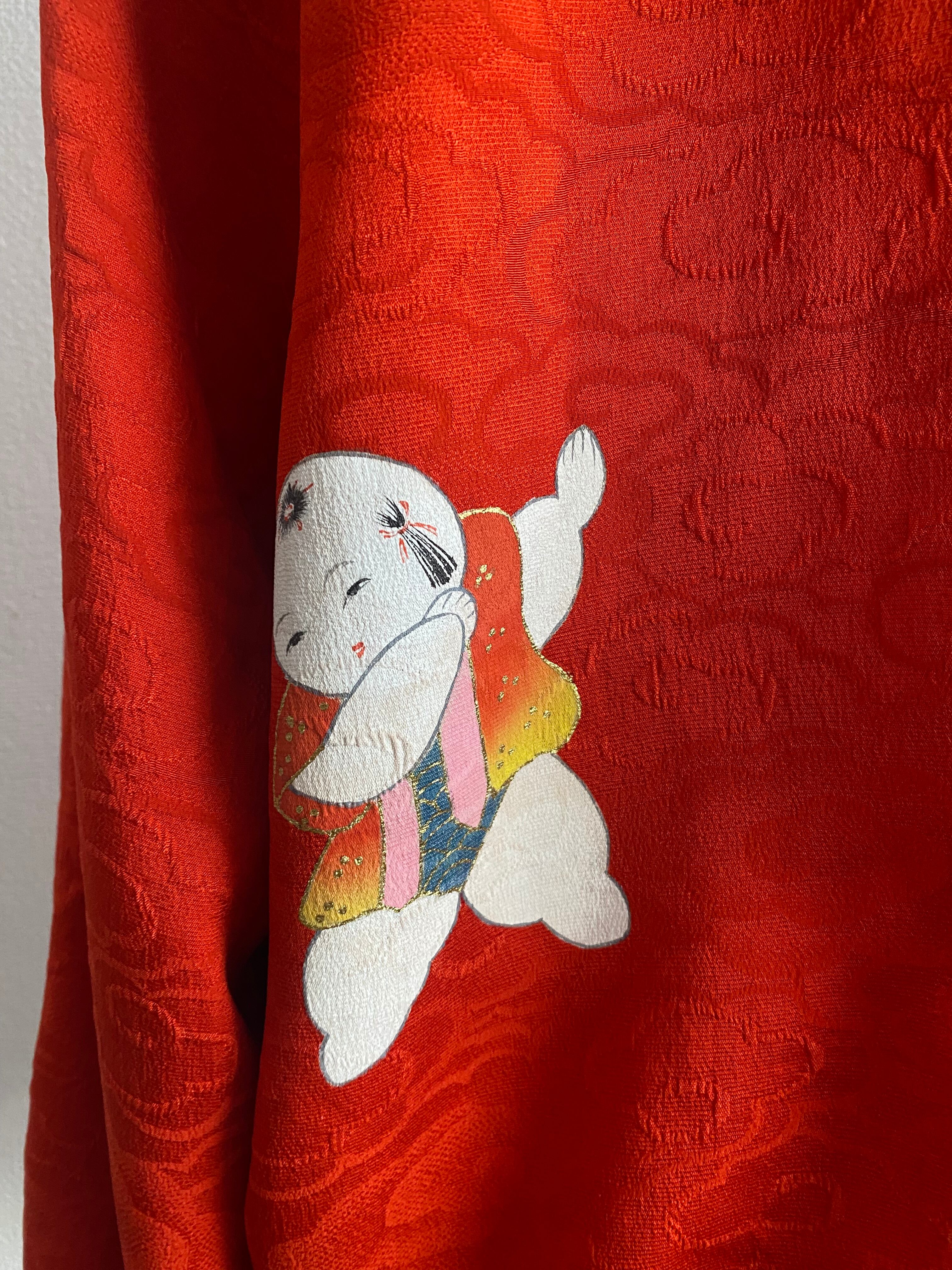 目を引く赤の地色には、繊細な地紋が施されており、光の当たり方で表情が変わります。袖や身頃にあしらわれた唐子の絵柄が、遊び心とクラシックな雰囲気。
