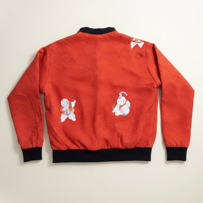 新作2026、着物リメイク、羽織リメイク、スカジャン、ボマージャケット、ブルゾン、和モダン、アップサイクル、サステイナブル、一点もの、正絹、シルク、唐子、和柄、赤、黒、東京、VivatVeritas、ビバベリタス、ユニセックス、MA1