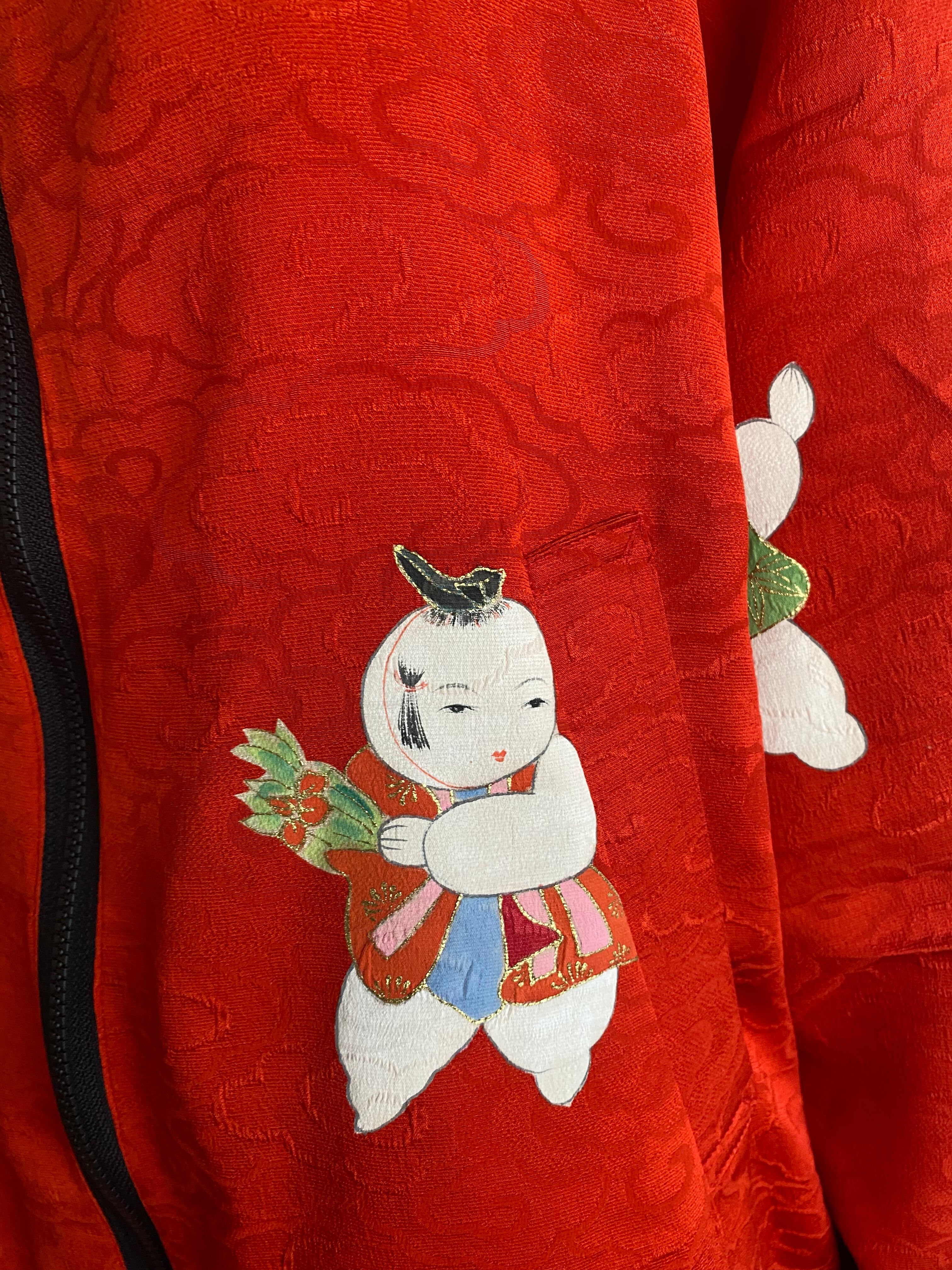 鮮やかな赤色の着物生地に、愛らしい唐子(からこ)の紋様が映えるリメイクジャケットです。