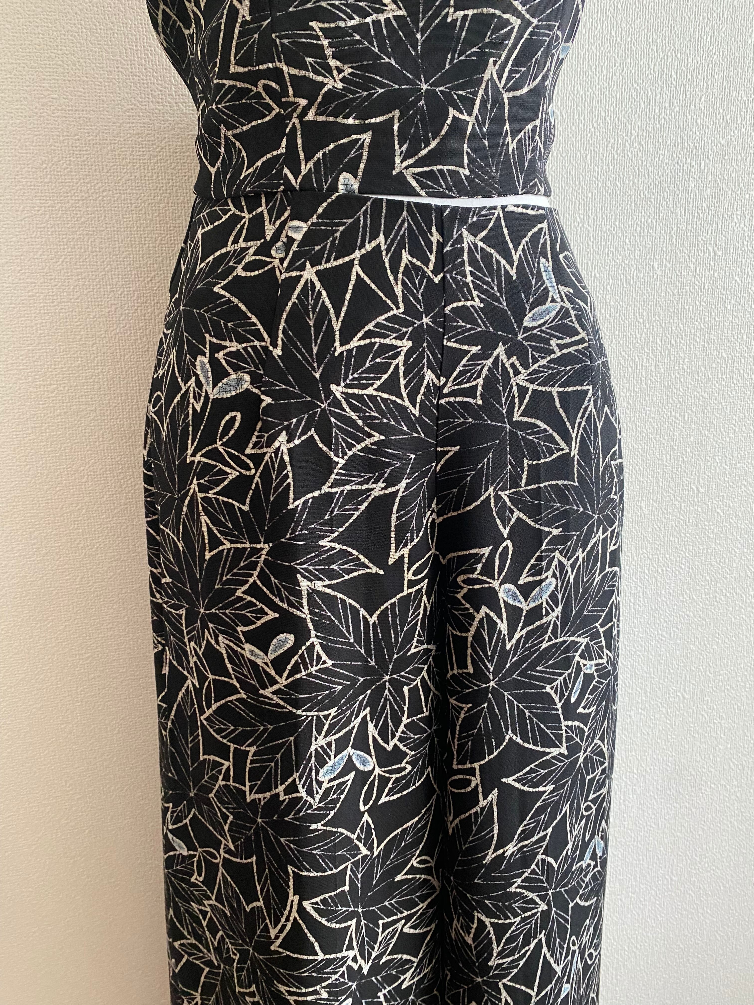 ブラックの地に繊細な白い楓(もみじ)の模様が映える、着物生地をリメイクしたワイドパンツです。