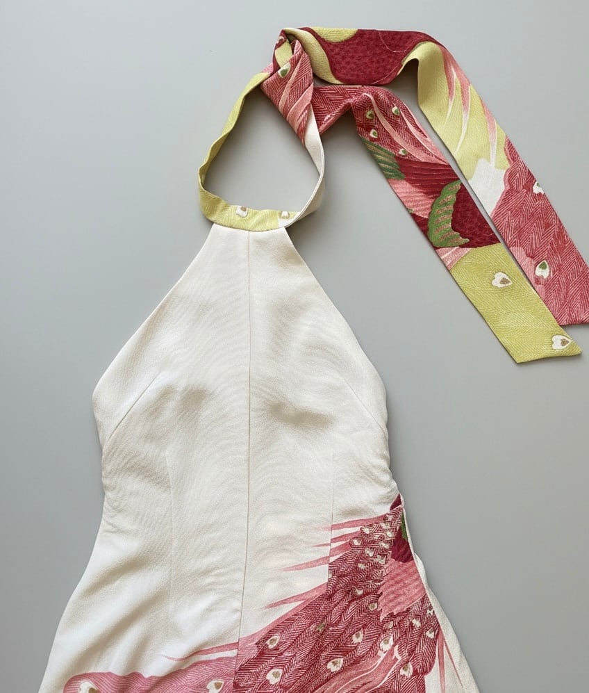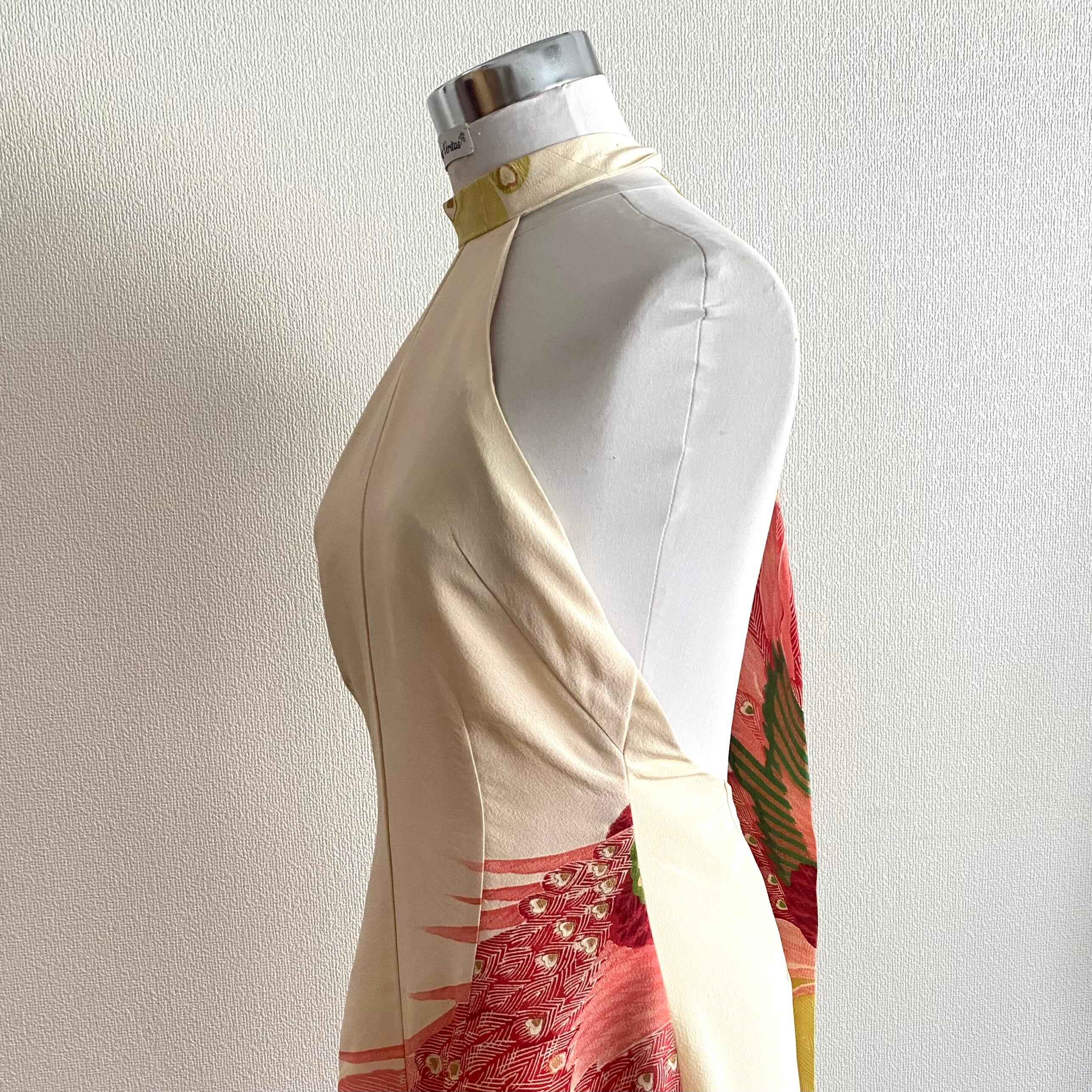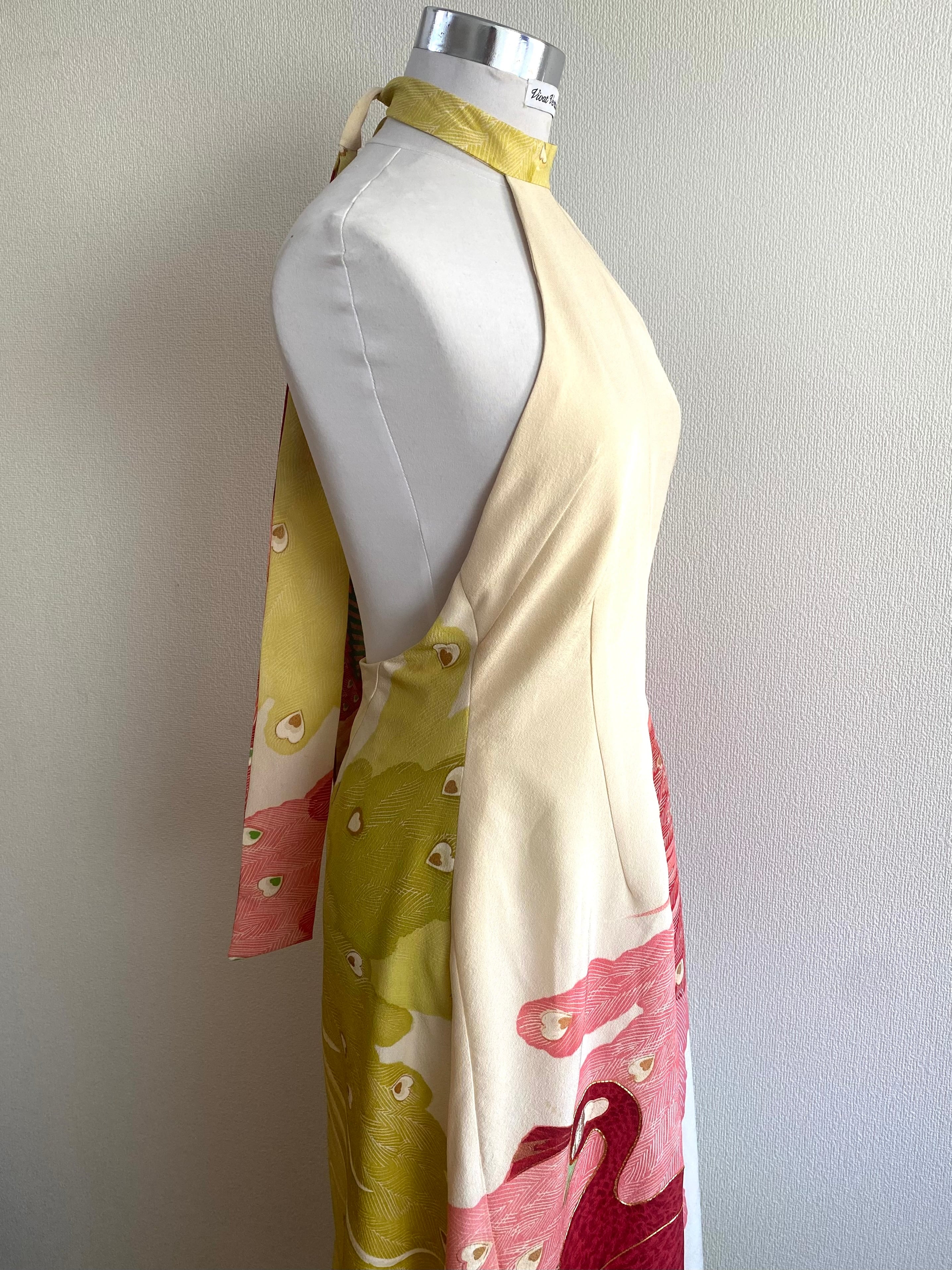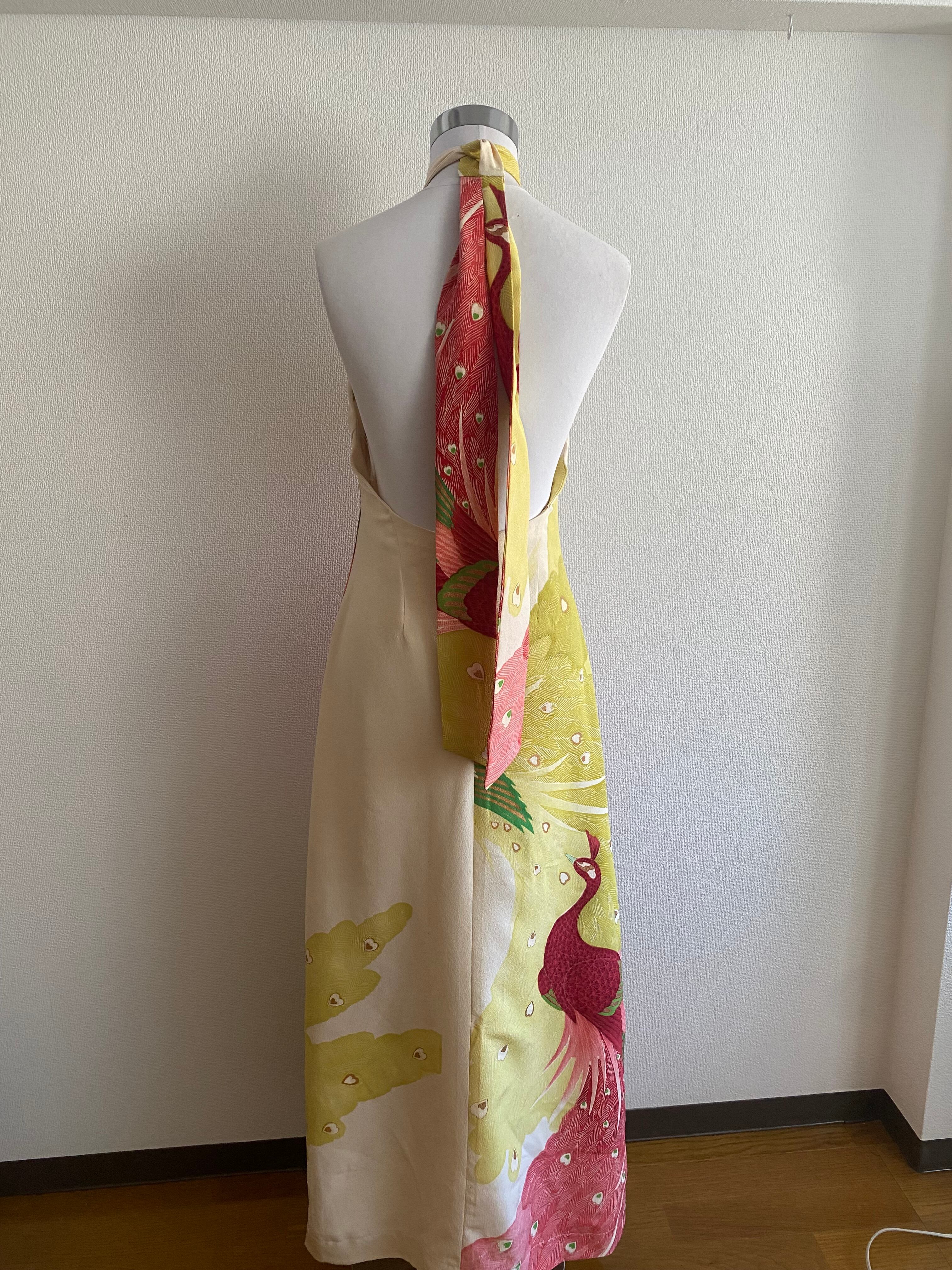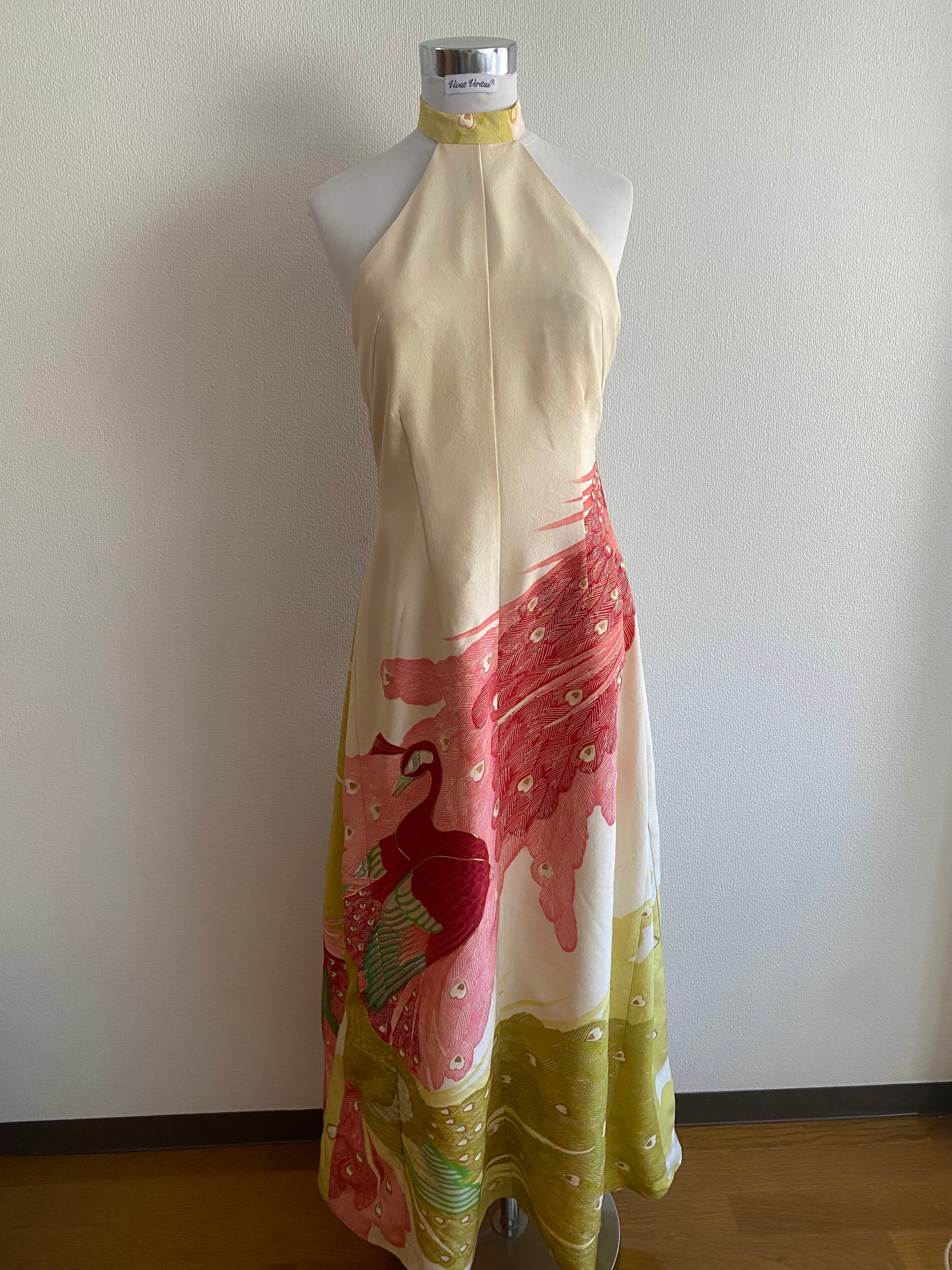 着物リメイク、着物ドレス、ホルターネック、ロングワンピース、バックレスドレス、シルクワンピース、正絹、孔雀柄、和風ドレス、パーティードレス、ゲストドレス、結婚式、二次会、お呼ばれ、サステイナブル、一点もの、ハンドメイド、東京、ビバベリタス