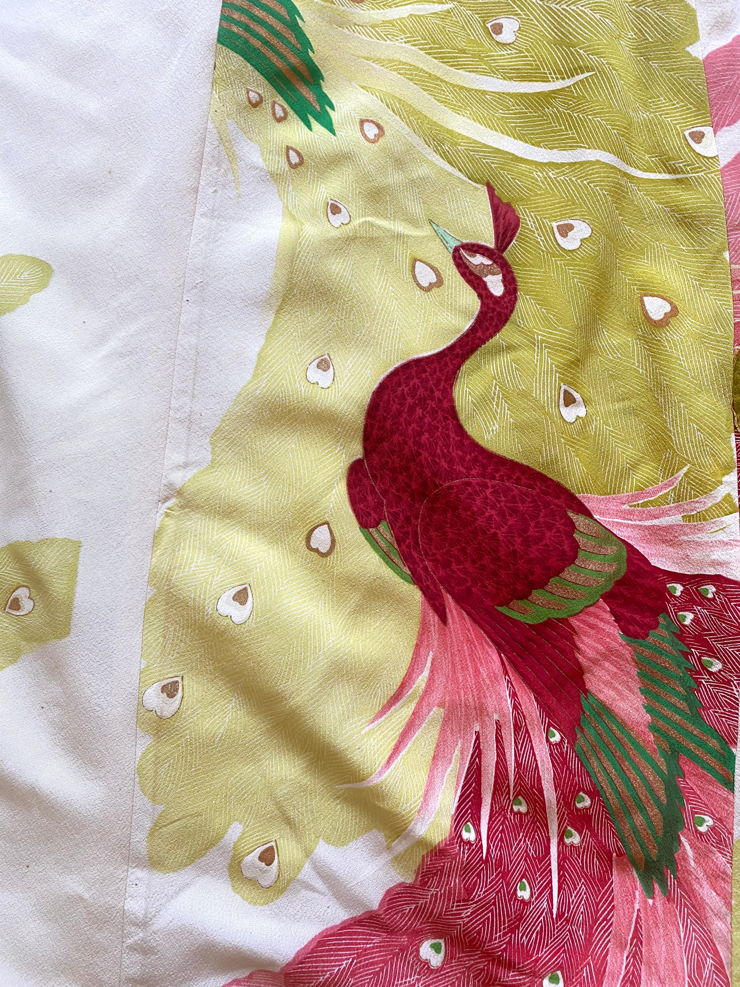華やかな孔雀の文様が目を引く、正絹の着物生地をリメイクしたロングドレスです。