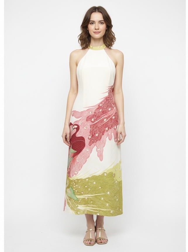 孔雀文様の洗練されたバックレス・ホルターネックドレス