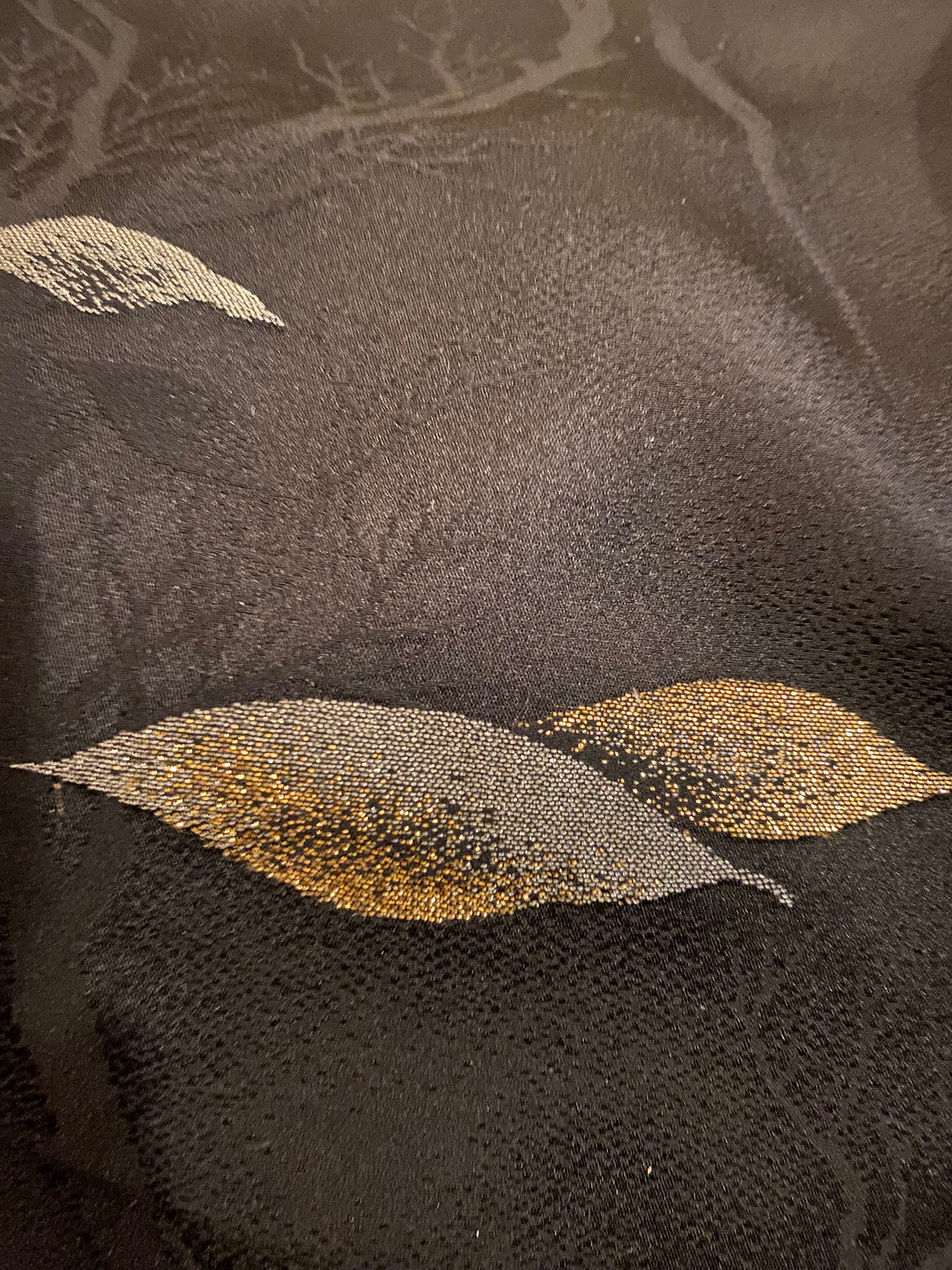 目を引くのは、漆黒の生地に浮かび上がる繊細な柄。背景には影絵のように静かに枝を広げる樹木の地紋が施され、その上を舞い散る木の葉が、金糸と銀糸による刺繍や織りで表現されています。光の加減でゴールドとシルバーが上品に煌めき、奥行きのある表情を見せてくれます。