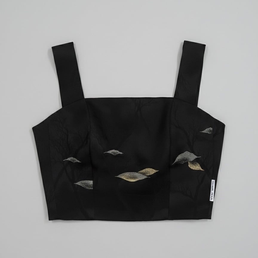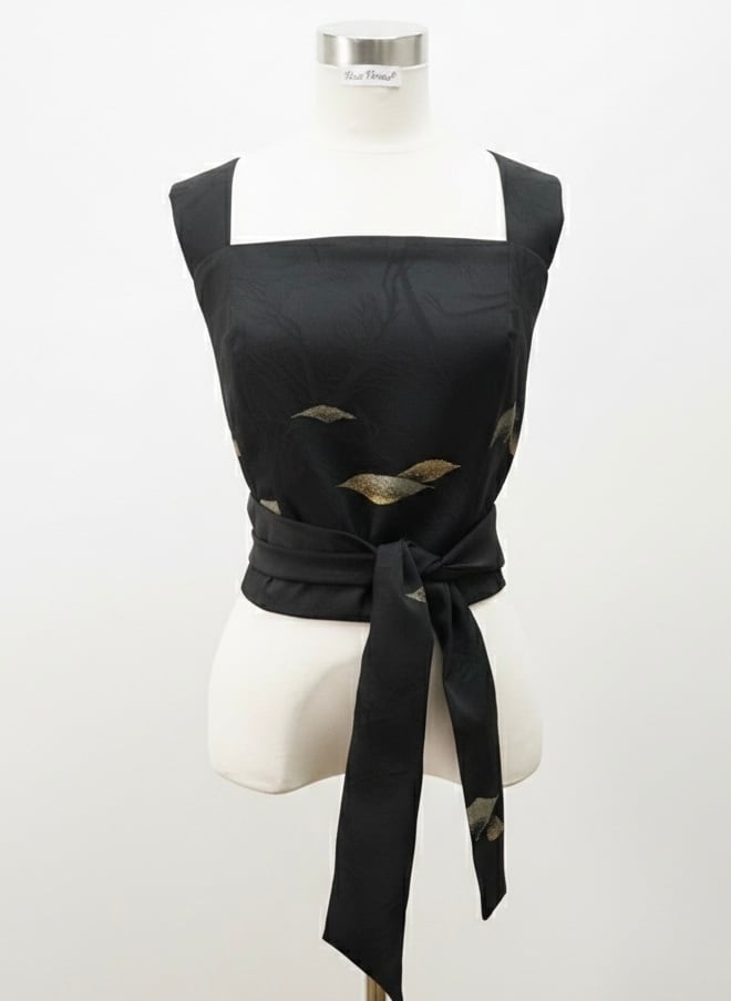 Kimono Remake, Upcycled Kimono, Silk Camisole, Japanese Silk, Sustainable Fashion, Black Gold Silver, Embroidery, Cropped Top, Back Ribbon, Handmade in Tokyo, Vivat Veritas, Unique Piece, Japanese Vintage