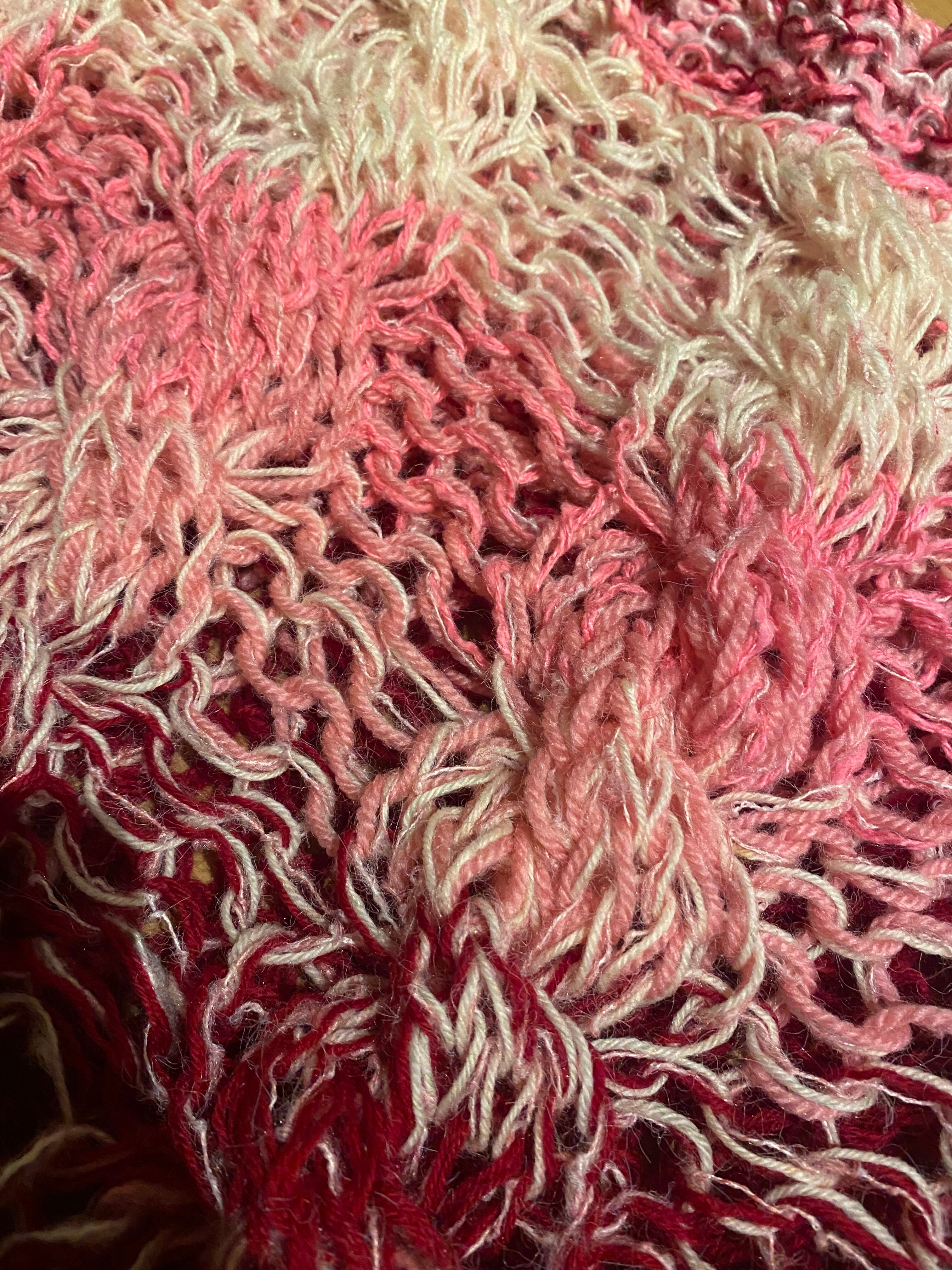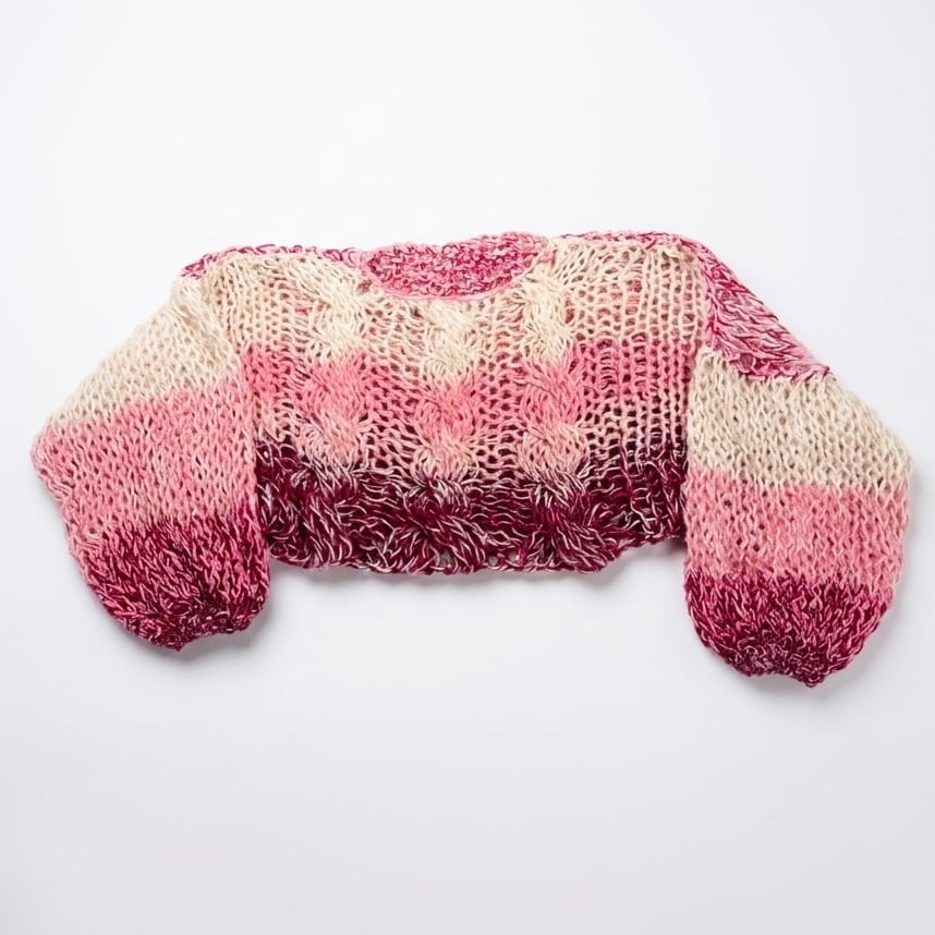 新作2026、手編みニット、ハンドメイドニット、ローゲージニット、グラデーションカラー、いちごミルク、ピンク、クロップド丈、ショート丈、ボリューム袖、一点もの、サステイナブル、VivatVeritas、ビバベリタス、冬支度、自分へのご褒美