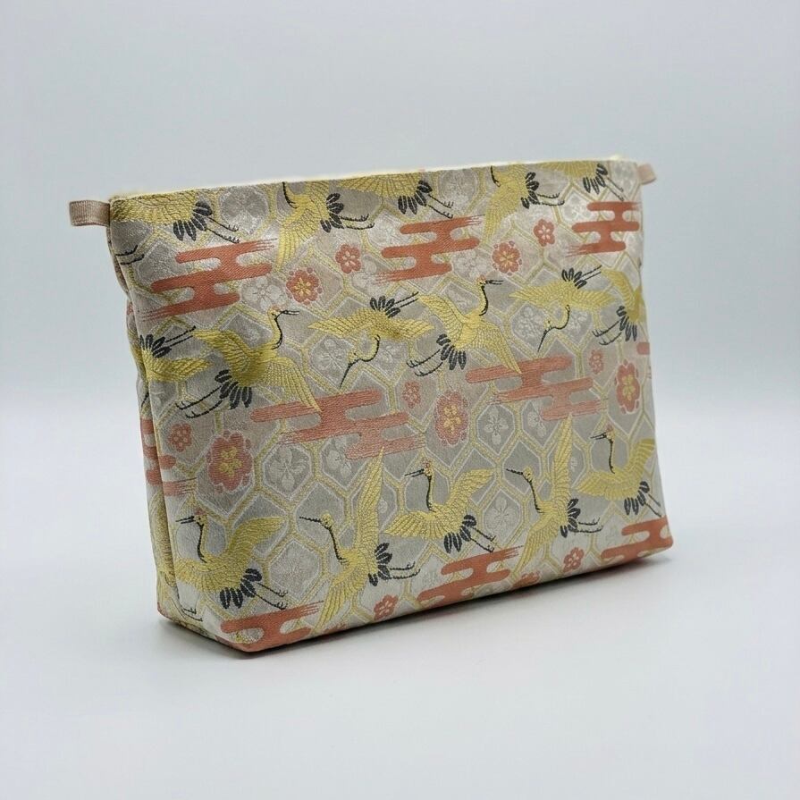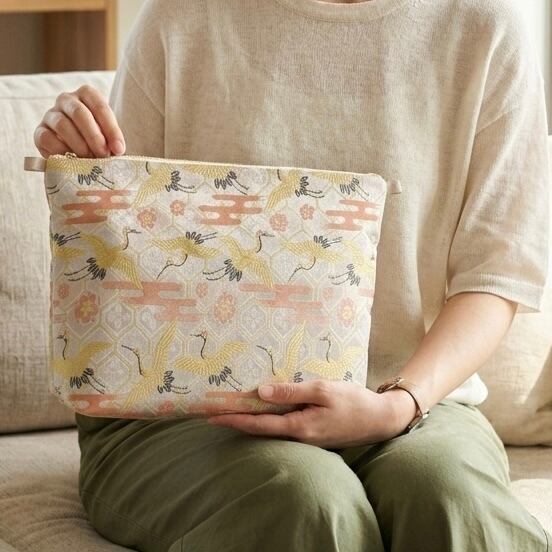 時を経て受け継がれてきた豪華な正絹の帯を贅沢に使用し、現代のライフスタイルに寄り添う大容量のポーチに仕立てました。