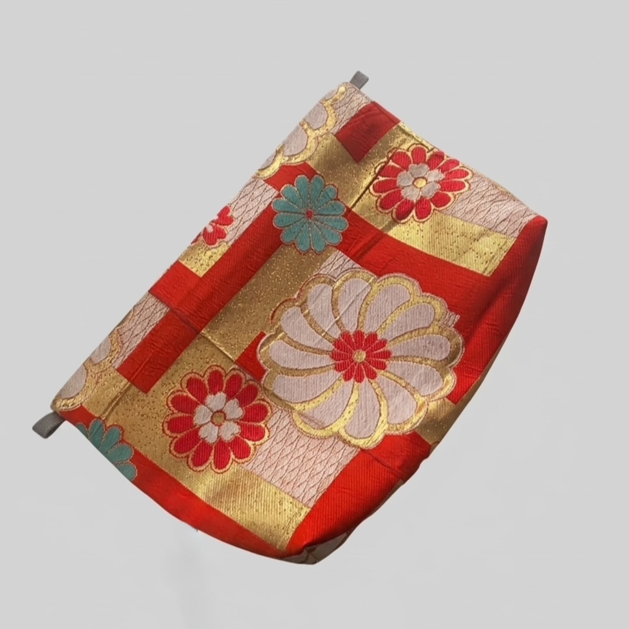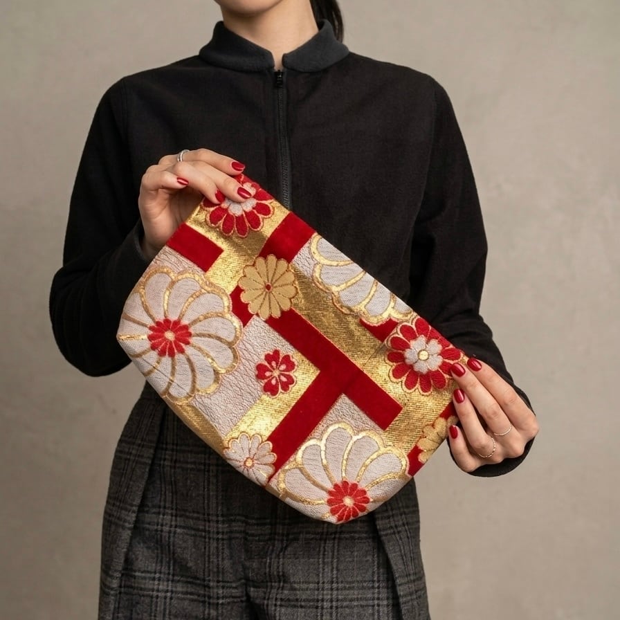 鮮やかな朱赤に、金糸で織りなされた菊の文様が目を引く帯をリメイクしたクラッチバッグです。歴史がある素材が持つ重厚感と、現代のライフスタイルに馴染む機能性を掛け合わせました。