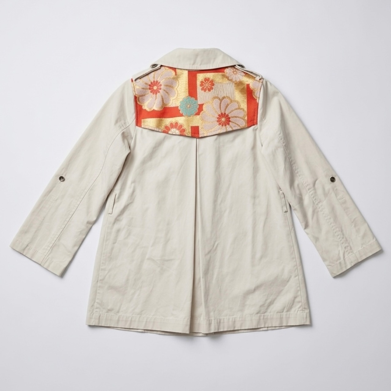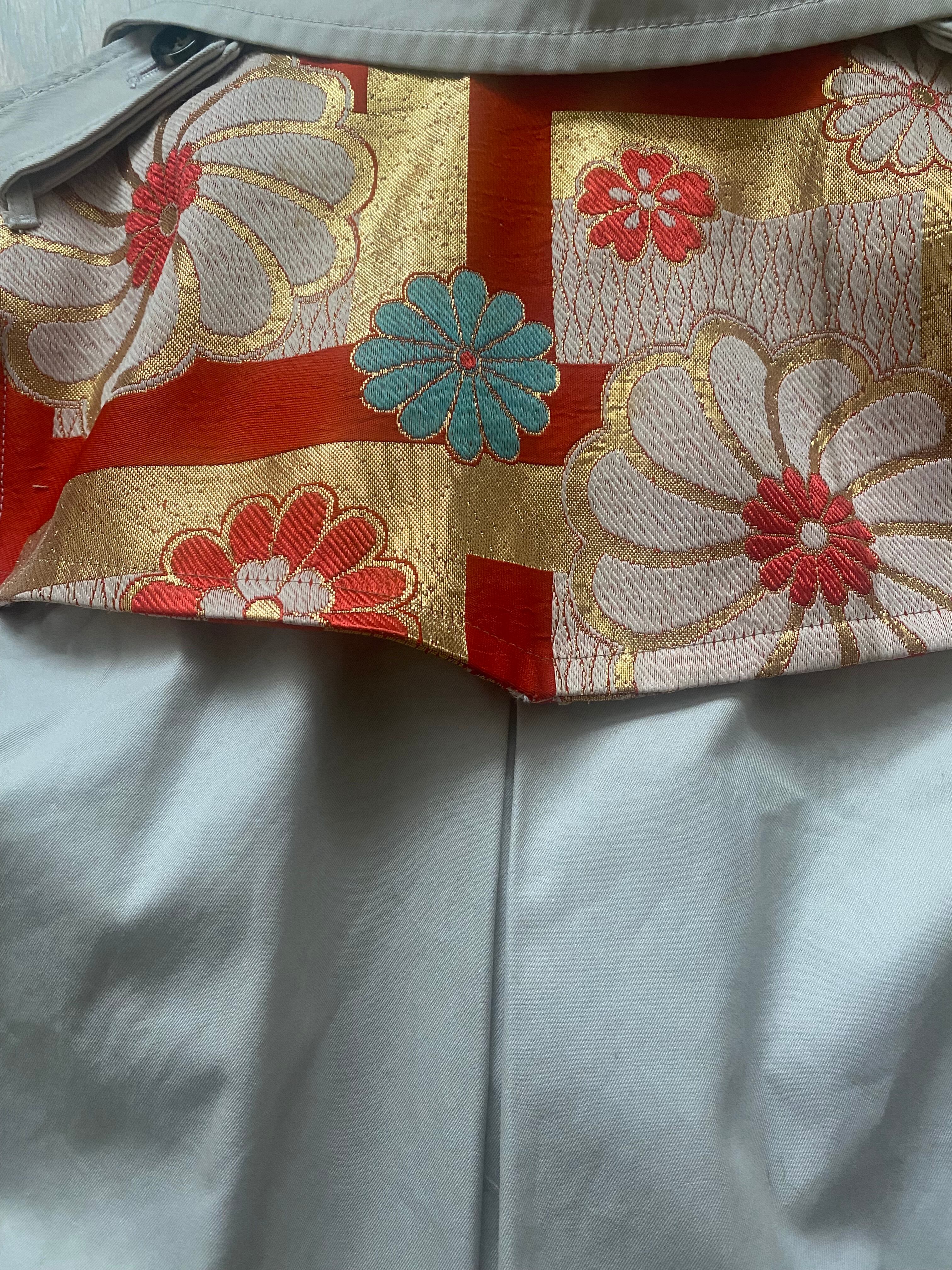 古着のトレンチコートに、伝統的な帯の生地をあしらった、世界にたった一つのリメイクコートです。