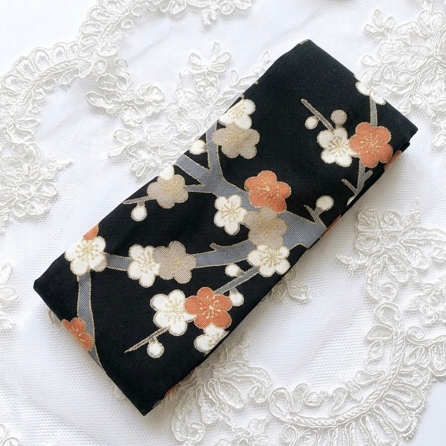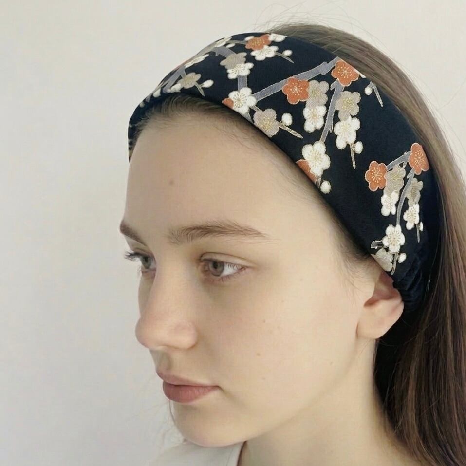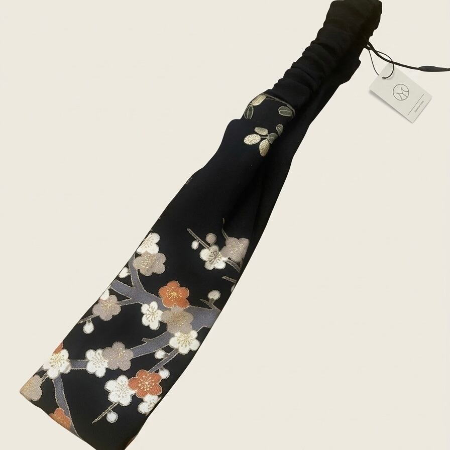 漆黒の地に咲き誇る、凛とした梅の花。上質な正絹の着物生地をリメイクし、現代のライフスタイルに寄り添うヘッドバンドに仕立てました。