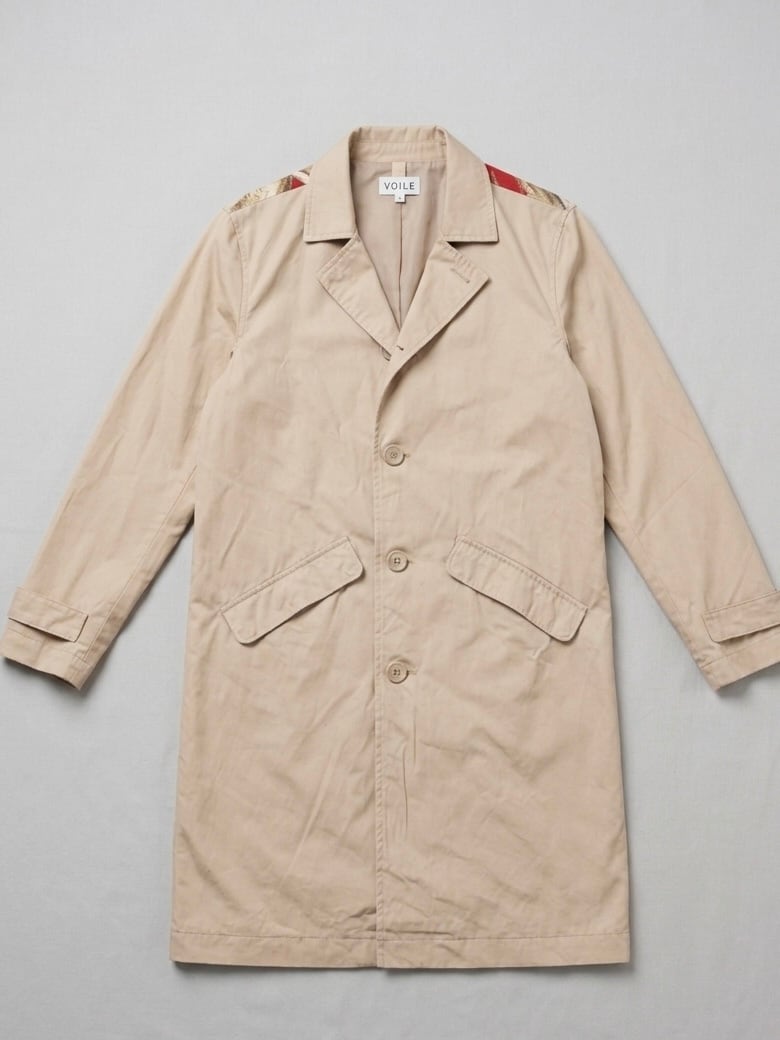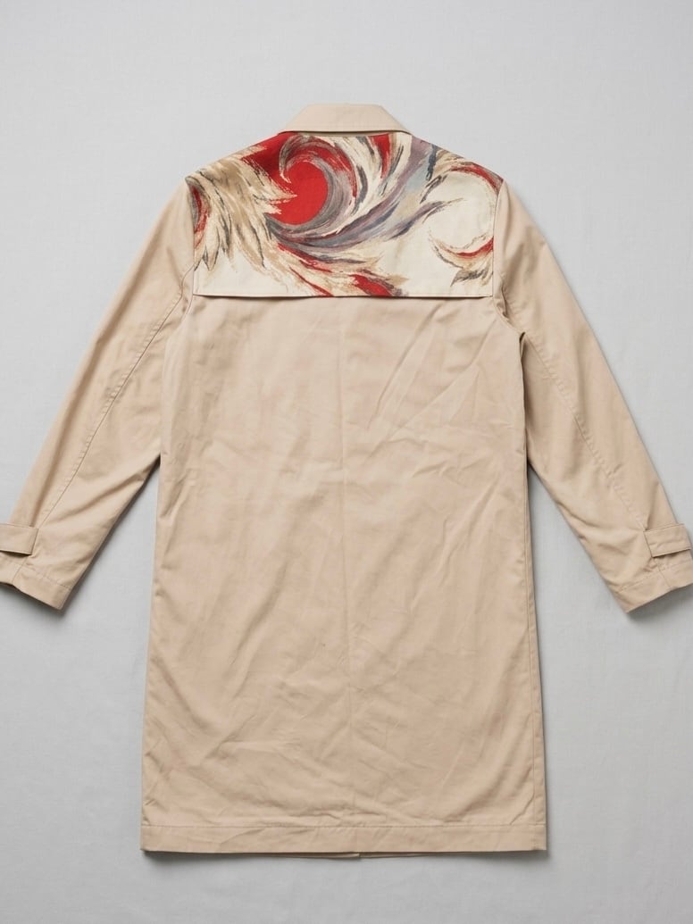 落ち着いたベージュのコットン地に、鮮やかな帯地を大胆に配したリメイクコートです。アンブレラヨーク(背中の切り替え)部分に、波のような力強い曲線を描く帯をあしらい、クラシックなコートに個性を宿しました。
