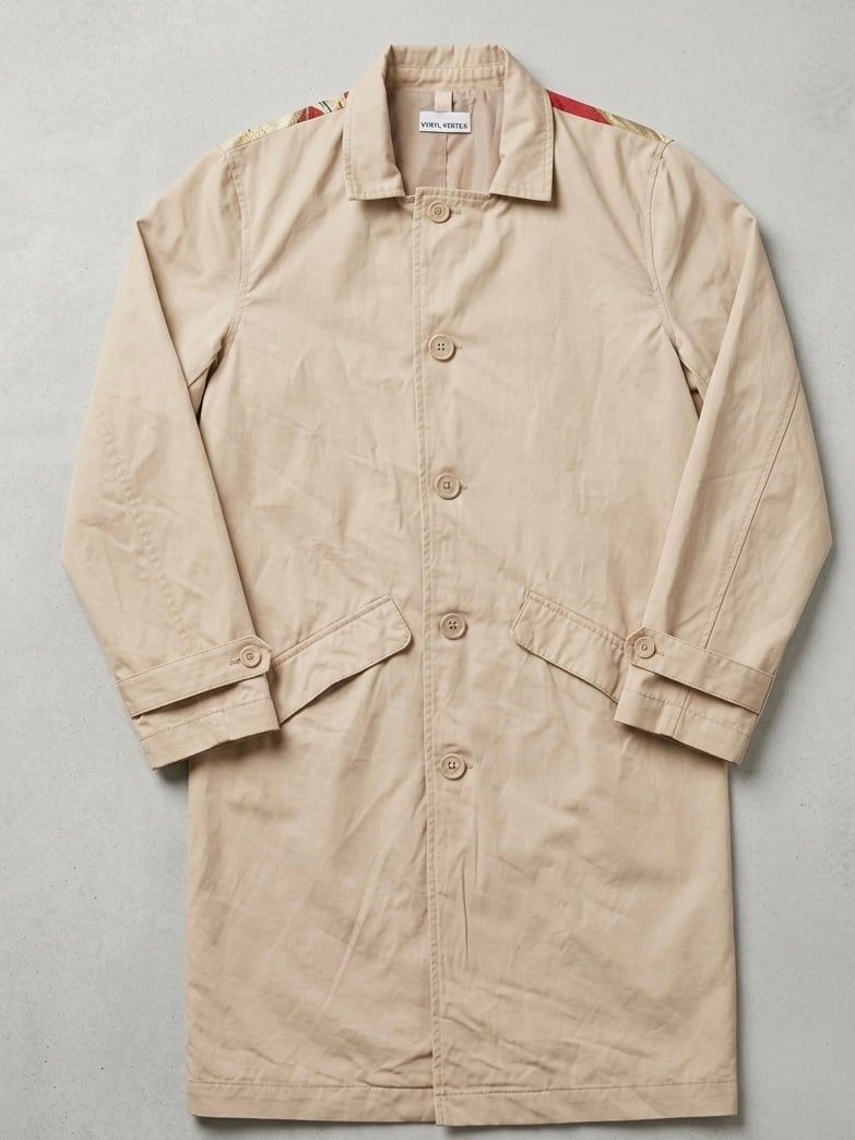 新作2026、着物リメイク、帯リメイク、西陣織、ステンカラーコート、ロングコート、スプリングコート、アップサイクル、サステイナブル、和モダン、一点もの、エシカルファッション、伝統工芸、ベージュ、VivatVeritas、ビバベリタス