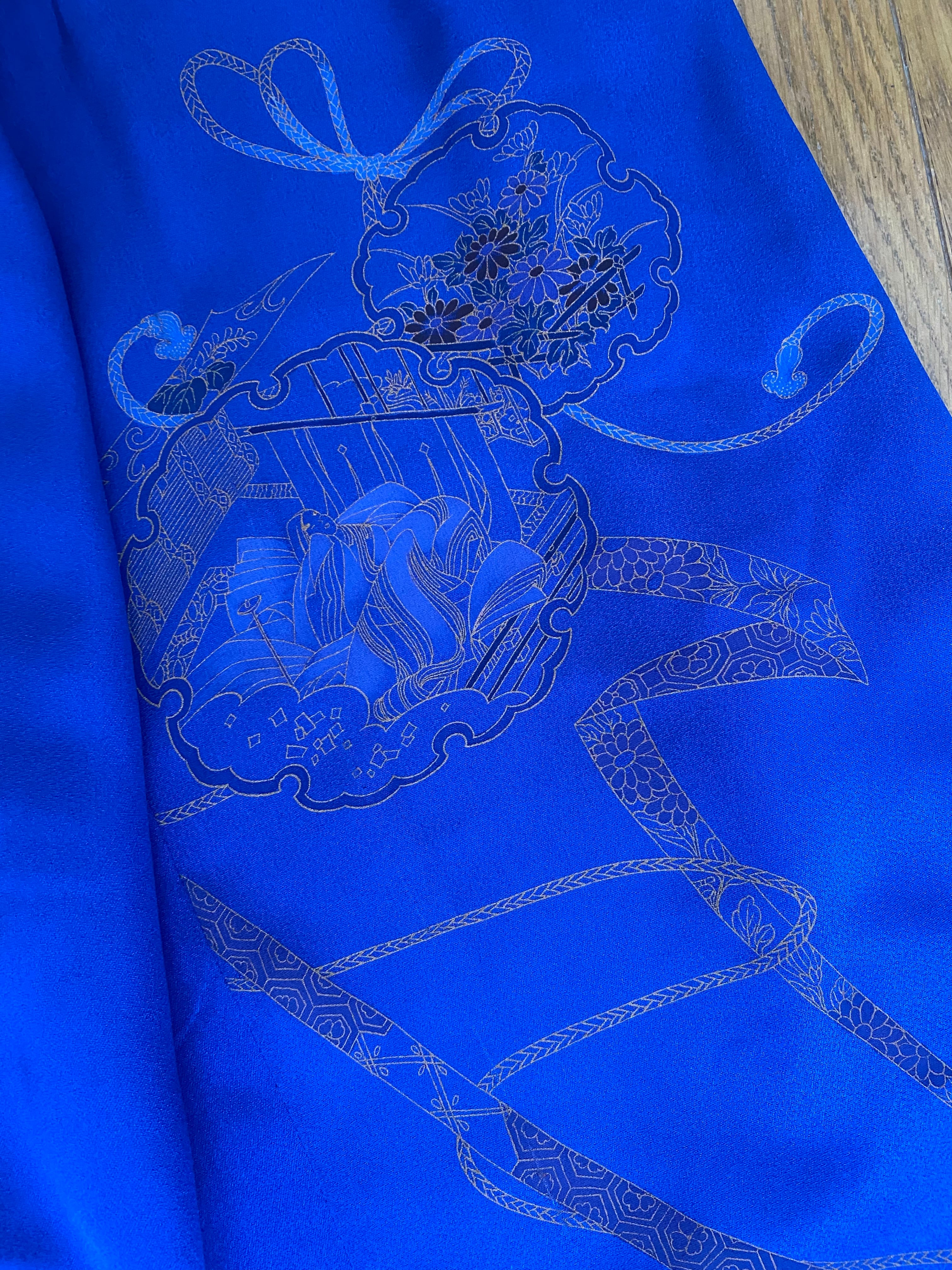 着物リメイクするとすぐに売れてしまう、人気のロイヤルブルー。素敵な着物を蚤の市で見つけたので、ワイドレッグのジャンプスーツにリメイクしました。