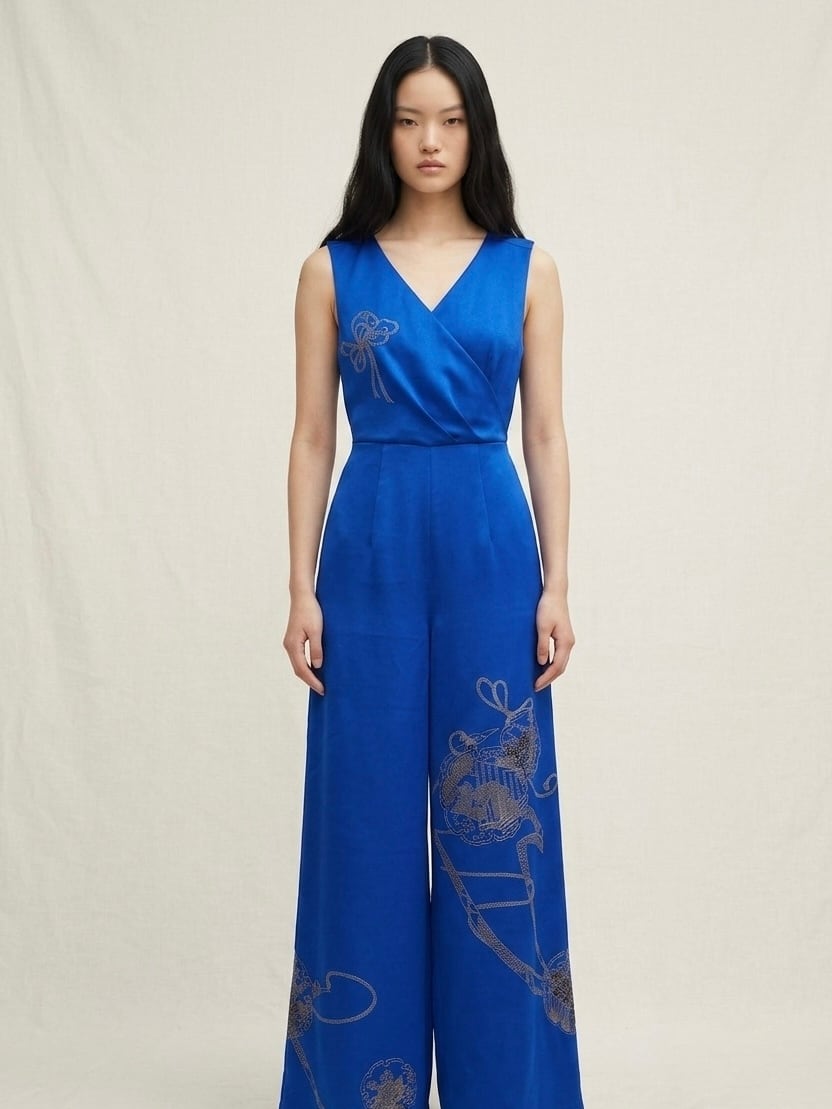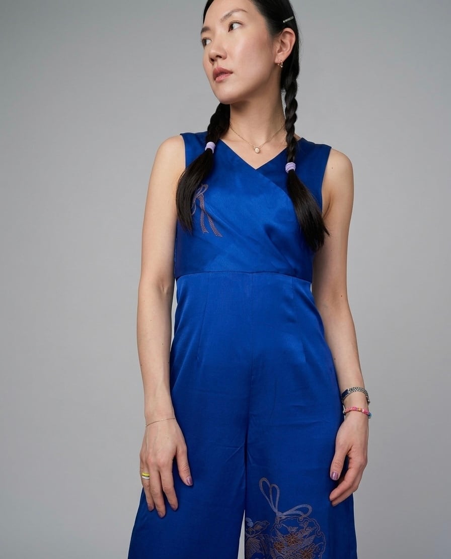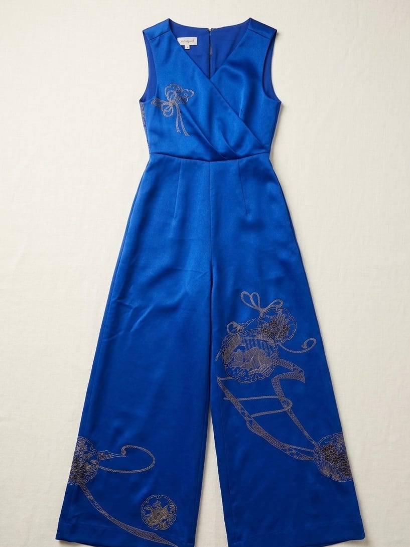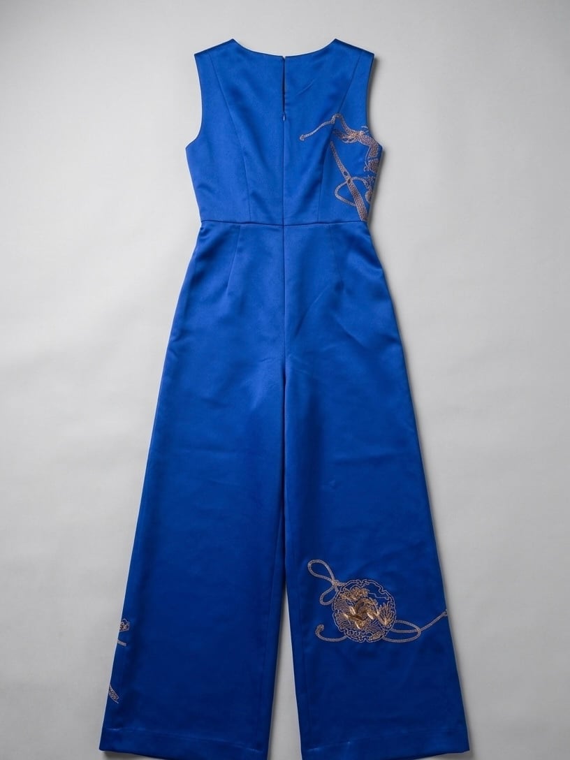 kimono remake, jumpsuit, wide leg pants, royal blue, gold embroidery, silk, one of a kind, upcycled kimono, sustainable fashion, Japanese textile, modern kimono, handmade, Tokyo, auspicious pattern, all-in-one,
