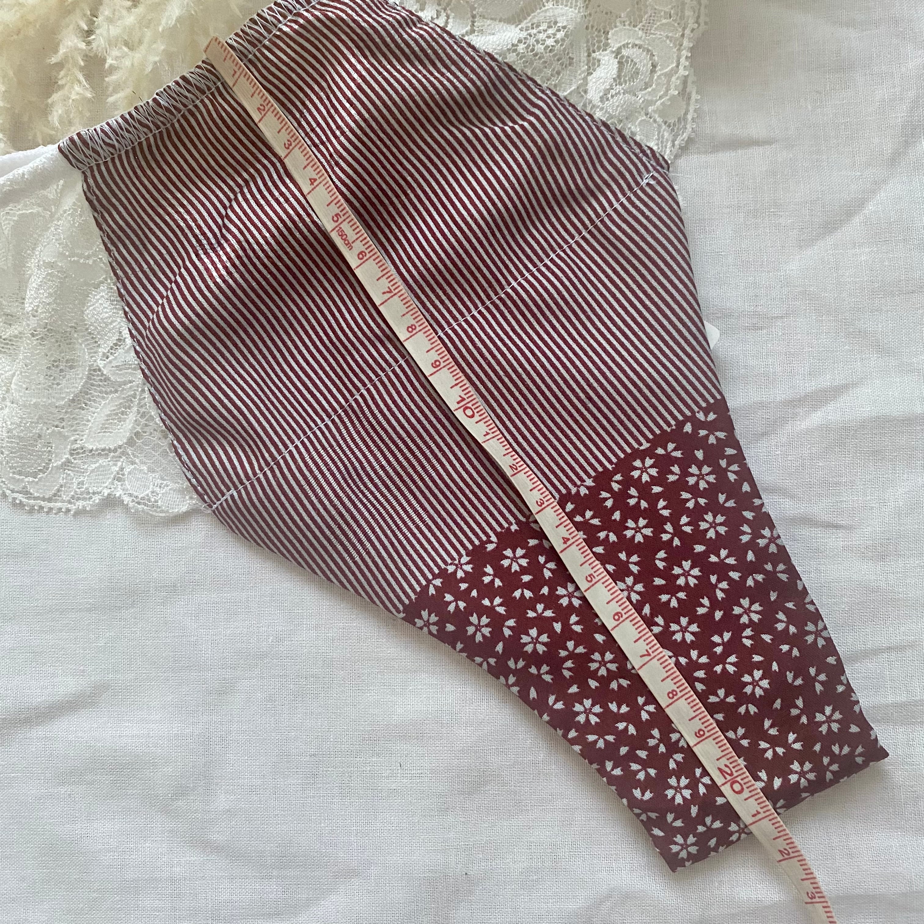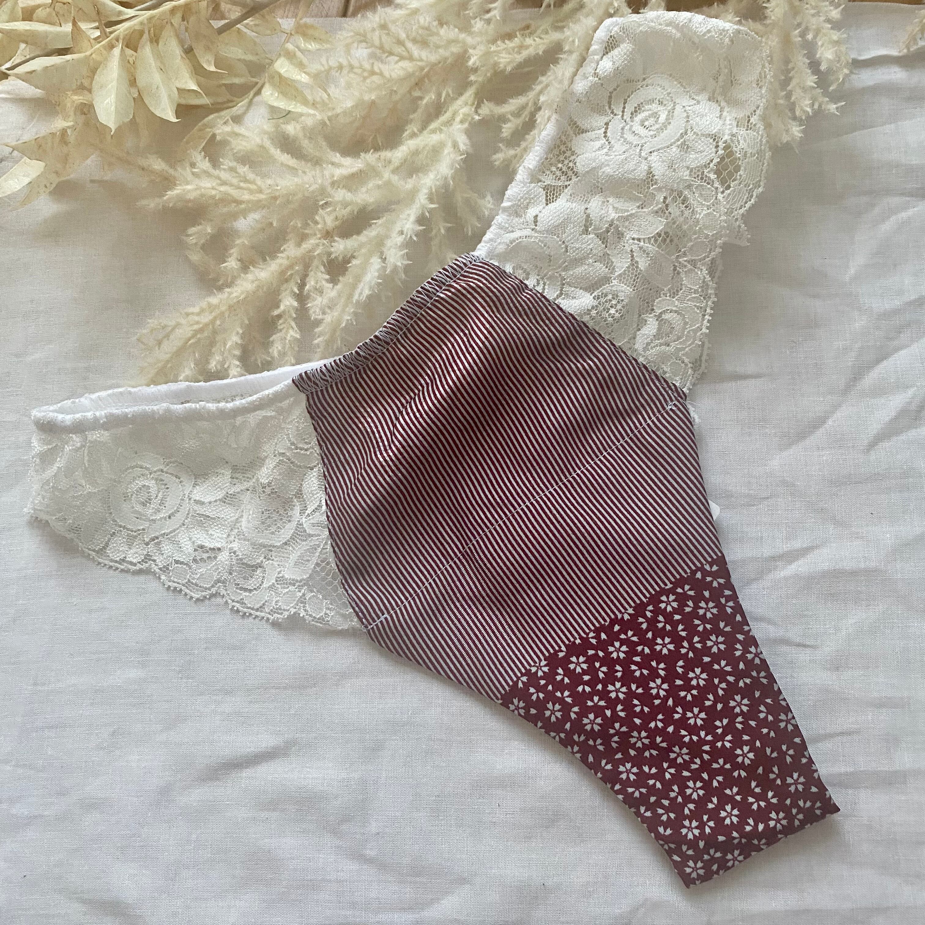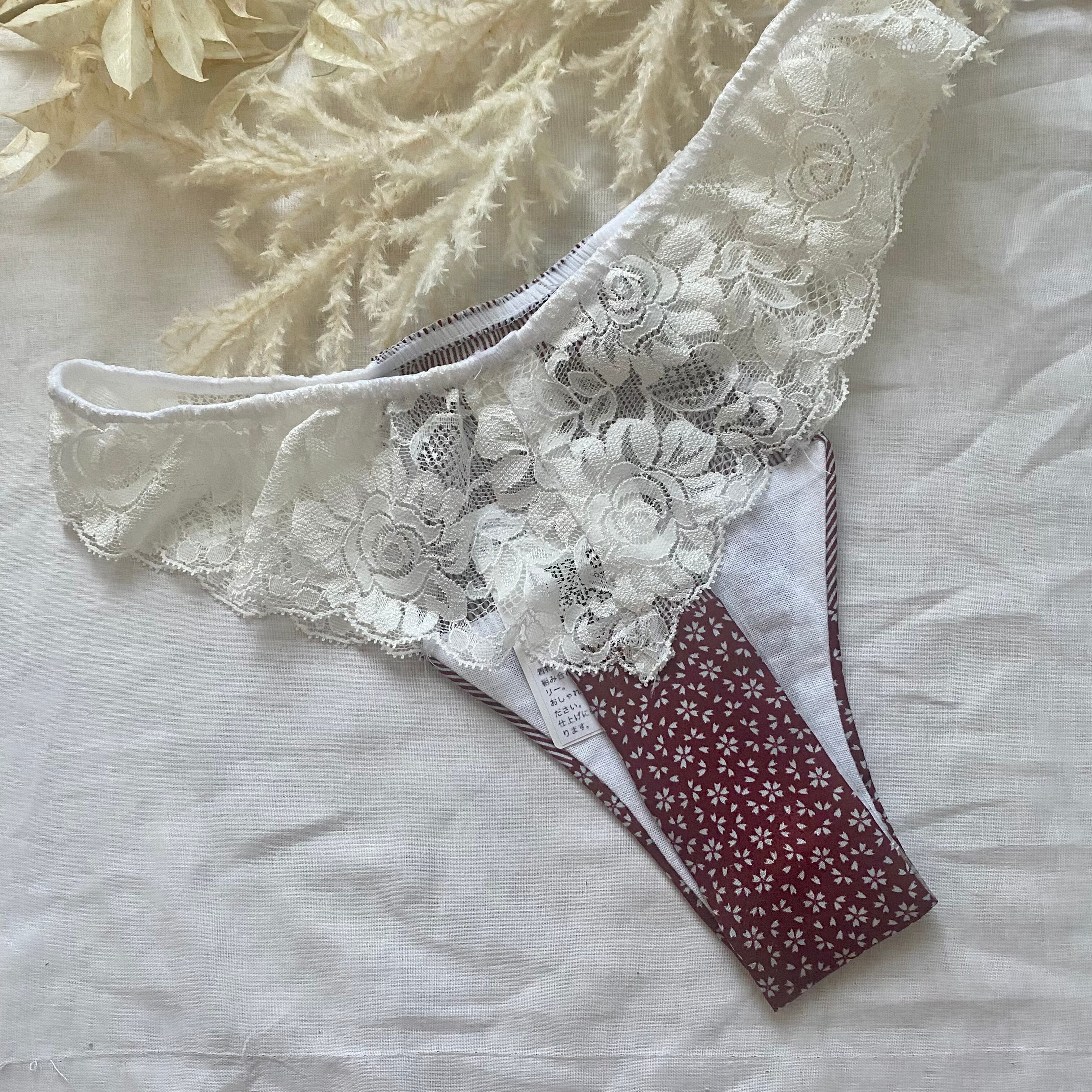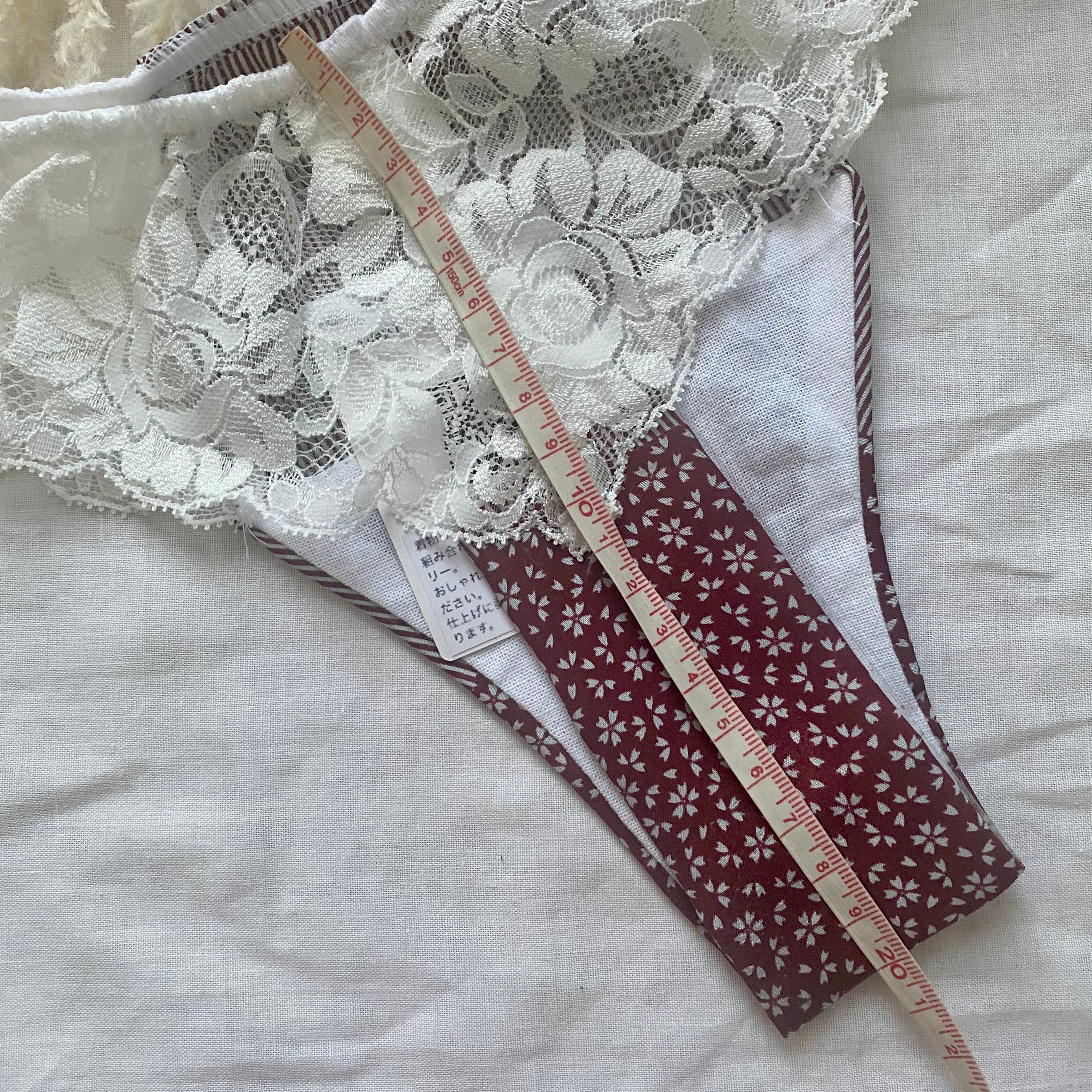 エンジと白で細かい桜柄とストライプが入った着物生地で作ったブラジリアンカットのパンティです。