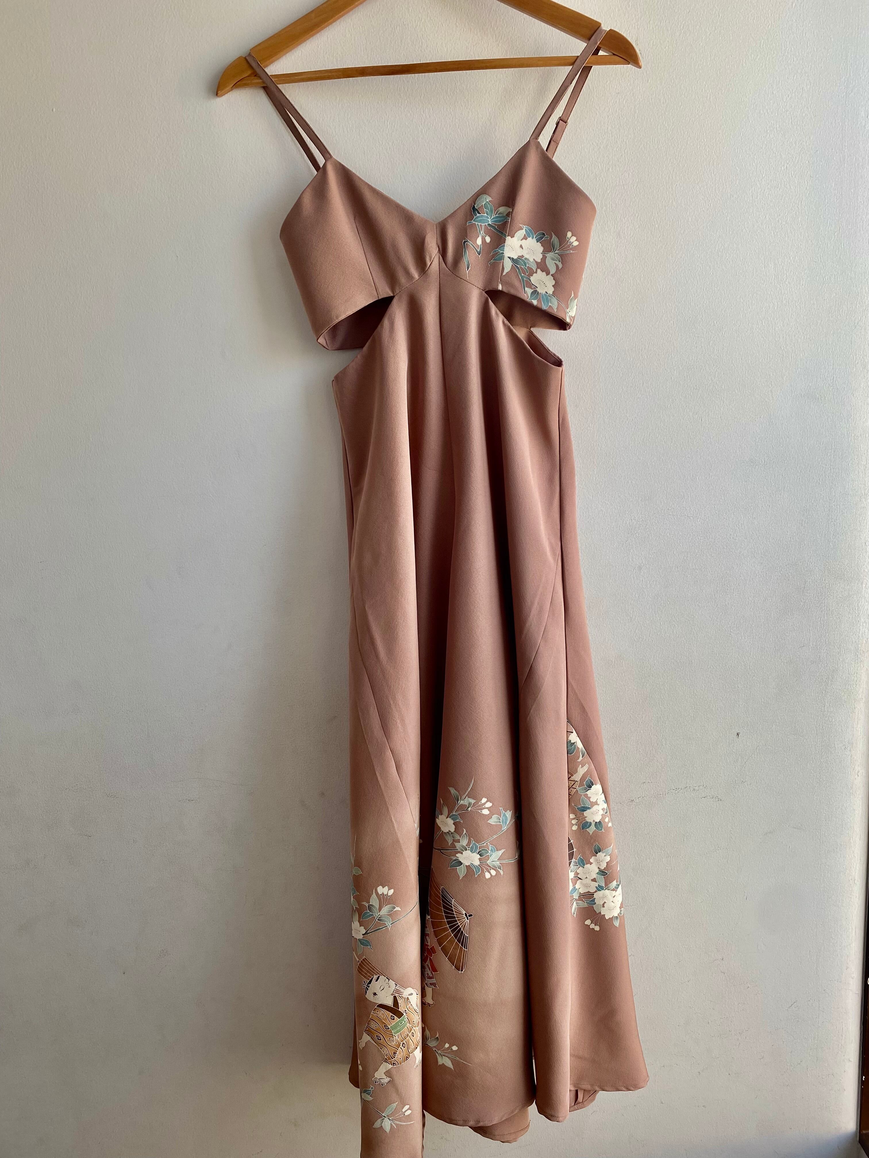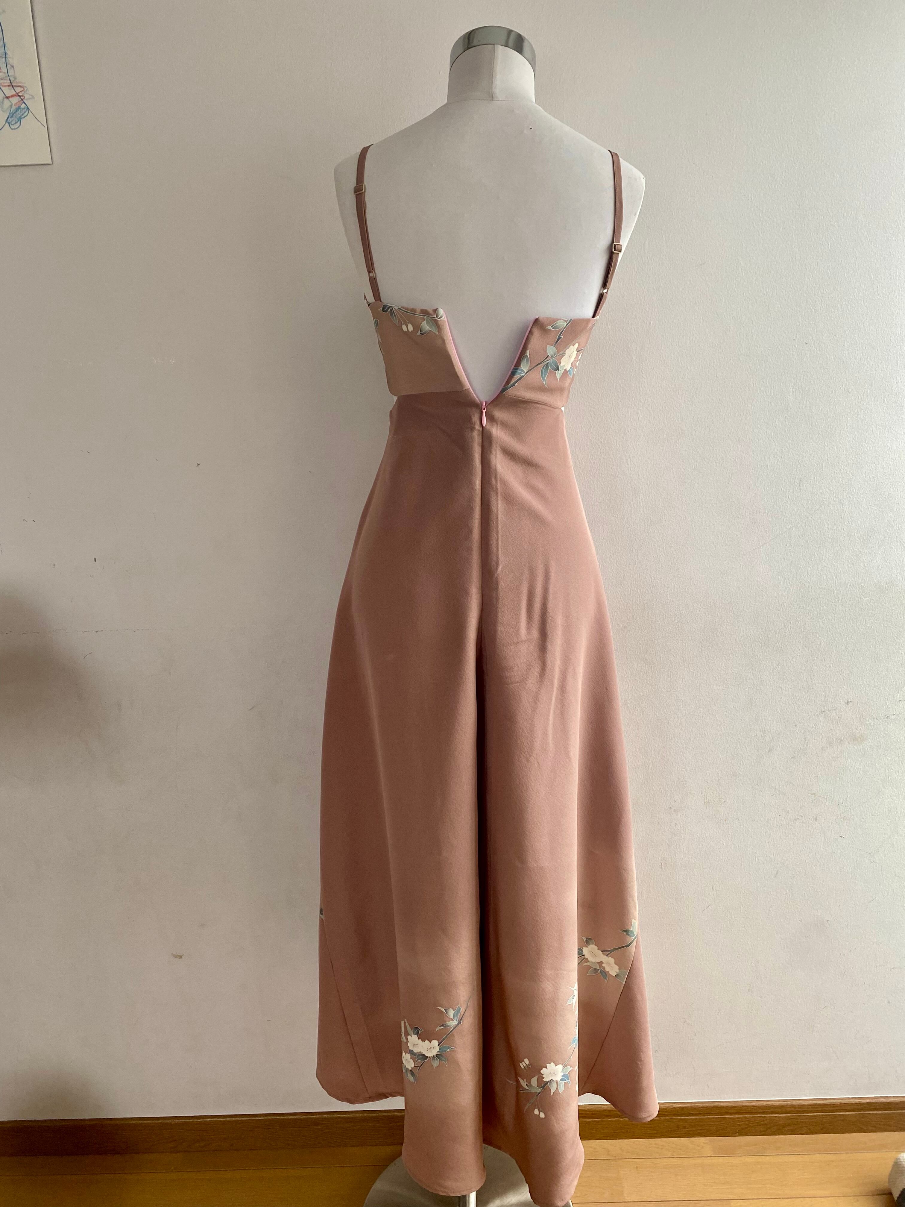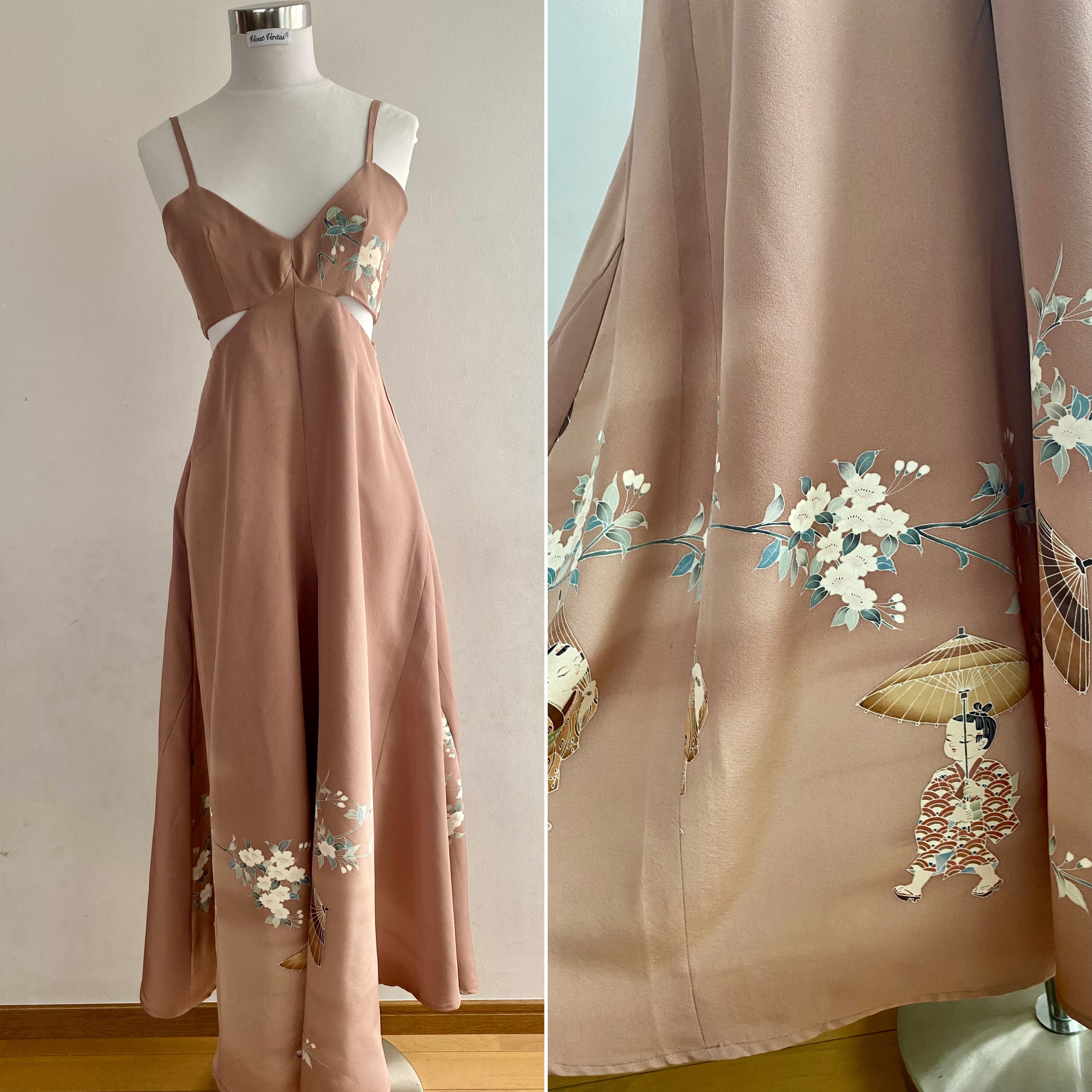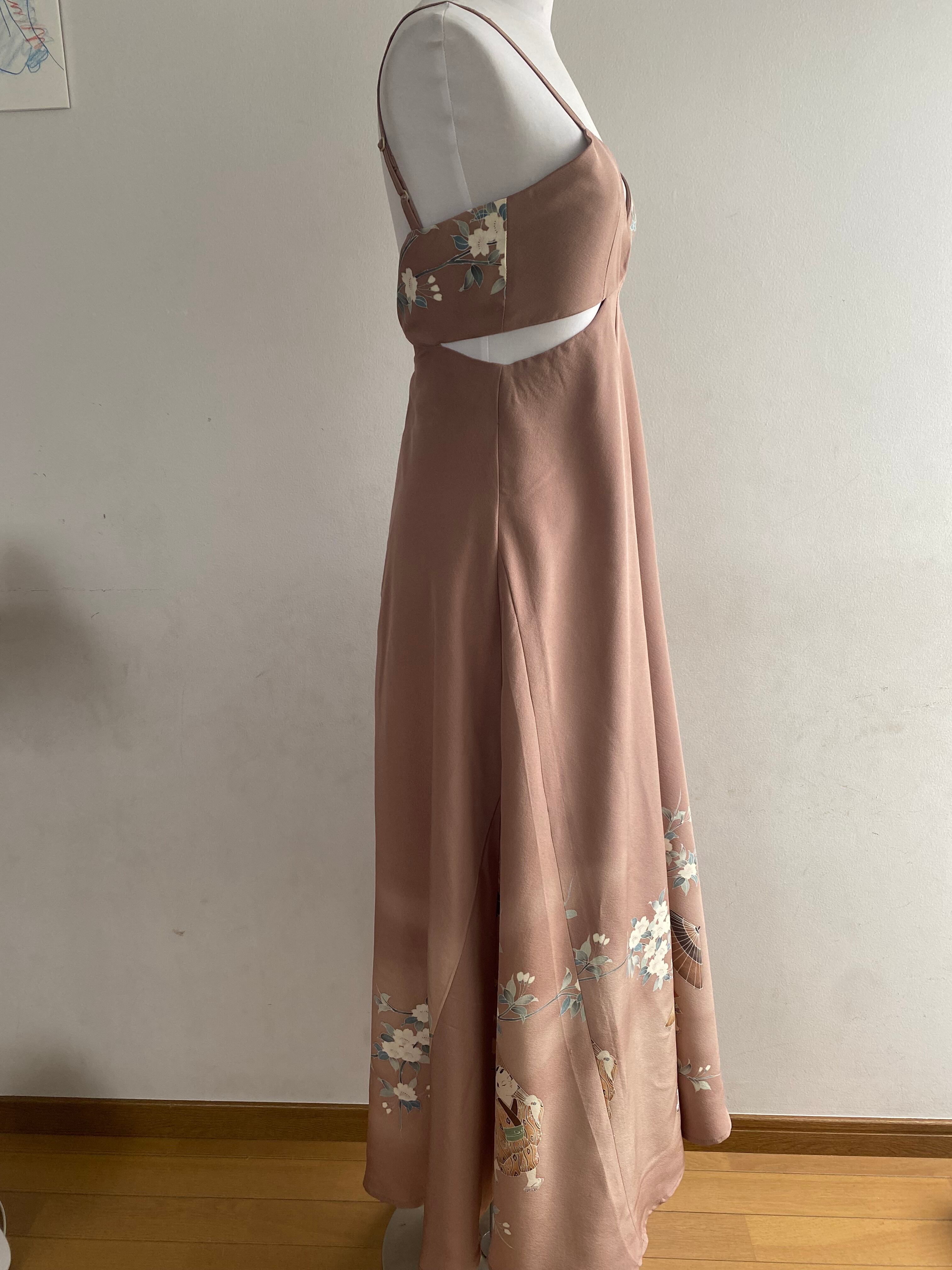 お呼ばれドレス、リボン、パーティー、日本風、Japanese、Kimono、着物、やっこさん、モダン着物、リメイク、シンプル、膝下丈、Aライン、パステル、さわやか、ストラップ、キャミソール、ストラップ調整可能